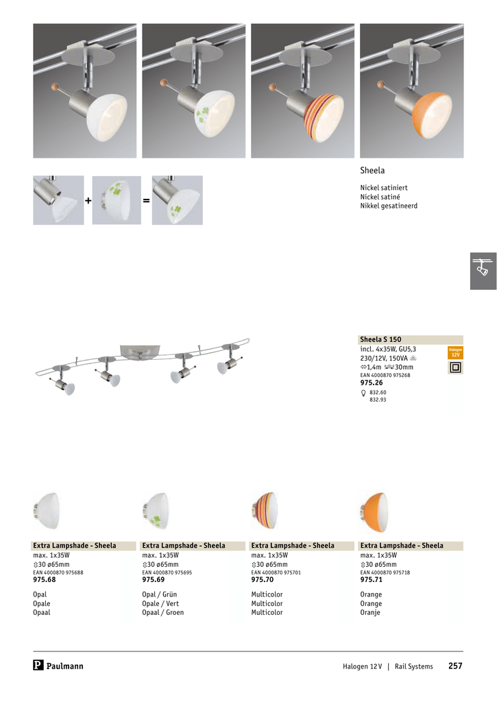 Sheela + Nickel satiniert Nickel satiné Nikkel gesatineerd = Sheela S 150 incl. 4x35W, GU5,3 230/12V, 150VA $ 21,4m £30mm Halogen 12V EAN 4000870 975268 975.26 832.60 832.93 Extra Lampshade - Sheela max. 1x35W 330 ø65mm Extra Lampshade - Sheela max. 1x35W 330 ø65mm Extra Lampshade - Sheela max. 1x35W 330 ø65mm Extra Lampshade - Sheela max. 1x35W 330 ø65mm EAN 4000870 975688 EAN 4000870 975695 EAN 4000870 975701 EAN 4000870 975718 Opal Opale Opaal Opal / Grün Opale / Vert Opaal / Groen Multicolor Multicolor Multicolor Orange Orange Oranje 975.68 975.69 975.70 975.71 Halogen 12 V | Rail Systems 257