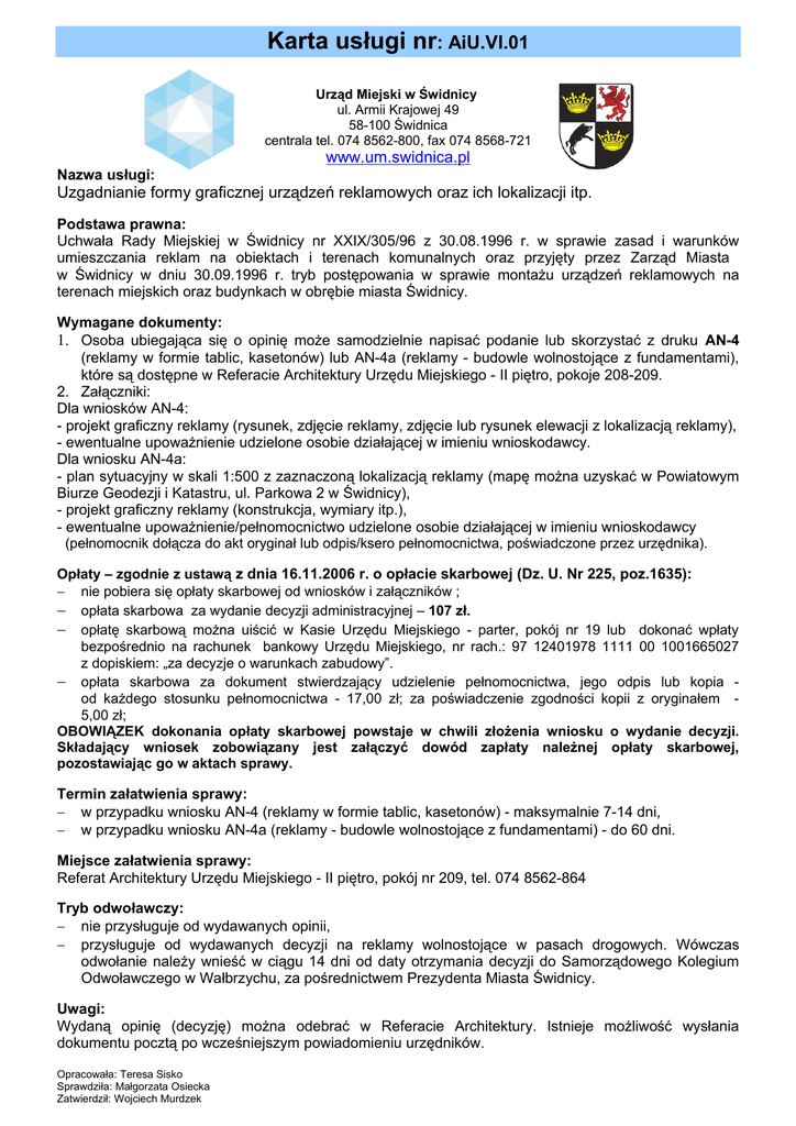Karta usługi nr: AiU.VI.01 Urząd Miejski w Świdnicy ul. Armii Krajowej 49 58-100 Świdnica centrala tel. 074 8562-800, fax 074 8568-721 www.um.swidnica.pl Nazwa usługi: Uzgadnianie formy graficznej urządzeń reklamowych oraz ich lokalizacji itp. Podstawa prawna: Uchwała Rady Miejskiej w Świdnicy nr XXIX/305/96 z 30.08.1996 r. w sprawie zasad i warunków umieszczania reklam na obiektach i terenach komunalnych oraz przyjęty przez Zarząd Miasta w Świdnicy w dniu 30.09.1996 r. tryb postępowania w sprawie montażu urządzeń reklamowych na terenach miejskich oraz budynkach w obrębie miasta Świdnicy. Wymagane dokumenty: 1. Osoba ubiegająca się o opinię może samodzielnie napisać podanie lub skorzystać z druku AN-4 (reklamy w formie tablic, kasetonów) lub AN-4a (reklamy - budowle wolnostojące z fundamentami), które są dostępne w Referacie Architektury Urzędu Miejskiego - II piętro, pokoje 208-209. 2. Załączniki: Dla wniosków AN-4: - projekt graficzny reklamy (rysunek, zdjęcie reklamy, zdjęcie lub rysunek elewacji z lokalizacją reklamy), - ewentualne upoważnienie udzielone osobie działającej w imieniu wnioskodawcy. Dla wniosku AN-4a: - plan sytuacyjny w skali 1:500 z zaznaczoną lokalizacją reklamy (mapę można uzyskać w Powiatowym Biurze Geodezji i Katastru, ul. Parkowa 2 w Świdnicy), - projekt graficzny reklamy (konstrukcja, wymiary itp.), - ewentualne upoważnienie/pełnomocnictwo udzielone osobie działającej w imieniu wnioskodawcy (pełnomocnik dołącza do akt oryginał lub odpis/ksero pełnomocnictwa, poświadczone przez urzędnika). Opłaty – zgodnie z ustawą z dnia 16.11.2006 r. o opłacie skarbowej (Dz. U. Nr 225, poz.1635): − nie pobiera się opłaty skarbowej od wniosków i załączników ; − opłata skarbowa za wydanie decyzji administracyjnej – 107 zł. − opłatę skarbową można uiścić w Kasie Urzędu Miejskiego - parter, pokój nr 19 lub dokonać wpłaty bezpośrednio na rachunek bankowy Urzędu Miejskiego, nr rach.: 97 12401978 1111 00 1001665027 z dopiskiem: „za decyzje o warunkach zabudowy”. − opłata skarbowa za dokument stwierdzający udzielenie pełnomocnictwa, jego odpis lub kopia od każdego stosunku pełnomocnictwa - 17,00 zł; za poświadczenie zgodności kopii z oryginałem 5,00 zł; OBOWIĄZEK dokonania opłaty skarbowej powstaje w chwili złożenia wniosku o wydanie decyzji. Składający wniosek zobowiązany jest załączyć dowód zapłaty należnej opłaty skarbowej, pozostawiając go w aktach sprawy. Termin załatwienia sprawy: − w przypadku wniosku AN-4 (reklamy w formie tablic, kasetonów) - maksymalnie 7-14 dni, − w przypadku wniosku AN-4a (reklamy - budowle wolnostojące z fundamentami) - do 60 dni. Miejsce załatwienia sprawy: Referat Architektury Urzędu Miejskiego - II piętro, pokój nr 209, tel. 074 8562-864 Tryb odwoławczy: − nie przysługuje od wydawanych opinii, − przysługuje od wydawanych decyzji na reklamy wolnostojące w pasach drogowych. Wówczas odwołanie należy wnieść w ciągu 14 dni od daty otrzymania decyzji do Samorządowego Kolegium Odwoławczego w Wałbrzychu, za pośrednictwem Prezydenta Miasta Świdnicy. Uwagi: Wydaną opinię (decyzję) można odebrać w Referacie Architektury. Istnieje możliwość wysłania dokumentu pocztą po wcześniejszym powiadomieniu urzędników. Opracowała: Teresa Sisko Sprawdziła: Małgorzata Osiecka Zatwierdził: Wojciech Murdzek