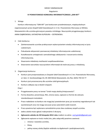 SZKOŁY GIMNAZJALNE Regulamin IV POWIATOWEGO KONKURSU INFORMATYCZNEGO „GIM-BIT” 1. Wstęp: Konkurs informatyczny "GIM-BIT" jest konkursem przedmiotowym, międzyszkolnym organizowanym przez Zespół Szkół Zawodowych nr 2 im. Powstaoców Warszawy w Miosku Mazowieckim dla uczniów gimnazjum powiatu mioskiego. Nauczyciele przygotowujący konkurs: ANNA DĄBROWSKA, KATARZYNA KUPIDURA – OSTROWSKA. 2. Cele konkursu: Zainteresowanie uczniów praktycznym wykorzystaniem wiedzy informatycznej w życiu codziennym. Pobudzanie aktywności poznawczej młodzieży informatycznie uzdolnionej. Kształtowanie umiejętności samodzielnego zdobywania i rozszerzania wiedzy informatycznej. Stwarzanie młodzieży możliwości współzawodnictwa. Stworzenie warunków nauczycielom informatyki do twórczej pracy z młodzieżą. 3. Organizacja konkursu: Konkurs jest przeprowadzany w Zespole Szkół Zawodowych nr 2 im. Powstaoców Warszawy, ul. Gen. K. Sosnkowskiego 43, 05-300 Miosk Mazowiecki, tel./fax: (025) 759 34 77 Konkurs jest przeznaczony dla uczniów szkół gimnazjalnych. Konkurs odbywa się w dwóch etapach. Etap I Przygotowanie pracy na temat "Uroki mojej okolicy/miejscowości". Forma dowolna: prezentacja, film, strona www, zapisane w formie do odczytu standardowymi metodami. Prace nadesłane na konkurs nie mogą byd powieleniem prac już wcześniej nagrodzonych lub wyróżnionych oraz nie mogą naruszad praw autorskich osób trzecich. Praca powinna byd wykonana samodzielnie przez dwu osobowy zespół uczniów. Jedna szkoła może zgłosid maksymalnie 3 drużyny. Zgłoszenie udziału do 30 listopada 2012 roku mailem na adres [email protected] Zgłoszenie wpisane w treści maila (nie, jako załącznik) powinno zawierad: o imiona i nazwiska uczniów, o klasę, o pełną nazwę szkoły (będzie widniała na dyplomach i podziękowaniach), o imię i nazwisko opiekuna, o dane kontaktowe opiekuna (telefon lub mail). Prace na płycie CD opisanych (imiona i nazwiska uczniów, nazwa i adres szkoły, imię i nazwisko nauczyciela - opiekuna) należy dostarczyd do 28 lutego 2013 roku, osobiście składając w sekretariacie szkoły ZSZ nr 2 w Miosku Mazowieckim lub wysład na adres szkoły z dopiskiem "Konkurs informatyczny GIM-BIT". Kryteria oceny prac: pomysłowośd autorów poprawnośd techniczna poprawnośd merytoryczna łatwośd obsługi zastosowane środki wyrazu (film, dźwięk, obrazy) estetyka wykonania (łącznie z estetyką opakowania) krótki opis pracy, wymagania techniczne i programowe. Autorzy prac zakwalifikowanych do II etapu zostaną poinformowani drogą mailową bądź telefonicznie do 12 marca 2013 r. Etap II Quiz z ogólnej wiedzy informatycznej, który odbędzie się w Zespole Szkół nr 2 im. Powstaoców Warszawy, ul. Gen. K. Sosnkowskiego 43, 05-300 Miosk Mazowiecki, 22 marca 2013 o godz. 11:00. W sytuacji, kiedy dwie drużyny otrzymają taką samą ilośd punktów, organizatorzy przewidują dogrywkę. Po quizie krótka prezentacja prac oraz słodki poczęstunek. 4. Nagrody: Ogłoszenie wyników i wręczenie nagród oraz prezentacja przez autorów nagrodzonych prac odbędzie się dnia 22 marca 2013 o godz. 12:30 Przy ustaleniu wyników konkursu są sumowane punkty z I i II etapu. Nagrody otrzymają trzy drużyny, które uzbierają największą ilośd punktów z I i II etapu. Pozostałe ciekawsze prace mogą zostad wyróżnione. Drobne upominki otrzymają wszyscy uczestnicy II etapu. Pisemne podziękowania dla nauczycieli przygotowujących uczestników konkursu. W razie zmiany terminu, opiekun każdej zgłoszonej grupy zostanie poinformowany telefonicznie lub mailem indywidualnie.