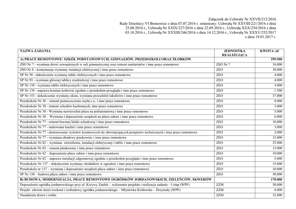 Załącznik do Uchwały Nr XXVII/212/2016 Rady Dzielnicy VI Bronowice z dnia 07.07.2016 r. zmieniony: Uchwałą Nr XXVIII/221/2016 z dnia 25.08.2016 r., Uchwałą Nr XXIX/227/2016 z dnia 22.09.2016 r., Uchwałą XXX/234/2016 z dnia 03.10.2016 r., Uchwałą Nr XXXIII/246/2016 z dnia 14.12.2016 r., Uchwałą Nr XXXV/252/2017 z dnia 19.01.2017 r. NAZWA ZADANIA JEDNOSTKA REALIZUJĄCA KWOTA /zł/ A) PRACE REMONTOWE: SZKÓŁ PODSTAWOWYCH, GIMNAZJÓW, PRZEDSZKOLI ORAZ ŻŁOBKÓW ZSO Nr 7 - wymiana drzwi zewnętrznych w sali gimnastycznej oraz remont sanitariatów i inne prace remontowe ZSO Nr 8 - kontynuacja wymiany instalacji elektrycznej i inne prace remontowe SP Nr 50 - dokończenie wymiany tablic elektrycznych i inne prace remontowe SP Nr 93 - wymiana głównej tablicy rozdzielczej i inne prace remontowe ZSO Nr 7 ZEO ZEO ZEO SP Nr 138 - wymiana tablic elektrycznych i inne prace remontowe SP Nr 138 - naprawa komina kotłowni zgodnie z protokołem przeglądu i inne prace remontowe SP Nr 153 - dokończenie wymiany okien, wymiana przeszkleń luksferów i inne prace remontowe Przedszkole Nr 38 – remont pomieszczenia węzła c.o. i inne prace remontowe Przedszkole Nr 38 - remont schodów kuchennych, inne prace remontowe Przedszkole Nr 38 - Wymiana nawierzchni placu na poliuretanową i inne prace remontowe ZEO ZEO ZEO ZEO ZEO ZEO 5.000 1.500 37.000 8.000 3.000 5.000 Przedszkole Nr 38 – Wymiana i doposażenie urządzeń na placu zabaw i inne prace remontowe Przedszkole Nr 77 - remont bocznej klatki schodowej i inne prace remontowe Przedszkole Nr 77 - malowanie kuchni i inne prace remontowe Przedszkole Nr 77 - dostosowanie wylotów kominowych do obowiązujących przepisów technicznych i inne prace remontowe Przedszkole Nr 77 - wymiana obudowy piaskownic i inne prace remontowe Przedszkole Nr 82 – wymiana oświetlenia, instalacji elektrycznej i tablic i inne prace remontowe ZEO ZEO ZEO ZEO ZEO ZEO 8.000 10.000 3.000 2.000 15.000 25.000 Przedszkole Nr 82 – remont piaskownic i inne prace remontowe Przedszkole Nr 82 – doposażenie placu zabaw i inne prace remontowe Przedszkole Nr 82 – naprawa instalacji odgromowej zgodnie z protokołem przeglądu i inne prace remontowe Przedszkole Nr 137 – dokończenie wymiany chodników w ogrodzie i inne prace remontowe Przedszkole nr 137 – wymiana i doposażenie urządzeń placu zabaw i inne prace remontowe SP Nr 138 – budowa placu zabaw i inne prace remontowe ZEO ZEO ZEO ZEO ZEO ZEO 15.000 10.000 5.000 15.000 10.000 50.000 ZZM ZZM ZZM 170.000 50.000 8.000 32.000 B) BUDOWA, MODERNIZACJA, PRACE REMONTOWE OGRÓDKÓW JORDANOWSKICH, ZIELEŃCÓW, SKWERÓW Doposażenie ogródka jordanowskiego przy ul. Krzywy Zaułek – wykonanie projektu i realizacja zadania – I etap (WPF) Projekt siłowni street workout i rozbudowy ogródka jordanowskiego – Młynówka Królewska – Drzymały (WPF) Nasadzenia drzew i roślin 299.500 34.000 30.000 4.000 4.000 Przebudowa schodów w parku Młynówka Królewska przy przejściu dla pieszych przez ul. Przybyszewskiego – dokończenie projektu i realizacja wg pozwolenia na budowę C) BUDOWA, MODERNIZACJA, PRACE REMONTOWE MIEJSKIEJ INFRASTRUKTURY DROGOWEJ W ZAKRESIE DRÓG WSKAZANYCH W WYKAZIE, O KTÓRYM MOWA W § 66 UST.1 STATUTU Budowa przejścia na wały rzeki Rudawa (WPF) Przebudowa drogi wewnętrznej przy ul Rydla 18-22 - wykonanie projektu (WPF) ZIKiT ZIKiT ZIKiT 115.000 48.000 Dobudowa oświetlenia ul. Machaya (WPF) Dobudowa oświetlenia na ul. Palmowej (WPF) Wyniesienie przejścia dla pieszych na ul. Wesele (WPF) Dobudowa oświetlenia chodnika stanowiącego dojście do bloku 71 przy ul. Racheli Dobudowa wysięgnika na ul. Przesmyk wraz z oprawą typu LED na istniejącym słupie Remonty dróg, chodników i oświetlenia: Remont ul. Machaya, Remont pobocza z wjazdami na ul. Katowickiej na odcinku od ul. Boya- Żeleńskiego do posesji nr 12c, Remont tarczy skrzyżowania ul. Przybyszewskiego z ul. Zapolskiej, Remont chodnika na ul. Katowickiej na odcinku od posesji nr 36 do posesji nr 48 włącznie, Remont zatoki postojowej na ul. Katowickiej usytuowanej przed wjazdem do Szkoły Podstawowej nr 50, Wykonanie nakładki asfaltowej na ul. Złoty Róg Zatoki parkingowe przy ul. Bronowickiej (II etap) ZIKiT ZIKiT ZIKiT ZIKiT ZIKiT ZIKiT 45.000 36.000 80.900 19.000 4.000 402.702 ZIKiT 45.000 D) BUDOWA, MODERNIZACJA, PRACE REMONTOWE OSIEDLOWEJ INFRASTRUKTURY SPORTOWEJ I REKREACYJNEJ E) LOKALNE WYDARZENIA: OŚWIATOWE, KULTURALNE, SPORTOWE I REKREACYJNE Organizacja imprez, uroczystości, konkursów i innych wydarzeń lokalnych dla całej dzielnicy z zakresu kultury. 80.000 795.602 0 96.200 12.000 Integracyjne Dni Bronowic Zeszyty historyczno-literackie CK Dworek Białoprądnicki CM im. H. Jordana CM im. H. Jordana Projekty edukacyjne Organizacja wernisażu i druk katalogu na wystawę malarstwa z okazji Dni Bronowic SP Nr 50 – Osadzanie chochoła SP Nr 50 – Święto ul. Tetmajera SP Nr 50 – Korowód Bronowicki SP nr 50 – Wielkanoc w Bronowicach CM im H Jordana CM im. H Jordana ZEO ZEO ZEO ZEO SP Nr 138 – Międzyszkolny Dzień Dziecka SP Nr 138 – Międzyszkolny Konkurs Palm ZEO ZEO 7.000 1.000 SP Nr 138 – Międzyszkolny konkurs Szopek ZEO 900 SP Nr 153 – Dzielnicowa Olimpiada Sześciolatka SP Nr 138 – Międzyszkolny Konkurs „Brzechwałki” SP Nr 153 – Międzyszkolny Konkurs pt. „Jestem genialnym dzieckiem, czyli pokaż co potrafisz?” ZEO ZEO ZEO 800 1.000 2.000 25.000 3.000 2.000 3.000 1.000 12.000 3.000 1.000 SP Nr 93 – Międzyszkolna gra terenowa pt. „Śladami Młodej Polski w Bronowicach” ZSO N 8 – organizacja zawodów sportowych w siatkówce ZSO Nr 8 - Cykl zawodów sportowych dla dzieci i młodzieży „ od przedszkolaka do starszaka” Wykonanie pomnika rtm. Witolda Pileckiego patrona ulicy Organizacja kina letniego w amfiteatrze F) PROGRAM POPRAWY BEZPIECZEŃSTWA DLA GMINY MIEJSKIEJ KRAKÓW „BEZPIECZNY KRAKÓW” Komenda Miejska Państwowej Straży Pożarnej (JRG3) – zestaw ratownika medy