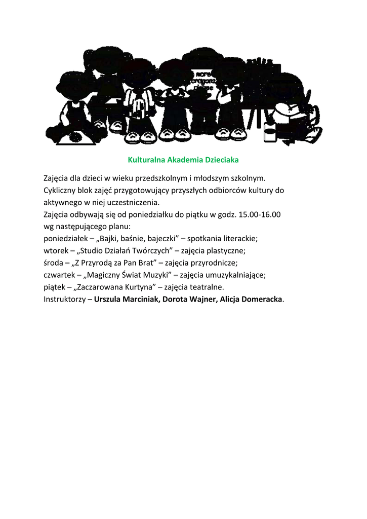 Kulturalna Akademia Dzieciaka Zajęcia dla dzieci w wieku przedszkolnym i młodszym szkolnym. Cykliczny blok zajęć przygotowujący przyszłych odbiorców kultury do aktywnego w niej uczestniczenia. Zajęcia odbywają się od poniedziałku do piątku w godz. 15.00-16.00 wg następującego planu: poniedziałek – „Bajki, baśnie, bajeczki” – spotkania literackie; wtorek – „Studio Działań Twórczych” – zajęcia plastyczne; środa – „Z Przyrodą za Pan Brat” – zajęcia przyrodnicze; czwartek – „Magiczny Świat Muzyki” – zajęcia umuzykalniające; piątek – „Zaczarowana Kurtyna” – zajęcia teatralne. Instruktorzy – Urszula Marciniak, Dorota Wajner, Alicja Domeracka.