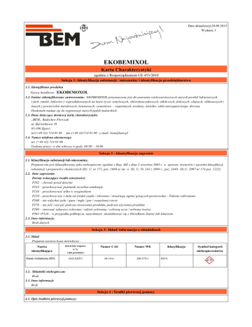 Data aktualizacji;28.09.2015 Wydanie 3 EKOBEMIXOL Karta Charakterystyki zgodnie z Rozporządzeniem UE 453/2010 Sekcja 1: Identyfikacja substancji / mieszaniny i identyfikacja przedsiębiorstwa 1.1. Identyfikator produktu Nazwa handlowa: EKOBEMOXOL 1.2. Istotne zidentyfikowane zastosowania: EKOBEMIXOL przeznaczony jest do usuwania wielowarstwowych starych powłok lakierniczych ( farb, emalii, lakierów ) wyprodukowanych na bazie żywic winylowych, chlorokauczukowych, alkilowych, ftalowych, olejnych, silikonowych i innych z powierzchni metalowych, betonowych, cementowo – wapiennych, terakoty, lastriko, szkła nieorganicznego, drewna. Doskonale nadaje się do regeneracji starych pędzli malarskich. 1.3. Dane dotyczące dostawcy karty charakterystyki: ,,BEM,, Radosław Florczak ul. Barwnikowa 10 95-100 Zgierz tel.(+48 42) 714 01 00 fax.(+48 42)714 01 00 e-mail: [email protected] 1.4. Numer telefonu alarmowego tel. (+48 42) 714 01 00 Godziny pracy: w dni robocze w godz. 08:00 – 16.00 Sekcja 2 : Identyfikacja zagrożeń 2.1. Klasyfikacja substancji lub mieszaniny. Preparat nie jest sklasyfikowany jako niebezpieczny zgodnie z Rop. MZ z dnia 2 września 2003 r. w sprawie kryteriów i sposobu klasyfikacji substancji i preparatów chemicznych (Dz. U. nr 171, poz. 1666 ze zm. w Dz. U. Nr 243 z 2004 r., poz. 2440, Dz.U. 2007 nr 174 poz. 1222) 2.2. Inne zagrożenia Zwroty wskazujące środki ostrożności; P102 – chronić przed dziećmi P233 – przechowywać pojemnik szczelnie zamknięty P234 – przechowywać tylko w oryginalnym P210 – przechowywać z dala od źródeł ciepła / iskrzenia / otwartego ognia/ gorących powierzchni – Palenie zabronione P260 – nie wdychać pyłu / gazu / mgły / par / rozpylonej cieczy P270 – nie jeść i nie pić podczas stosowania produktu, podczas używania produktu P280 – stosować rękawice ochronne / odzież ochronną / ochronę oczu / ochronę twarzy P301+P310 – w przypadku połknięcia, natychmiast skontaktować się z Ośrodkiem Zatruć lub lekarzem 2.3. Inne informacje. Brak danych Sekcja 3: Skład/ informacja o składnikach 3.1. Skład Preparat zawiera kwas mrówkowy. Nazwa identyfikująca Zawartość wagowa w% ( lub przedział ) Numer CAS Numer WE 0,02-0,05% 64-18-6 200-579-1 Kwas mrówkowy 85% 3.2. Składniki niebezpieczne Brak 3.3. Inne informacje Brak Sekcja 4 : Środki pierwszej pomocy 4.1. Opis środków pierwszej pomocy; Klasyfikacja H314 Symbol kategorii niebezpieczeństwa - drogi oddechowe Brak danych - kontakt ze skórą Przemyć zanieczyszczone miejsca bieżącą wodą - kontakt z oczami niezwłocznie płukać oczy dużą ilości chłodnej bieżącej wody. Usunąć szkła kontaktowe. Zapewnić pomoc okulistyczna - spożycie Zdarzenia takiego nie zaobserwowano. Zwrócić się o pomoc medyczną. Sekcja 5 : Postępowanie w przypadku pożaru 5.1. Środki gaśnicze Preparat jest nie palny. Dopuszcza się stosowanie wszystkich środków gaśniczych właściwych dla otaczających materiałów. Rozproszone prądy wodne, proszki gaśnicze, gaśnice pianowe, gaśnice śniegowe, piasek. 5.2. Szczególne zagrożenia związane z substancją lub mieszaniną Brak danych 5.3. Niebezpieczne produkty rozkładu Brak danych 5.4. Informacja dla straży pożarnej Odzież ochronna gazoszczelna z aparatem izolującym drogi oddechowe. 5.5. Dalsze zalecenia Zawiadomić otoczenie o pożarze. Usunąć z obszaru zagrożenia osoby nie biorące udziału w akcji gaśniczej. Powiadomić Państwową Straż Pożarną – 998, a w razie potrzeby Policję Państwową – 997, najbliższe władze terenowe i najbliższą jednostkę Ratownictwa Chemicznego Woda skażona środkami gaśniczymi musi być usunięta jako odpad niebezpieczny. Sekcja 6 : Postępowanie w przypadku niezamierzonego uwolnienia do środowiska 6.1. Indywidualne środki ostrożności, wyposażenie ochronne i procedury w sytuacjach awaryjnych. Unikać bezpośredniego kontaktu preparatu ze skórą i oczami. 6.2. Środki ostrożności w zakresie ochrony środowiska Nie dopuszczać do przedostania się produktu do kanalizacji, wód powierzchniowych, wód gruntowych - zabezpieczyć studzienki kanalizacyjne Produkt zebrać do pojemników celem dalszej utylizacji. 6.3. Usuwanie zanieczyszczenia: Rozlany materiał zabezpieczyć i nie dopuścić do dalszego rozlewania produktu. Starannie zebrać produkt w możliwy sposób do odpowiednich pojemników. Podłogi i inne przedmioty myć dokładnie wodą z detergentem natychmiast po zanieczyszczeniu przez produkt. Sekcja 7 : Postępowanie z substancjami i mieszaninami oraz ich magazynowanie 7.1. Środki ostrożności dotyczące bezpiecznego postępowania Przestrzegać podstawowych zasad bezpieczeństwa i higieny pracy. Unikać kontaktu z oczami. Nie połykać. Umyć dokładnie ręce po stosowaniu produktu. 7.2. Specyficzne zastosowania MAGAZYNOWANIE Produkt przechowywać w temperaturze ( od +5°C do +25°C). Nie zostawiać otwartych pojemników, chronić przed uszkodzeniem i zamrożeniem. Produkt przemrożony nie nadaje się do użytku. Okres przydatności do użycia: 9 miesięcy od daty produkcji 7.3. Inne informacje Opróżnionych zanieczyszczonych opakować nie używać do innych celów Sekcja 8 : Kontrola narażenia / Środki ochrony indywidualnej 8.1. Kontrola narażenia. Zgodnie z rozporządzenia MPiPS w sprawie najwyższych dopuszczalnych stężeń i natężeń czynników szkodliwych dla zdrowia w środowisku pracy z dn. 29.11.2002r (Dz.U. Nr 217, poz 1833) z późniejszymi zmianami (Dz.U. Nr 212, poz 1769. 2005 (Dz.U. Z 2005r.,Nr 212, poz. 1769) SKŁADNIK NDS NDSCh NDSP Kwas mrówkowy 85% 5 mg/m³ 15mg/m³ ---- 8.2. Monitoring Rozporządzenie MZ i OS z dnia 20.04.2005 w sprawie badań i pomiarów czynników szkodliwych dla zdrowia w środowisku pracy Dz.U. nr 74 z dnia 28.04.2005 poz. 645 Badania i pomiary czynników szkodliwych dla zdrowia wykonuje się metodami określonymi w Polskich Normach, a w razie braku norm – metodami zalecanymi przez jednostki 