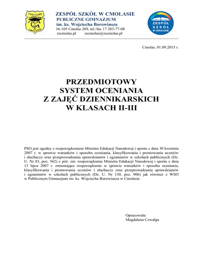 ZESPÓŁ SZKÓŁ W CMOLASIE PUBLICZNE GIMNAZJUM im. ks. Wojciecha Borowiusza 36-105 Cmolas 269, tel./fax 17 283-77-08 zscmolas.pl [email protected] Cmolas, 01.09.2015 r. PRZEDMIOTOWY SYSTEM OCENIANIA Z ZAJĘĆ DZIENNIKARSKICH W KLASACH II-III PSO jest zgodny z rozporządzeniem Ministra Edukacji Narodowej i sportu z dnia 30 kwietnia 2007 r. w sprawie warunków i sposobu oceniania, klasyfikowania i promowania uczniów i słuchaczy oraz przeprowadzania sprawdzianów i egzaminów w szkołach publicznych (Dz. U. Nr 83, poz. 562) z póź. zm. rozporządzenia Ministra Edukacji Narodowej i sportu z dnia 13 lipca 2007 r. zmieniające rozporządzenie w sprawie warunków i sposobu oceniania, klasyfikowania i promowania uczniów i słuchaczy oraz przeprowadzania sprawdzianów i egzaminów w szkołach publicznych (Dz. U. Nr 130, poz. 906) jak również z WSO w Publicznym Gimnazjum im. ks. Wojciecha Borowiusza w Cmolasie. Opracowała: Magdalena Czwałga UMOWA Z UCZNIEM 1. Nauczyciele, oceniając ucznia, kierują się zasadą sprawiedliwości. Każda ocena jest motywowana. Po dłuższej nieobecności w szkole uczeń otrzymuje czas na uzupełnienie zaległości. Może liczyć na pomoc nauczyciela. 2. Oceny są jawne i na bieżąco odnotowywane w dzienniku lekcyjnym. 3. Uczeń zobowiązany jest przynosić na lekcję zeszyt przedmiotowy i robić na bieżąco notatki z zajęć. 4. Uczeń może zgłosić nieprzygotowanie do lekcji 1 raz w ciągu półrocza. Zgłasza ten fakt przed lekcją. Na następne zajęcia ma obowiązek uzupełnić braki. 5. Tzw. ,,szczęśliwy numerek” zwalnia ucznia wyłącznie z bieżącej odpowiedzi (ewentualnie niezapowiedzianej kartkówki), natomiast nie zwalnia z obowiązku pisania zapowiedzianej formy kontroli wiadomości i umiejętności. 6. Sprawdziany, testy są obowiązkowe i zapowiadane z tygodniowym wyprzedzeniem. Uczniowie współdecydują o ich terminie. Jeżeli uczeń opuścił pracę klasową, powinien ją napisać w ciągu tygodnia. Termin ustala nauczyciel. Jeśli uczeń dwukrotnie (bez usprawiedliwienia) opuścił termin pisania pracy, otrzymuje ocenę niedostateczną. 7. W ciągu dwóch tygodni nauczyciel ma obowiązek ocenić wszelkie zebrane prace pisemne i udostępnić je uczniom do wglądu. 8. Uczeń ma prawo poprosić nauczyciela o dodatkową pomoc, np. wytłumaczenie niezrozumiałego materiału, wyjaśnienie spornych kwestii dotyczących ocen cząstkowych. 9. Uczniowie mają wgląd w regulamin oceniania. Kryteria oceny poszczególnych aktywności przypominane są na bieżąco. 10. W przypadku posiadania przez ucznia pisemnej opinii PPP nauczyciel zobowiązany jest dostosować wymagania edukacyjne lub metody pracy do zaleceń poradni i możliwości ucznia. 11. Uczniowie otrzymują oceny cząstkowe za różne formy aktywności: redagowanie tekstów poprawnych pod względem językowym, ortograficznym i interpunkcyjnym, pomysłowość, umiejętność dostrzegania problemów, poszukiwania tematów do artykułów, stopień samodzielności w zbieraniu materiałów, wyszukiwaniu informacji, sprawność w posługiwaniu się różnymi formami wypowiedzi, samodzielność w przygotowaniu artykułów, 2 aktywność na lekcjach, dłuższe wypowiedzi ustne, współpraca w grupie, realizacja określonych projektów, samokształcenie. 12. Większość prac oceniana jest według przeliczenia procentowego: celujący bardzo dobry 95 – 100 % 86 – 94 % dobry 71 – 85 % dostateczny 51 – 70 % dopuszczający 33 – 50 % niedostateczny 0 – 32 % Szczegółowe kryteria ustala każdorazowo nauczyciel, mając na uwadze stopień trudności lub wkład pracy uczniów i podaje przed realizacją konkretnych zadań. Ocena (pisemna lub ustna) stanowi informację zwrotną dla ucznia. Zawiera cztery elementy: wyszczególnienie i docenienie dobrych elementów pracy ucznia, wyszczególnienie tego, co wymaga poprawienia lub dodatkowej pracy ze strony ucznia, wskazówki, w jaki sposób uczeń powinien poprawić pracę, wskazówki, w jakim kierunku uczeń powinien pracować dalej. Elementy oceniane: a) prace pisemne, b) działania praktyczne, c) przygotowanie do lekcji, d) aktywne uczestnictwo ucznia w zajęciach, e) umiejętność formułowania problemów, wyciągania wniosków i poszukiwania własnych rozwiązań, f) stosunek ucznia do przedmiotu. 3 Propozycje kryteriów oceny Na ocenę celującą Uczeń opanował zakres wiadomości i umiejętności przewidzianych na ocenę bardzo dobrą, wykazał się także wiedzą i umiejętnościami, które wykraczają poza program nauczania. Uczeń potrafi poszukiwać twórczych i nietypowych rozwiązań dla postawionego problemu. Systematycznie uczęszcza na zajęcia i doskonale potrafi wykorzystać zdobytą wiedzę teoretyczną w praktyce. Posługuje się stylem jasnym, swobodnym, indywidualnym, ma zróżnicowane i bogate słownictwo, przestrzega zasad etykiety językowej, sprawnie mówi i pisze. Aktywnie uczestniczy w życiu szkoły i miejscowości. Szuka tematów skłaniających do refleksji nad naturą człowieka i otaczającą go rzeczywistością, wobec której zachowuje obiektywizm. Systematycznie redagował artykuły do szkolnej gazetki, współpracował z „Twoim Radiem Cmolas”, nagrywając audycje radiowe. Na ocenę bardzo dobrą Uczeń wykazuje zaangażowanie oraz twórczą postawę, aktywnie pracuje indywidualnie i zespołowo, prawidłowo posługuje się zdobytymi informacjami i nabytymi umiejętnościami oraz bardzo dobrze wywiązuje się z powierzonych mu zadań. Posiada dużą wiedzę o prasie, dziennikarstwie i publicystyce, a także dorobku najwybitniejszych pisarzy, którzy tworzyli (tworzą) teksty dla prasy lub łączyli (łączą) pracę literacką z dziennikarską (m.in. B. Prus, S. Lem, W. Szymborska, R. Kapuściński, H. Krall). Zna i rozumie specyfikę podstawowych gatunków dziennikarskich (informacyjnych i publicystycznych, takich jak: wiadomość, komentarz, relacja, artykuł, felieton, reportaż, recenzja, wywiad). Po