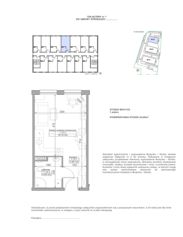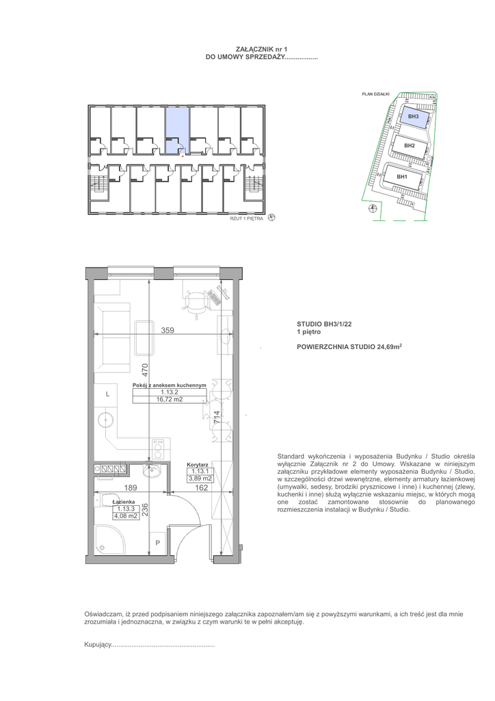 ZAŁĄCZNIK nr 1 DO UMOWY SPRZEDAśY.................. PLAN DZIAŁKI BH3 BH2 BH1 N N RZUT 1 PIĘTRA STUDIO BH3/1/22 1 piętro 359 470 POWIERZCHNIA STUDIO 24,69m2 Pokój z aneksem kuchennym 1.13.2 16,72 m2 714 L Korytarz 1.13.1 3,89 m2 Łazienka 1.13.3 4,08 m2 162 236 189 Standard wykończenia i wyposaŜenia Budynku / Studio określa wyłącznie Załącznik nr 2 do Umowy. Wskazane w niniejszym załączniku przykładowe elementy wyposaŜenia Budynku / Studio, w szczególności drzwi wewnętrzne, elementy armatury łazienkowej (umywalki, sedesy, brodziki prysznicowe i inne) i kuchennej (zlewy, kuchenki i inne) słuŜą wyłącznie wskazaniu miejsc, w których mogą one zostać zamontowane stosownie do planowanego rozmieszczenia instalacji w Budynku / Studio. P Oświadczam, iŜ przed podpisaniem niniejszego załącznika zapoznałem/am się z powyŜszymi warunkami, a ich treść jest dla mnie zrozumiała i jednoznaczna, w związku z czym warunki te w pełni akceptuję. Kupujący........................................................