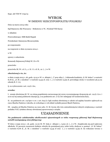 Sygn. akt VIII W 1735/13 WYROK W IMIENIU RZECZYPOSPOLITEJ POLSKIEJ Dnia 19 marca 2014 roku Sąd Rejonowy dla Warszawy - Mokotowa w W., Wydział VIII Karny w składzie: Przewodniczący: SSR Rafał Stępak Protokolant: Katarzyna Skwarczyńska po rozpoznaniu na rozprawie w dniu 19 marca 2014 r. w W. sprawy z oskarżenia Komendy Rejonowej Policji W. II w W. przeciwko przeciwko M. W. z d. L., c. K. i I. z d. K., ur. (...) w W. obwinionej o to, że: w dniu 2 maja 2013 r. ok. godz. 13:15 w W. w sklepie (...)” przy ulicy (...) dokonała kradzieży „S. M. kokos” o wartości 8,78 zł., „S. M. z miodem” o wartości 13,35 zł. oraz (...) o wartości 13,99 zł. powodując straty w wysokości 36,13 na szkodę R. C. (1), tj. za wykroczenie z art. 119 § 1 kw, orzeka: I. uznaje obwinioną M. W. za winną popełnienia zarzuconego jej czynu wyczerpującego dyspozycję art. 119 § 1 k.w. i za to na tej samej podstawie skazuje ją, a na podstawie art. 17 § 2 kw odstępuje od wymierzenia kary, II. na podstawie art. 119 kpw w zw. z art. 624 § 1 kpk zwalnia obwinioną w całości od zapłaty kosztów sądowych na rzecz Skarbu Państwa i określa, że wchodzące w ich skład wydatki ponosi Skarb Państwa, III. zasądza od Skarbu Państwa na rzecz adw. D. M. kwotę 180 (stu osiemdziesięciu) złotych zwiększoną o wartość podatku VAT, tytułem obrony obwinionej sprawowanej z urzędu. UZASADNIENIE Na podstawie całokształtu okoliczności ujawnionych w toku rozprawy głównej Sąd Rejonowy ustalił następujący stan faktyczny: W dniu 2 maja 2013 r. ok. godz. 12.00 M. W. byłą w sklepie (...) przy ul. (...) w W.. Znajdowała się pod wpływem alkoholu. W pewnym momencie kobieta włożyła do posiadanej przy sobie torby słodycze w postaci: „S. M. kokos” o wartości 8,78 zł, „S. M. z miodem” o wartości 13,35 zł oraz (...) o wartości 13,99 zł. Za wskazane towary o łącznej wartości 36,13 zł nie zapłaciła i zaczęła się kierować do wyjścia ze sklepu. M. W. podczas wkładania do torby czekoladek oraz podczas próby opuszczenia sklepu była obserwowana za pomocą zainstalowanego monitoringu przez współwłaściciela sklepu (...). Mężczyzna widząc, że kobieta przeszła przez linię kas i skierowała się do wyjścia ze sklepu wyszedł z biura i udał się za nią. Zbliżywszy się do niej zaprosił ją do biura, a po dotarciu tam poprosił, aby opróżniła torbę, którą miała przy sobie. Ze wskazanej torby obwiniona wyjęła słodycze w postaci: „S. M. kokos”, „S. M. z miodem” oraz (...), za które nie zapłaciła. W związku z tym, że obwiniona nie miała przy sobie pieniędzy oświadczyła, iż pójdzie do domu po pieniądze a w zastaw zostawi swoją kurtkę. R. C. (2) zgodził się na to. Po wyjściu ze sklepu (...) zaczęła krzyczeć i po jakimś czasie wezwała Policję (częściowo wyjaśnienia obwinionej – k. 13, 70; zeznania świadka R. C. (2) – k. 8-9v, 70; zeznania świadka M. Z. (1) – k. 3-4, 70). Skradziony towar został odzyskany w stanie nienaruszonym (zeznania M. Z. (1) – k. 4). Z powołanej w sprawie opinii sporządzonej przez biegłego psychiatrę wynika, że stan obwinionej w czasie czynu ograniczał w stopniu znacznym jej zdolność rozpoznania znaczenia czynu i pokierowania swoim postępowaniem. Biegła rozpoznała u niej zespół zależności alkoholowej powikłany napadami padaczkowymi (opinia biegłego – k. 56-58). Obwiniona M. W. zarówno w toku czynności wyjaśniających, jak też i podczas postępowania przed Sądem konsekwentnie przyznawała się do popełnienia zarzuconego jej czynu (wyjaśnienia – k. 13, 70). Przyznała, iż pamięta, że wyniosła słodycze w postaci (...). M. W. wyraziła skruchę i przyznała, że jest jej wstyd za to, co zrobiła. Dodała, że nie pamięta szczegółowo całego zdarzenia, co tłumaczyła tym, że w chwili czynu znajdowała się w stanie po spożyciu alkoholu. Potwierdziła natomiast, iż została złapana zanim wyszła ze sklepu. Wyjaśnienia obwinionej wraz z pozostałymi dowodami ujawnionymi na rozprawie Sąd ocenił w oparciu o reguły art. 7 k.p.k. w zw. z art. 8 k.p.w., zgodnie z którymi Sąd ocenia dowody swobodnie z uwzględnieniem zasad prawidłowego rozumowania oraz wskazań wiedzy i doświadczenia życiowego. Sąd obdarzył wyjaśnienia obwinionej walorem wiarygodności za wyjątkiem fragmentu, z treści którego wynika, iż R. C. (2) zdjął z niej kurtkę i powiedział że odda ją, jak wróci z pieniędzmi za towar. W tym zakresie nie korelują z zeznaniami pozostałych osób przesłuchanych w sprawie, których relacje uznano za prawdziwe. Podkreślić trzeba, iż z zeznań funkcjonariusza Policji M. Z. (1) wynika jednoznacznie, że obwiniona sama zaproponowała, że pójdzie do domu po pieniądze zaś kurtkę odda w zastaw R. C. (2). W ocenie Sądu rozbieżności co do przebiegu wydarzeń wynikają ze stanu, w jakim znajdowała się wówczas obwiniona - była pod wpływem alkoholu. Jak wynika z opinii sporządzonej przez biegłego psychiatrę, M. W. nie była w stanie rozpoznać znaczenia swojego czynu i pokierować swoim postępowaniem rozpoznała przy czym rozpoznano u niej zespół zależności alkoholowej powikłany napadami padaczkowymi. Okoliczności te – zdaniem Sądu - spowodowały, iż nie była ona w stanie dokonać spostrzeżeń co do zaistniałych faktów i odtworzyć ich zgodnie z rzeczywistym przebiegiem. Obwiniona przyznała się do czynu i opisała, na czym polegało jej zachowanie. Wyjaśniła, że zabrała towar i nie zamierzała za niego zapłacić. Przyznanie się obwinionej do dokonania zarzucanego jej czynu nie budzi żadnych wątpliwości, albowiem jej sprawstwo znalazło oparcie w uznanych za prawdziwe zeznaniach R. C. (2), będącego naocznym świadkiem zdarzenia. Wprawdzie na rozprawie w dniu 19 marca 2014 r. obwiniona nie pamiętała wszystkich okoliczności zdarzenia, lecz zdaniem Sądu – jak już wcześniej wskazano - było to skutkiem s