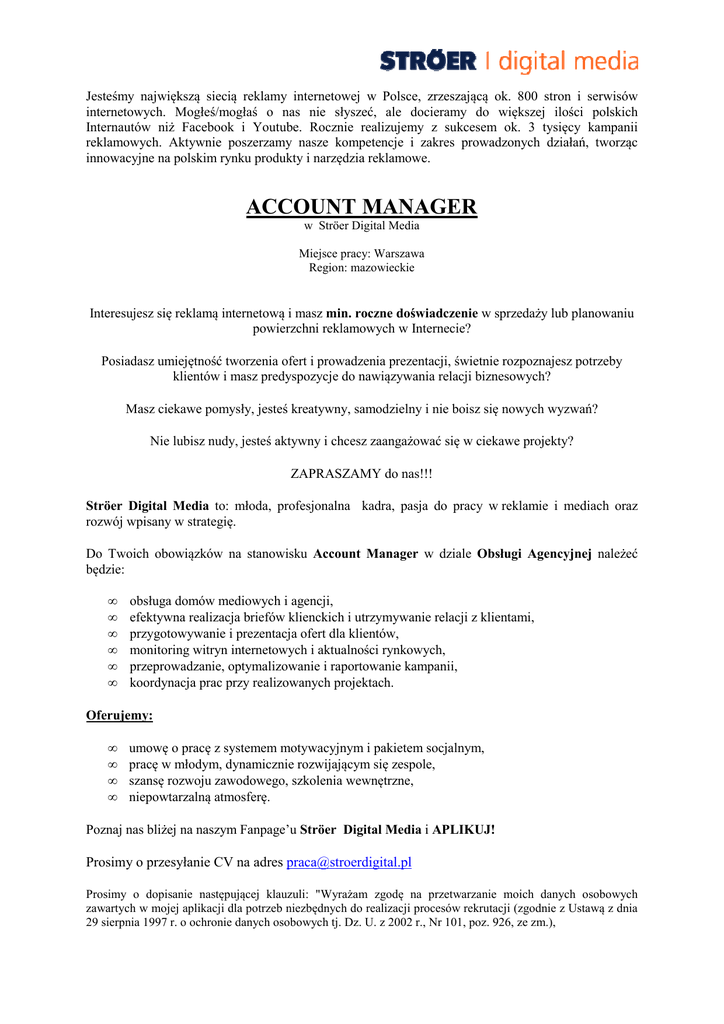 Jesteśmy największą siecią reklamy internetowej w Polsce, zrzeszającą ok. 800 stron i serwisów internetowych. Mogłeś/mogłaś o nas nie słyszeć, ale docieramy do większej ilości polskich Internautów niż Facebook i Youtube. Rocznie realizujemy z sukcesem ok. 3 tysięcy kampanii reklamowych. Aktywnie poszerzamy nasze kompetencje i zakres prowadzonych działań, tworząc innowacyjne na polskim rynku produkty i narzędzia reklamowe. ACCOUNT MANAGER w Ströer Digital Media Miejsce pracy: Warszawa Region: mazowieckie Interesujesz się reklamą internetową i masz min. roczne doświadczenie w sprzedaży lub planowaniu powierzchni reklamowych w Internecie? Posiadasz umiejętność tworzenia ofert i prowadzenia prezentacji, świetnie rozpoznajesz potrzeby klientów i masz predyspozycje do nawiązywania relacji biznesowych? Masz ciekawe pomysły, jesteś kreatywny, samodzielny i nie boisz się nowych wyzwań? Nie lubisz nudy, jesteś aktywny i chcesz zaangażować się w ciekawe projekty? ZAPRASZAMY do nas!!! Ströer Digital Media to: młoda, profesjonalna kadra, pasja do pracy w reklamie i mediach oraz rozwój wpisany w strategię. Do Twoich obowiązków na stanowisku Account Manager w dziale Obsługi Agencyjnej należeć będzie: • • • • • • obsługa domów mediowych i agencji, efektywna realizacja briefów klienckich i utrzymywanie relacji z klientami, przygotowywanie i prezentacja ofert dla klientów, monitoring witryn internetowych i aktualności rynkowych, przeprowadzanie, optymalizowanie i raportowanie kampanii, koordynacja prac przy realizowanych projektach. Oferujemy: • • • • umowę o pracę z systemem motywacyjnym i pakietem socjalnym, pracę w młodym, dynamicznie rozwijającym się zespole, szansę rozwoju zawodowego, szkolenia wewnętrzne, niepowtarzalną atmosferę. Poznaj nas bliżej na naszym Fanpage’u Ströer Digital Media i APLIKUJ! Prosimy o przesyłanie CV na adres [email protected] Prosimy o dopisanie następującej klauzuli: "Wyrażam zgodę na przetwarzanie moich danych osobowych zawartych w mojej aplikacji dla potrzeb niezbędnych do realizacji procesów rekrutacji (zgodnie z Ustawą z dnia 29 sierpnia 1997 r. o ochronie danych osobowych tj. Dz. U. z 2002 r., Nr 101, poz. 926, ze zm.),