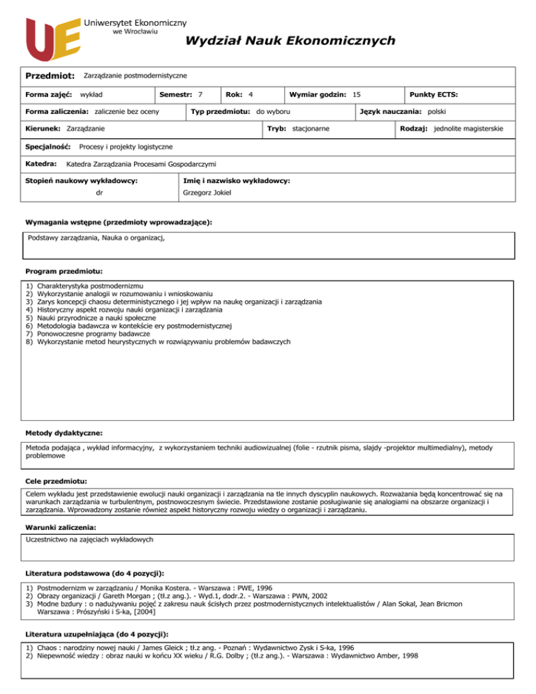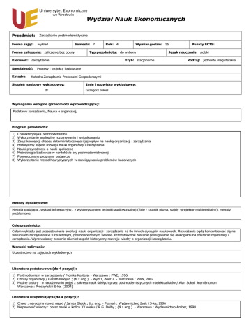 Wydział Nauk Ekonomicznych Przedmiot: Forma zajęć: Zarządzanie postmodernistyczne wykład Semestr: 7 Forma zaliczenia: zaliczenie bez oceny Rok: 4 Typ przedmiotu: do wyboru Kierunek: Zarządzanie Specjalność: Katedra: Wymiar godzin: 15 Tryb: stacjonarne Punkty ECTS: Język nauczania: polski Rodzaj: jednolite magisterskie Procesy i projekty logistyczne Katedra Zarządzania Procesami Gospodarczymi Stopień naukowy wykładowcy: dr Imię i nazwisko wykładowcy: Grzegorz Jokiel Wymagania wstępne (przedmioty wprowadzające): Podstawy zarządzania, Nauka o organizacj, Program przedmiotu: 1) 2) 3) 4) 5) 6) 7) 8) Charakterystyka postmodernizmu Wykorzystanie analogii w rozumowaniu i wnioskowaniu Zarys koncepcji chaosu deterministycznego i jej wpływ na naukę organizacji i zarządzania Historyczny aspekt rozwoju nauki organizacji i zarządzania Nauki przyrodnicze a nauki społeczne Metodologia badawcza w kontekście ery postmodernistycznej Ponowoczesne programy badawcze Wykorzystanie metod heurystycznych w rozwiązywaniu problemów badawczych Metody dydaktyczne: Metoda podająca , wykład informacyjny, z wykorzystaniem techniki audiowizualnej (folie - rzutnik pisma, slajdy -projektor multimedialny), metody problemowe Cele przedmiotu: Celem wykładu jest przedstawienie ewolucji nauki organizacji i zarządzania na tle innych dyscyplin naukowych. RozwaŜania będą koncentrować się na warunkach zarządzania w turbulentnym, postnowoczesnym świecie. Przedstawione zostanie posługiwanie się analogiami na obszarze organizacji i zarządzania. Wprowadzony zostanie równieŜ aspekt historyczny rozwoju wiedzy o organizacji i zarządzaniu. Warunki zaliczenia: Uczestnictwo na zajęciach wykładowych Literatura podstawowa (do 4 pozycji): 1) Postmodernizm w zarządzaniu / Monika Kostera. - Warszawa : PWE, 1996 2) Obrazy organizacji / Gareth Morgan ; (tł.z ang.). - Wyd.1, dodr.2. - Warszawa : PWN, 2002 3) Modne bzdury : o naduŜywaniu pojęć z zakresu nauk ścisłych przez postmodernistycznych intelektualistów / Alan Sokal, Jean Bricmon Warszawa : Prószyński i S-ka, [2004] Literatura uzupełniająca (do 4 pozycji): 1) Chaos : narodziny nowej nauki / James Gleick ; tł.z ang. - Poznań : Wydawnictwo Zysk i S-ka, 1996 2) Niepewność wiedzy : obraz nauki w końcu XX wieku / R.G. Dolby ; (tł.z ang.). - Warszawa : Wydawnictwo Amber, 1998