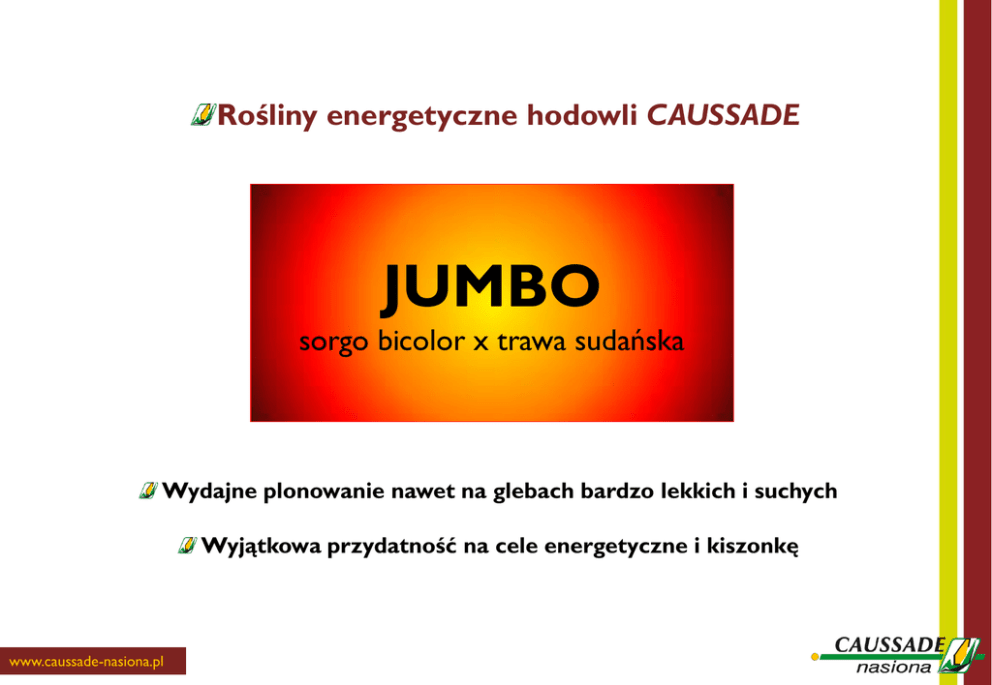 Rośliny energetyczne hodowli CAUSSADE JUMBO sorgo bicolor x trawa sudańska Wydajne plonowanie nawet na glebach bardzo lekkich i suchych Wyjątkowa przydatność na cele energetyczne i kiszonkę www.caussade-nasiona.pl www.caussade-nasiona.pl JUMBO sorgo bicolor x trawa sudańska Przeznaczenie: Doskonała roślina energetyczna dla potrzeb biogazowni Dodatkowe przeznaczenie: Wydajny materiał kiszonkarski w żywieniu zwierząt Wymagania glebowe: Gatunek uniwersalny pod względem doboru stanowiska. Ze względu na doskonałą adaptacje do zmiennych warunków środowiska, Jumbo nadaje się do uprawy także na glebach słabszych i okresowo suchych. Zalecana norma wysiewu: 17 – 20 kg/ha www.caussade-nasiona.pl JUMBO sorgo bicolor x trawa sudańska Charakterystyka Jumbo: Nowa hybryda (sorgo x trawa sudańska) hodowli Caussade Semences. Wyjątkowo mocny wzrost wegetatywny i wysokość roślin dochodząca do 4 metrów nawet na gorszych kompleksach glebowych. Mieszaniec o dłuższym okresie wegetacji umożliwia uzyskanie bardzo wysokich plonów świeżej i suchej masy. Gatunek łatwy w uprawie i mało wymagający pod względem stanowiska glebowego. Dzięki rozbudowanemu systemowi korzeniowemu i oszczędnej gospodarce wodnej, rośliny nie przerywają wegetacji nawet przy długotrwałym braku opadów. Wyjątkowa tolerancja na niesprzyjające i stresowe czynniki środowiska (długotrwała susza, wysokie temperatury). www.caussade-nasiona.pl www.caussade-nasiona.pl WYNIKI PLONOWANIA Rośliny energetyczne – porównanie odmian Ettlingen 2010 Wysokość roślin Lager Ernte 1-9 Zawartość SM % Plon SM t/ha Aron 254 7,0 23,4 17,6 Rona 1 235 1,7 24,7 16,5 Akklimat 250 2,3 26,7 14,7 Super Dolce 15 254 2,3 25,6 15,8 363 1,7 22,4 24,7 Latte 289 1,3 26,9 20,1 Bulldozer 429 1,3 24,4 23,1 średnia 296 2,5 24,9 18,9 Odmiana Jumbo GD 5% Art/Sorte www.caussade-nasiona.pl 1,4