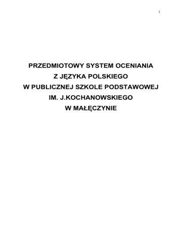 1 PRZEDMIOTOWY SYSTEM OCENIANIA Z JĘZYKA POLSKIEGO W PUBLICZNEJ SZKOLE PODSTAWOWEJ IM. J.KOCHANOWSKIEGO W MAŁĘCZYNIE 2 WSTĘP Celem nowoczesnego oceniania jest: obserwowanie i wspieranie rozwoju ucznia, uzyskanie informacji o wynikach kształcenia, diagnozowanie osiągnięć dydaktycznych ucznia, sprawdzanie wiadomości i umiejętności, rozbudzanie motywacji uczenia się, rozpoznawanie uzdolnień, zainteresowań i predyspozycji, wdrażanie do samooceny, przygotowanie do „zdrowej rywalizacji”, uczenie systematyczności i organizacji uczenia się, niwelowanie stresu i lęku. ZAŁOŻENIA PSO 1. PSO wspiera rozwój intelektualny i osobowościowy ucznia. 2. Każdy uczeń na miarę swoich możliwości robi jak najwięcej, by osiągnąć sukces szkolny. 3. Na początku każdego roku szkolnego uczniowie i rodzice są informowani o celach, zasadach i założeniach przedmiotowego systemu oceniania z języka polskiego. 4. Ocena ma dostarczyć uczniom i rodzicom informacji na temat postępów, uzdolnień i trudności w nauce. 5. Nauczyciel powinien oceniać to, czego się uczeń nauczył, a nie to, czego nie umie. 6. Każda ocena musi być opatrzona ustnym lub pisemnym komentarzem nauczyciela, który jest wskazówką dla ucznia na temat jego poziomu wiadomości i umiejętności. ZASADY PSO 1. Wymagania edukacyjne oparte są na podstawie programowej jęz. polskiego dla II etapu edukacyjnego oraz programach: „Teraz polski”, „Słowa na start” oraz „Czytać, myśleć, uczestniczyć”. 2. Stosuje się sześciostopniową skalę ocen. 3 3. PSO z j. polskiego dopuszcza możliwość stawiania ocen cząstkowych ze znakami „ + / - ”. Na półrocze i koniec roku szkolnego oceny muszą być pełne. 4. Każdy rodzaj aktywności ucznia oceniany jest także plusem (+) i minusem (-), np. z aktywności na lekcji, dodatkowych prac. 5 plusów (+) = bdb 5 minusów(-) = ndst 5. Prace klasowe są obowiązkowe. Jeśli z przyczyn losowych uczeń nie może pisać w wyznaczonym dla całej klasy terminie, to powinien to uczynić w terminie dwutygodniowym od powrotu do szkoły. 6. Uczeń może na własną prośbę poprawić pracę klasową, ale tylko raz. 7. Prace klasowe i testy z większej partii materiału są zapowiadane z tygodniowym wyprzedzeniem, natomiast krótkie kartkówki obejmujące nie więcej niż trzy ostatnie lekcje, mogą być przeprowadzane bez zapowiedzi. 8. Pisemne prace domowe uczeń jest zobowiązany oddać w ustalonym terminie. Nauczyciel może, ale nie musi, wyznaczyć dodatkowy termin. Nieoddanie pracy skutkuje oceną niedostateczną. 9. Wszystkie prace klasowe powinny być opatrzone podpisem ucznia i tematem pracy oraz gromadzone przez nauczyciela, tak aby uczeń i jego rodzice mieli do nich wgląd. 10. Prace pisemne muszą być napisane czytelnie, a zeszyty przedmiotowe prowadzone estetycznie. 11. Uczeń jest zobowiązany do noszenia podręczników i zeszytu na każdą lekcję. Ich brak może skutkować oceną niedostateczną. 12. Dwa razy w półroczu uczeń może zgłosić nieprzygotowanie do lekcji bez żadnych sankcji (nie dotyczy prac klasowych, prac długoterminowych i lektur). Mimo wykorzystanych szans, w pierwszym dniu po nieobecności spowodowanej chorobą lub przypadkiem losowym, uczeń nie ponosi żadnych sankcji z tytułu nieprzygotowania do zajęć. 13. Sprawdzone prace klasowe i wypracowania są oddawane w terminie do trzech tygodni. OBSZARY AKTYWNOŚCI UCZNIA PODLEGAJĄCE OCENIANIU: słuchanie i mówienie, czytanie tekstów literackich i odczytywanie innych tekstów kultury, 4 tworzenie własnego tekstu, praktyczne posługiwanie się wiedzą z nauki o języku, poprawność ortograficzna i interpunkcyjna. PRZEWIDYWANE OSIĄGNIĘCIA Absolwent szkoły podstawowej powinien: czytać ze zrozumieniem teksty kultury, w tym utwory poetyckie, proste teksty popularnonaukowe oraz teksty informacyjne; czytać głośno teksty oraz recytować utwory poetyckie z odpowiednią artykulacją, akcentem, tempem, rytmem i intonacją, przekazując intencję utworu; odróżniać tekst literacki od tekstu informacyjnego oraz reklamowego, rozumieć cel i funkcję czytanych tekstów; wyszukiwać w tekście informacje istotne dla zrozumienia treści dzieła, w tym informacje wyrażone pośrednio; określać główny temat utworu literackiego, dzieła sztuki malarskiej, artykułu prasowego; wskazywać składniki świata przedstawionego utworu literackiego, w tym bohaterów, czas i miejsce oraz wydarzenia; identyfikować formy wypowiedzi: zaproszenie, życzenia, gratulacje, zawiadomienie, ogłoszenie, instrukcję, przepis oraz tworzyć je samodzielnie; wymienić przykłady znaków służących komunikacji; rozpoznawać znaczenie niewerbalnych sposobów komunikowania się; wyróżniać nadawcę i odbiorcę wypowiedzi; wyjaśnić dosłowne i przenośne znaczenie wyrazów w wypowiedzi; wiedzieć, jak szukać informacji w encyklopedii i słownikach; posługiwać się nowoczesnymi technologiami informacyjno-komunikacyjnymi w celu wyszukiwania i korzystania z informacji; rozpoznawać internetowe formy komunikacji, w tym e-mail, blog, czat, forum internetowe; korzystać ze bliskoznacznych; słownika języka polskiego oraz słownika wyrazów 5 sprawnie posługiwać się informacjami o pisowni wyrazów, zawartymi w słowniku ortograficznym; rozumieć różnice pomiędzy częściami mowy a częściami zdania, wyróżniać i nazywać elementy języka w tekście; umieć budować krótkie wypowiedzi w określonej formie składniowej; nazywać własne emocje, wrażenia, refleksje, związane z lekturą utworów literackich i poznawaniem innych tekstów kultury, w tym dzieł malarskich, komiksów, przedstawień teatralnych, filmów, programów telewizyjnych; określać podstawowe cechy gatunkowe opowiadania, powieści, baśni, legendy, mitu, bajki, fraszki, komiksu; wyjaśnić morał bajki i sformułować przesłanie baśni; wyrażać własne opinie o bohaterach poznanych tekstów kultury oraz charakteryzować