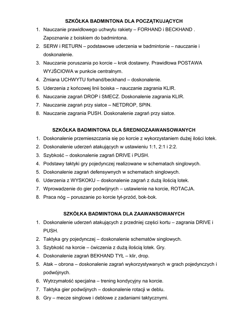 SZKÓŁKA BADMINTONA DLA POCZĄTKUJĄCYCH 1. Nauczanie prawidłowego uchwytu rakiety – FORHAND i BECKHAND . Zapoznanie z boiskiem do badmintona. 2. SERW i RETURN – podstawowe uderzenia w badmintonie – nauczanie i doskonalenie. 3. Nauczanie poruszania po korcie – krok dostawny. Prawidłowa POSTAWA WYJŚCIOWA w punkcie centralnym. 4. Zmiana UCHWYTU forhand/beckhand – doskonalenie. 5. Uderzenia z końcowej linii boiska – nauczanie zagrania KLIR. 6. Nauczanie zagrań DROP i SMECZ. Doskonalenie zagrania KLIR. 7. Nauczanie zagrań przy siatce – NETDROP, SPIN. 8. Nauczanie zagrania PUSH. Doskonalenie zagrań przy siatce. SZKÓŁKA BADMINTONA DLA ŚREDNIOZAAWANSOWANYCH 1. Doskonalenie przemieszczania się po korcie z wykorzystaniem dużej ilości lotek. 2. Doskonalenie uderzeń atakujących w ustawieniu 1:1, 2:1 i 2:2. 3. Szybkość – doskonalenie zagrań DRIVE i PUSH. 4. Podstawy taktyki gry pojedynczej realizowane w schematach singlowych. 5. Doskonalenie zagrań defensywnych w schematach singlowych. 6. Uderzenia z WYSKOKU – doskonalenie zagrań z dużą ilością lotek. 7. Wprowadzenie do gier podwójnych – ustawienie na korcie, ROTACJA. 8. Praca nóg – poruszanie po korcie tył-przód, bok-bok. SZKÓŁKA BADMINTONA DLA ZAAWANSOWANYCH 1. Doskonalenie uderzeń atakujących z przedniej części kortu – zagrania DRIVE i PUSH. 2. Taktyka gry pojedynczej – doskonalenie schematów singlowych. 3. Szybkość na korcie – ćwiczenia z dużą ilością lotek. Gry. 4. Doskonalenie zagrań BEKHAND TYŁ – klir, drop. 5. Atak – obrona – doskonalenie zagrań wykorzystywanych w grach pojedynczych i podwójnych. 6. Wytrzymałość specjalna – trening kondycyjny na korcie. 7. Taktyka gier podwójnych – doskonalenie rotacji w deblu. 8. Gry – mecze singlowe i deblowe z zadaniami taktycznymi.