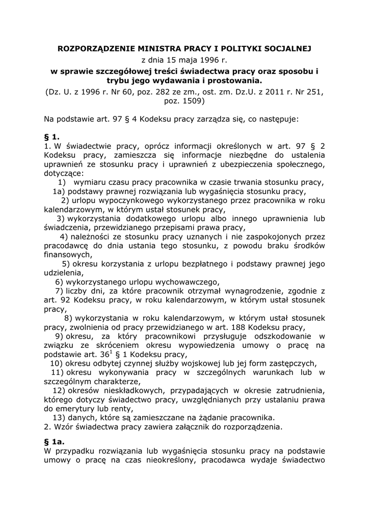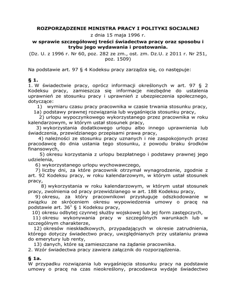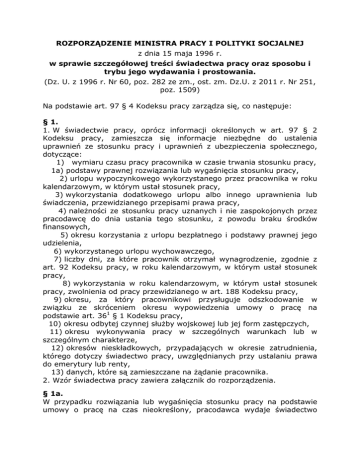 ROZPORZĄDZENIE MINISTRA PRACY I POLITYKI SOCJALNEJ z dnia 15 maja 1996 r. w sprawie szczegółowej treści świadectwa pracy oraz sposobu i trybu jego wydawania i prostowania. (Dz. U. z 1996 r. Nr 60, poz. 282 ze zm., ost. zm. Dz.U. z 2011 r. Nr 251, poz. 1509) Na podstawie art. 97 § 4 Kodeksu pracy zarządza się, co następuje: § 1. 1. W świadectwie pracy, oprócz informacji określonych w art. 97 § 2 Kodeksu pracy, zamieszcza się informacje niezbędne do ustalenia uprawnień ze stosunku pracy i uprawnień z ubezpieczenia społecznego, dotyczące: 1) wymiaru czasu pracy pracownika w czasie trwania stosunku pracy, 1a) podstawy prawnej rozwiązania lub wygaśnięcia stosunku pracy, 2) urlopu wypoczynkowego wykorzystanego przez pracownika w roku kalendarzowym, w którym ustał stosunek pracy, 3) wykorzystania dodatkowego urlopu albo innego uprawnienia lub świadczenia, przewidzianego przepisami prawa pracy, 4) należności ze stosunku pracy uznanych i nie zaspokojonych przez pracodawcę do dnia ustania tego stosunku, z powodu braku środków finansowych, 5) okresu korzystania z urlopu bezpłatnego i podstawy prawnej jego udzielenia, 6) wykorzystanego urlopu wychowawczego, 7) liczby dni, za które pracownik otrzymał wynagrodzenie, zgodnie z art. 92 Kodeksu pracy, w roku kalendarzowym, w którym ustał stosunek pracy, 8) wykorzystania w roku kalendarzowym, w którym ustał stosunek pracy, zwolnienia od pracy przewidzianego w art. 188 Kodeksu pracy, 9) okresu, za który pracownikowi przysługuje odszkodowanie w związku ze skróceniem okresu wypowiedzenia umowy o pracę na podstawie art. 361 § 1 Kodeksu pracy, 10) okresu odbytej czynnej służby wojskowej lub jej form zastępczych, 11) okresu wykonywania pracy w szczególnych warunkach lub w szczególnym charakterze, 12) okresów nieskładkowych, przypadających w okresie zatrudnienia, którego dotyczy świadectwo pracy, uwzględnianych przy ustalaniu prawa do emerytury lub renty, 13) danych, które są zamieszczane na żądanie pracownika. 2. Wzór świadectwa pracy zawiera załącznik do rozporządzenia. § 1a. W przypadku rozwiązania lub wygaśnięcia stosunku pracy na podstawie umowy o pracę na czas nieokreślony, pracodawca wydaje świadectwo pracy w dniu, w którym następuje rozwiązanie lub wygaśnięcie stosunku pracy. § 2. 1. Pracodawca wydaje świadectwo pracy bezpośrednio pracownikowi albo osobie upoważnionej przez pracownika na piśmie . 2. Jeżeli wydanie świadectwa pracy pracownikowi albo osobie przez niego upoważnionej w terminie wynikającym z § 1a oraz z art. 97 § 12 i 13 Kodeksu pracy nie jest możliwe, pracodawca, nie później niż w ciągu 7 dni od dnia upływu tego terminu, przesyła świadectwo pracy pracownikowi lub tej osobie za pośrednictwem poczty albo doręcza je w inny sposób. § 2a. W przypadku określonym w art. 97 § 11 Kodeksu pracy pracownik zgłasza pracodawcy żądanie wydania świadectwa pracy najpóźniej w dniu poprzedzającym dzień, w którym następuje rozwiązanie lub wygaśnięcie stosunku pracy. § 2a. (uchylony). § 3. W razie wygaśnięcia stosunku pracy z powodu śmierci pracownika (art. 631 § 1 Kodeksu pracy), pracodawca sporządza świadectwo pracy i włącza je do akt osobowych zmarłego pracownika. Z wnioskiem o wydanie przez pracodawcę świadectwa pracy może wystąpić członek rodziny zmarłego pracownika, a także inna osoba będąca spadkobiercą tego pracownika. § 4. Kopię świadectwa pracy przechowuje się w aktach osobowych pracownika; w uzasadnionych przypadkach pracodawca wydaje odpis tego świadectwa pracownikowi albo osobie, o której mowa w § 2 ust. 1 i w § 3. § 5. 1. Pracodawca zawiadamia pracownika na piśmie o negatywnym wyniku rozpatrzenia wniosku o sprostowanie świadectwa pracy w ciągu 7 dni od dnia otrzymania tego wniosku. W razie uwzględnienia wniosku, pracodawca wydaje pracownikowi w tym terminie nowe świadectwo pracy. 2. W razie uwzględnienia przez sąd pracy powództwa pracownika o sprostowanie świadectwa pracy, pracodawca jest obowiązany wydać pracownikowi niezwłocznie nowe świadectwo pracy, nie później jednak niż w ciągu 3 dni od dnia uprawomocnienia się orzeczenia sądu w tej sprawie. 3. W razie prawomocnego orzeczenia sądu pracy o przywróceniu pracownika do pracy lub przyznaniu mu odszkodowania z tytułu niezgodnego z przepisami prawa wypowiedzenia umowy o pracę lub jej rozwiązania bez wypowiedzenia, pracodawca, na żądanie pracownika, jest obowiązany uzupełnić treść wydanego mu uprzednio świadectwa pracy o dodatkową informację o tym orzeczeniu, z zastrzeżeniem ust. 4. 4. Jeżeli orzeczenie, o którym mowa w ust. 3, zostało wydane w związku z rozwiązaniem przez pracodawcę umowy o pracę bez wypowiedzenia z winy pracownika, z naruszeniem przepisów o rozwiązywaniu w tym trybie umów o pracę, pracodawca jest obowiązany wydać pracownikowi, w terminie określonym w ust. 2, nowe świadectwo pracy zawierające informację o rozwiązaniu umowy o pracę za wypowiedzeniem dokonanym przez pracodawcę, powołującą art. 97 § 3 Kodeksu pracy. 5. W przypadkach określonych w ust. 1 zdanie drugie oraz w ust. 2 i 4 pracodawca jest obowiązany, najpóźniej w dniu wydania pracownikowi nowego świadectwa pracy, usunąć z akt osobowych pracownika i zniszczyć poprzednio wydane świadectwo pracy. § 6. Przepis § 5 ust. 2 stosuje się odpowiednio w razie uwzględnienia przez sąd pracy powództwa pracownika o odszkodowanie w związku z niewydaniem w terminie lub wydaniem niewłaściwego świadectwa pracy (art. 99 § 4 Kodeksu pracy). § 7. W razie prawomocnego orzeczenia sądu pracy o odszkodowaniu na rzecz pracodawcy z tytułu nieuzasadnionego rozwiązania przez pracownika umowy o pracę bez wypowiedzenia na podstawie art. 55 § 11 Kodeksu pracy (art. 611 Kodeksu pracy), pracownik jest obowiązany przedłożyć pracodawcy wydane mu świadectwo pracy w celu uzupełnienia treści tego świadectwa o informację o wydan