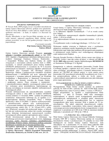„GMINA ZASŁUGUJE NA WIĘCEJ” BEZPŁATNY GMINNY INFORMATOR SAMORZĄDOWY NR 1/ 2009/STYCZEŃ ŻYCZENIA NOWOROCZNE W Nowym Roku 2009 pragnę życzyć wszystkim mieszkańcom Gminy Lipnica Murowana zdrowia, spokoju oraz optymizmu. Niech ten Nowy Rok obfituje w same sukcesy, mądre decyzje, spełnione marzenia – te małe, te większe i te skrywane na dnie serca. Drodzy Mieszkańcy w tym Nowym Roku starajmy się coś w sobie zmienić, naprawić popełnione błędy, abyśmy mogli później stwierdzić, że ten rok był godnie przeżyty i lepszy od poprzedniego. Z wyrazami szacunku Wójt Gminy Lipnica Murowana Tadeusz Klimek * KOMUNIKAT Gmina Lipnica Murowana posiada Program usuwania azbestu i wyrobów zawierających azbest na lata 20082032. Zgodnie z Regulaminem udzielania dofinansowania ze środków Gminnego Funduszu Ochrony Środowiska i Gospodarki Wodnej oraz budżetu Gminy do zadań związanych z usuwaniem azbestu możliwe było w 2008r. uzyskanie, w ramach posiadanych przez Gminę środków GFOŚiGW dofinansowanie w wysokości do 70 % kosztów poniesionych na transport i utylizację odpadów azbestowych powstałych przy wymianie lub likwidacji pokrycia dachowego. Jednym z podstawowych warunków uzyskania dofinansowania z GFOŚiGW jest m.in. zgłoszenie prac związanych z wymianą pokrycia dachowego do Wydziału Architektury i Budownictwa w Starostwie Powiatowym w Bochni oraz złożenie wniosku do Urzędu Gminy i podpisanie umowy. Prace związane z usunięciem i unieszkodliwieniem odpadów zawierających azbest muszą być wykonane przez przedsiębiorcę legitymującego się decyzją zezwalającą na usuwanie odpadów niebezpiecznych zawierających azbest. Warunki dofinansowania do unieszkodliwiania wyrobów zwierających azbest w roku 2009 ze środków GFOŚiGW zostaną ustalone w I kwartale 2009r. i podane do publicznej wiadomości. Jednocześnie informuje się, że zgodnie z § 7 Rozporządzenia Ministra Gospodarki, Pracy i Polityki Społecznej z dnia 23.10.2003r. w sprawie wykorzystywania i przemieszczania azbestu oraz wykorzystywania i oczyszczania instalacji lub urządzeń, w których był lub jest wykorzystywany azbest (Dz. U. Nr 192,poz.1876 z późn. zm.) Właściciel, zarządca lub użytkownik miejsc, w których był lub jest wykorzystywany azbest lub wyroby zawierające azbest, dokonuje inwentaryzacji zastosowanych wyrobów zawierających azbest, poprzez sporządzenie spisu z natury. Wynik inwentaryzacji ujmuje się w informacji, wg określonego powyższym rozporządzeniem wzoru. Informację powyższą osoby fizyczne niebędące przedsiębiorcami przedkładają Wójtowi Gminy. Informacja podlega corocznej aktualizacji w terminie do 31 stycznia każdego roku. Szczegółowe informacje nt. źródeł finansowania kosztów usuwania azbestu można uzyskać w Urzędzie Gminy w Lipnicy Murowanej - Referat Gospodarki Komunalnej, Środowiska i Rolnictwa, tel. 014/68 52 100, wew. 26 i 35. KOMUNIKATY URZĘDU GMINY Urząd Gminy w Lipnicy Murowanej informuje, że w roku 2009 obowiązywać będą następujące opłaty: 1) za odbieranie odpadów komunalnych - 7 zł za worek czarny (tzw. balast), 2) za odbieranie segregowanych odpadów komunalnych (plastik, szkło) - 1,50 zł za worek, 3) za odprowadzanie ścieków do oczyszczalni ścieków - 3,25 zł za 1 m3 , 4) za pobieranie wody z wodociągu lokalnego - 2,19 zł za 1 m3. * Wykonano studnię wierconą w Rajbrocie wraz z uzyskaniem ekspertyzy ustalającej zasoby eksploatacyjne dla tej studni. Zakończenie tego etapu daje podstawę dla przygotowania projektu i w późniejszym czasie budowę sieci wodociągowej obejmującej część miejscowości Rajbrot. * Decyzją Zarządu Powiatu w Bochni, dyżury nocne oraz dyżury w niedziele, święta i inne dni wolne od pracy, w okresie od 1.01 do 31.12. 2009 roku prowadzi Apteka Ogólnodostępna REMEDIUM ul. Kazimierza Wielkiego 13 w Bochni. * Kompetencje w zakresie zatrudniania kierownika Urzędu Stanu Cywilnego zgodnie z zapisem art.6 ust.5 ustawy „Prawo o aktach stanu cywilnego” przysługują wójtowi. Czynności dokonywane w okresie od 7.08.2005 do wejścia ustawy w życie ustawy przez kierownika USC powołanych uchwałą RG na podstawie art. 6 ust. 3 bez przeprowadzenia naboru w trybie art. 3a-3d. ustawy o pracownikach samorządowych są usankcjonowane jako dokonane przez organ uprawniony. * WYNAGRODZENIE ZA PRACĘ WÓJTA GMINY LIPNICA MUROWANA TADEUSZA KLIMKA Wynagrodzenie Wójta Gminy zostało ustalone na podstawie uchwały Nr XIX/131/08 i uchwały Nr XIX/132/08 Rady Gminy Lipnica Murowana z dnia 9 czerwca 2008 r. i wynosi 4 399,20 zł. Pragnę przypomnieć, że zgodnie z rozporządzeniem Rady Ministrów z dnia 22 kwietnia 2008 roku zmieniające rozporządzenie w sprawie zasad wynagradzania pracowników samorządowych zatrudnionych w urzędach gmin, starostwach powiatowych i urzędach marszałkowskich jest to najniższe wynagrodzenie jakie może otrzymać Wójt w gminie do 15 tys. mieszkańców. Wg tabeli stanowisk pracowniczych wójtów, starostów i marszałków województw, która stanowi załącznik do cytowanego powyżej rozporządzenia kwota wynagrodzenia w może znajdować w przedziale od 4 200 zł do 5 900 zł, natomiast dodatek funkcyjny w przedziale od 1 500 zł do 1 900 zł. * 1 % PODATKU DLA STRAŻAKÓW Wójt Gminy Lipnica Murowana oraz Zarząd Oddziału Gminnego Związku OSP RP w Lipnicy Murowanej apeluje do wszystkich mieszkańców Gminy o przekazywanie 1% podatku na rzecz OSP działających na terenie Gminy Lipnica Murowana. Jeśli zdecydujesz się o przekazanie 1% na rzecz danej jednostki OSP należy: w zeznaniach rocznych podatkowych tj. . PIT w dziale: „Wniosek o przekazanie 1% podatku należnego na rzecz organizacji pożytku publicznego” w rubryce „Nazwa OPP” należy wpisać - ZWIĄZEK OCHOTNICZYCH STRAŻY POŻARNYCH RZECZPOSPOLITEJ POLSKIEJ w rubryce „Numer KRS” należy wpisać – 0000116212. W informacjach uzupełniających wpisać: nazwę i dokładny adr