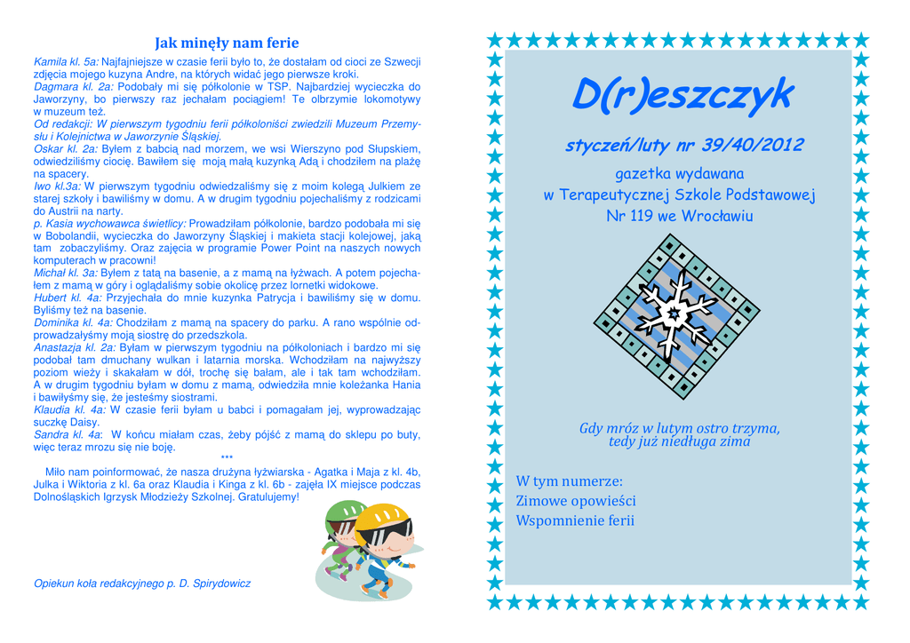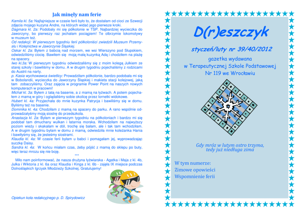 Jak minęły nam ferie Kamila kl. 5a: Najfajniejsze w czasie ferii było to, że dostałam od cioci ze Szwecji zdjęcia mojego kuzyna Andre, na których widać jego pierwsze kroki. Dagmara kl. 2a: Podobały mi się półkolonie w TSP. Najbardziej wycieczka do Jaworzyny, bo pierwszy raz jechałam pociągiem! Te olbrzymie lokomotywy w muzeum też. Od redakcji: W pierwszym tygodniu ferii półkoloniści zwiedzili Muzeum Przemysłu i Kolejnictwa w Jaworzynie Śląskiej. Oskar kl. 2a: Byłem z babcią nad morzem, we wsi Wierszyno pod Słupskiem, odwiedziliśmy ciocię. Bawiłem się moją małą kuzynką Adą i chodziłem na plażę na spacery. Iwo kl.3a: W pierwszym tygodniu odwiedzaliśmy się z moim kolegą Julkiem ze starej szkoły i bawiliśmy w domu. A w drugim tygodniu pojechaliśmy z rodzicami do Austrii na narty. p. Kasia wychowawca świetlicy: Prowadziłam półkolonie, bardzo podobała mi się w Bobolandii, wycieczka do Jaworzyny Śląskiej i makieta stacji kolejowej, jaką tam zobaczyliśmy. Oraz zajęcia w programie Power Point na naszych nowych komputerach w pracowni! Michał kl. 3a: Byłem z tatą na basenie, a z mamą na łyżwach. A potem pojechałem z mamą w góry i oglądaliśmy sobie okolicę przez lornetki widokowe. Hubert kl. 4a: Przyjechała do mnie kuzynka Patrycja i bawiliśmy się w domu. Byliśmy też na basenie. Dominika kl. 4a: Chodziłam z mamą na spacery do parku. A rano wspólnie odprowadzałyśmy moją siostrę do przedszkola. Anastazja kl. 2a: Byłam w pierwszym tygodniu na półkoloniach i bardzo mi się podobał tam dmuchany wulkan i latarnia morska. Wchodziłam na najwyższy poziom wieży i skakałam w dół, trochę się bałam, ale i tak tam wchodziłam. A w drugim tygodniu byłam w domu z mamą, odwiedziła mnie koleżanka Hania i bawiłyśmy się, że jesteśmy siostrami. Klaudia kl. 4a: W czasie ferii byłam u babci i pomagałam jej, wyprowadzając suczkę Daisy. Sandra kl. 4a: W końcu miałam czas, żeby pójść z mamą do sklepu po buty, więc teraz mrozu się nie boję. *** Miło nam poinformować, że nasza drużyna łyżwiarska - Agatka i Maja z kl. 4b, Julka i Wiktoria z kl. 6a oraz Klaudia i Kinga z kl. 6b - zajęła IX miejsce podczas Dolnośląskich Igrzysk Młodzieży Szkolnej. Gratulujemy! Opiekun koła redakcyjnego p. D. Spirydowicz D(r)eszczyk styczeń/luty nr 39/40/2012 gazetka wydawana w Terapeutycznej Szkole Podstawowej Nr 119 we Wrocławiu Gdy mróz w lutym ostro trzyma, tedy już niedługa zima W tym numerze: Zimowe opowieści Wspomnienie ferii Z życia szkoły - styczeń i luty Zimowe opowieści „Wiem, co już osiągnąłem i cieszę się z tego, chciałbym się tym pochwalić przed tobą kolego!” Było słoneczne popołudnie. Poszliśmy z kolegą Krzyśkiem na lodowisko, pojeździć na łyżwach. Trochę się bałem. Kolega powiedział: - Nie bój się, pojeździmy razem. - No, dobrze! Gdy już byliśmy gotowi, poszliśmy się ślizgać. - O, ile tu nas? Nawet Grażynka i Bożenka. Każdy ma łyżwy. Tu jadą parami. Tam każdy osobno. A tu zrobili koło. Jest silny mróz, a im aż gorąco od samego pędu. - Ale co tam z Grażynką? Nagle „bęc” i leży jak długa. - Co Ci? Pomożemy Ci… już, już! - Nic, nic! Tylko łyżwa mi spadła. Grażynka zaraz sama wstała i nałożyła łyżwę. - Wszystko w porządku Janek, nie martw się. - Bawimy się dalej - mówi dziewczynka. Jeździmy, bawimy się w berka. Nasza koleżanka jeździ jak mistrzyni jazdy figurowej. Muzyka rozbrzmiewa w głośnikach. Po paru godzinach zakończyliśmy wspólną zabawę. Pożegnaliśmy się: - Cześć! - Do zobaczenia chłopaki! Każdy z nas wrócił do domu na kolację. To było miłe popołudnie. Najważniejsze, że Grażynie nic się nie stało. Janek kl. 6a LIGA MISTRZÓW • uczniowie przynoszą do wychowawcy wszystkie dyplomy Mistrzów zdobyte w tym półroczu • wybór klasowego Mistrza nad Mistrzami • wybór klasowego Mistrza Dzienniczka Dobrych Wiadomości • Dzień Sukcesu Szkolnego: 13.01.2012 – dzień bez tornistra (piątek) • Bezpieczna zabawa to ważna sprawa! – BHP w czasie ferii zimowych „Wiem, jak się zachować, mam dobre maniery, to pomaga w życiu, będę z wami szczery” Mistrzowie: Przestrzegania Zasad Szkolnych, Kulturalnego Zachowania, Magicznych Słów, Zachowania się przy stole • uczniowie dyskutują na temat zasad kulturalnego zachowania • sztafeta edukacyjna „Jestem dobrze wychowany” 21.02.2012 *** Miło nam poinformować, że w grudniowo - styczniowej edycji konkursu, klasowymi mistrzami ortografii zostali : klasa 4a - Dominika, Sandra i Artur klasa 4b - Julka, Maja, Patrycja i Mateusz, klasa 5a - Kamila, Łukasz, Arek i Grześ klasa 5b - Patrycja, Mateusz N. i Krzyś klasa 6a - Wiktoria, Janek i Oskar klasa 6b - Kinga, Adela, Arek i Adrian, GRATULUJEMY! Lista wyrazowa w lutym: ferie zimowe, zimowisko, lodowisko, narty, łyżwy, odpoczynek, śniegowe szaleństwo, jazda figurowa, narciarstwo, saneczkarstwo, ciepłe ubranie, odwilż, ślizgawka, przymrozki, wyciąg narciarski, kombinezon, śnieżyca, półrocze, bitwa na śnieżki, rzeźby ze śniegu. Ferie zimowe spędziłem w górach i na półkolonii. Pierwszy tydzień spędziłem w górach. Miasteczko w którym mieszkałem nazywa się Jarnołtówek. Jeździliśmy stamtąd do Czech. W ośrodku był basen i prawie codziennie w nim pływałem. W drugim tygodniu ferii byłem na półkoloniach w naszej szkole. Codziennie były warsztaty i jakiejś wyjście. Każdego dnia byliśmy w innym miejscu: w kinie oglądaliśmy Muppety, w kręgielni, na basenie, w kinie 5D i w Bobolandii. Najbardziej podobały mi się efekty w kinie 5D! To było trochę straszne i trochę śmieszne. Te ferie były najlepsze! Grześ kl. 5a