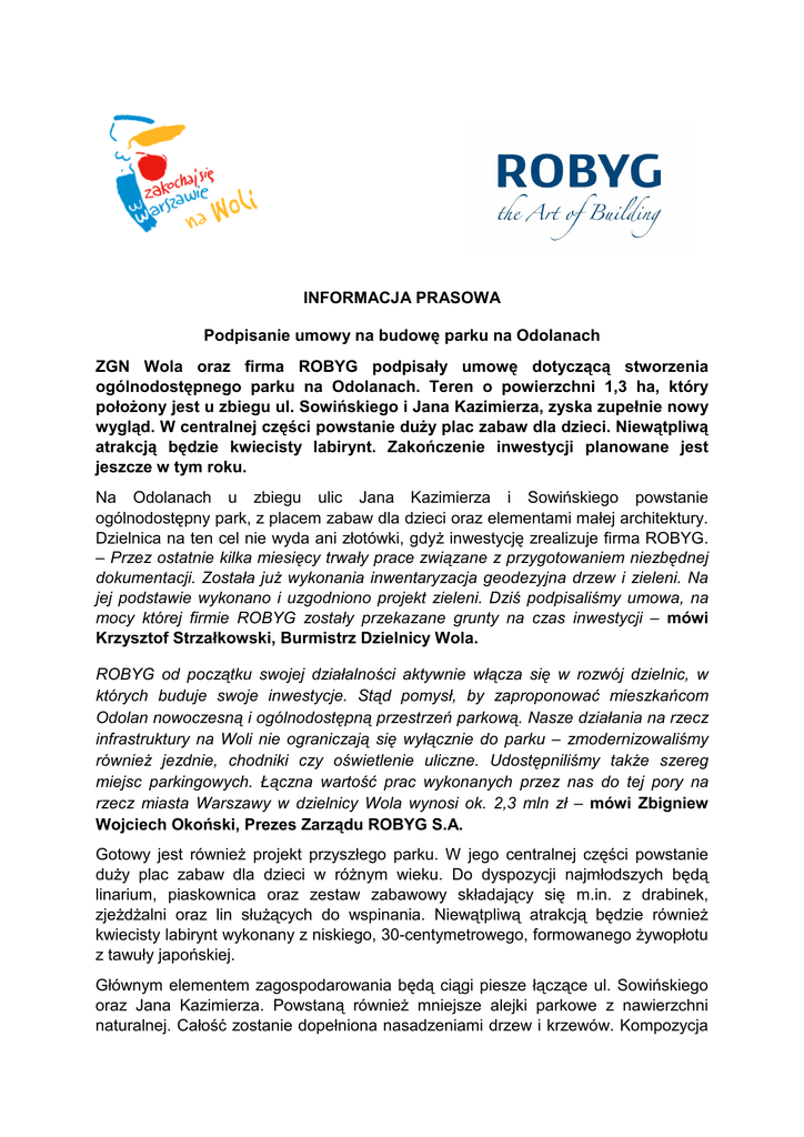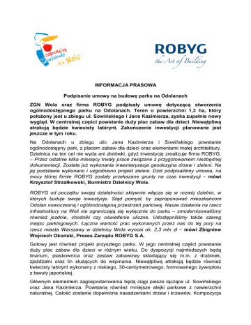 INFORMACJA PRASOWA Podpisanie umowy na budowę parku na Odolanach ZGN Wola oraz firma ROBYG podpisały umowę dotyczącą stworzenia ogólnodostępnego parku na Odolanach. Teren o powierzchni 1,3 ha, który położony jest u zbiegu ul. Sowińskiego i Jana Kazimierza, zyska zupełnie nowy wygląd. W centralnej części powstanie duży plac zabaw dla dzieci. Niewątpliwą atrakcją będzie kwiecisty labirynt. Zakończenie inwestycji planowane jest jeszcze w tym roku. Na Odolanach u zbiegu ulic Jana Kazimierza i Sowińskiego powstanie ogólnodostępny park, z placem zabaw dla dzieci oraz elementami małej architektury. Dzielnica na ten cel nie wyda ani złotówki, gdyż inwestycję zrealizuje firma ROBYG. – Przez ostatnie kilka miesięcy trwały prace związane z przygotowaniem niezbędnej dokumentacji. Została już wykonania inwentaryzacja geodezyjna drzew i zieleni. Na jej podstawie wykonano i uzgodniono projekt zieleni. Dziś podpisaliśmy umowa, na mocy której firmie ROBYG zostały przekazane grunty na czas inwestycji – mówi Krzysztof Strzałkowski, Burmistrz Dzielnicy Wola. ROBYG od początku swojej działalności aktywnie włącza się w rozwój dzielnic, w których buduje swoje inwestycje. Stąd pomysł, by zaproponować mieszkańcom Odolan nowoczesną i ogólnodostępną przestrzeń parkową. Nasze działania na rzecz infrastruktury na Woli nie ograniczają się wyłącznie do parku – zmodernizowaliśmy również jezdnie, chodniki czy oświetlenie uliczne. Udostępniliśmy także szereg miejsc parkingowych. Łączna wartość prac wykonanych przez nas do tej pory na rzecz miasta Warszawy w dzielnicy Wola wynosi ok. 2,3 mln zł – mówi Zbigniew Wojciech Okoński, Prezes Zarządu ROBYG S.A. Gotowy jest również projekt przyszłego parku. W jego centralnej części powstanie duży plac zabaw dla dzieci w różnym wieku. Do dyspozycji najmłodszych będą linarium, piaskownica oraz zestaw zabawowy składający się m.in. z drabinek, zjeżdżalni oraz lin służących do wspinania. Niewątpliwą atrakcją będzie również kwiecisty labirynt wykonany z niskiego, 30-centymetrowego, formowanego żywopłotu z tawuły japońskiej. Głównym elementem zagospodarowania będą ciągi piesze łączące ul. Sowińskiego oraz Jana Kazimierza. Powstaną również mniejsze alejki parkowe z nawierzchni naturalnej. Całość zostanie dopełniona nasadzeniami drzew i krzewów. Kompozycja nasadzeń zieleni oparta będzie na kolistych rabatach, skupionych wzdłuż głównej ścieżki i zamkniętych formowanym żywopłotem z irgi błyszczącej. Planowane jest dosadzenie 32 drzew z gatunków: brzoza, jarząb, ambrowiec, a także ponad tysiąc krzewów (tawuła, dereń, berberys, irga) oraz dodatkowo róż okrywowych i bylin. – Jestem przekonany, że nowy park stanie się rekreacyjnym centrum tego fragmentu dzielnicy – mówi Krzysztof Strzałkowski. Na realizację inwestycji firma ROBYG przeznaczy kwotę 350 tys. zł. Po zakończeniu prac teren zostanie bezpłatnie przekazany na rzecz miasta.