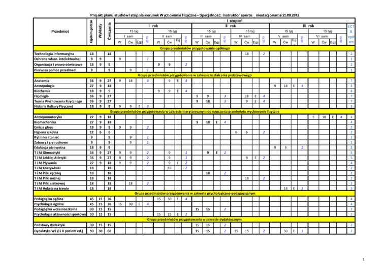 W Ćw Eg z W Ćw Egz IV sem W Ćw Egz V sem W Ćw Grupa przedmiotów przygotowania ogólnego Technologia informacyjna Ochrona własn. intelektualnej Organizacja i prawo oświatowe Pierwsza pomoc przedmed. 18 9 18 9 9 9 18 Anatomia Antropologia Biochemia Fizjologia Teoria Wychowania Fizycznego Historia Kultury Fizycznej 36 27 18 36 36 18 9 9 9 9 9 9 Antropomotoryka Biomechanika Emisja głosu Higiena szkolna Rytmika i taniec Zabawy i gry ruchowe Edukacja zdrowotna T i M Gimnastyki T i M Lekkiej Atletyki T i M Pływania T i M Koszykówki T i M Piłki ręcznej T i M Piłki nożnej T i M Piłki siatkowej T i M Hokeja na trawie 27 27 18 12 9 9 18 36 36 27 18 18 18 18 18 9 9 9 6 Pedagogika ogólna Psychologia ogólna Pedagogika wczesnoszkolna Psychologia aktywności sportowej 45 45 30 30 15 15 15 15 Podstawy dydaktyki 30 15 27 9 18 18 9 9 9 9 E 4 27 9 9 3 18 E 4 27 9 18 3 9 E 4 9 9 9 E 3 Grupa przedmiotów przygotowania w zakresie merytorycznym do nauczania przedmiotu wychowanie fizyczne 18 18 9 18 E 4 9 9 9 2 6 6 6 2 9 9 1 9 9 1 9 9 27 9 9 2 9 1 9 E 2 27 9 9 2 9 1 9 E 2 18 9 9 2 9 E 2 18 18 2 18 18 2 18 18 2 18 18 2 18 Grupa przedmiotów przygotowania w zakresie psychologiczno-pedagogicznym 30 15 30 E 4 30 15 30 E 4 15 15 15 2 15 15 15 E 2 Grupa przedmiotów przygotowania w zakresie dydaktycznym 15 15 15 2 Dydaktyka WF (I i II poziom ed.) 90 30 60 9 9 9 9 18 9 9 9 ECT 15 tyg Eg z S VI sem W Ćw Egz ECTS Egz III sem 15 tyg ECTS Ćw II sem 15 tyg ECTS W 15 tyg ECTS I sem 15 tyg ECTS 15 tyg ECTS Ćwiczenia Wykłady Przedmiot Ogółem godzin Projekt planu studiów I stopnia kierunek W ychowanie Fizyczne - Specjalność: Instruktor sportu _ niestacjonarne 25.09.2012 I stopień I rok II rok III rok 2 9 9 2 1 Grupa przedmiotów przygotowania w zakresie kształcenia podstawowego 3 9 E 4 15 15 2 15 15 2 em 2 1 2 1 1 9 ogół 18 E 7 4 4 7 7 3 4 9 9 18 2 E 3 18 E 4 4 4 2 2 1 1 2 5 5 4 2 2 2 2 3 4 4 2 2 2 30 E 3 7 1 Grupa przedmiotów - Specjalność Instruktor sportu Zajęcia specjalistyczne Teoria sportu Fizjologia wysiłku fizycznego Biochemia wysiłku fizycznego 150 44 33 22 45 11 11 11 105 33 22 11 Wykłady monograficzne Sporty różne i gry regionalne 27 36 27 36 Blok przedmiotów przyrodniczych Blok przedmiotów humanistycznych Teoria sportu/GKK* Język obcy Proseminarium dyplomowe 27 27 27 27 27 72 9 9 9 15 11 15 11 2 2 15 11 11 11 Grupa przedmiotów do wyboru 30 22 22 E 18 1 18 2 9 9 18 18 4 18 4 1 2 18 60 E 18 4 E 9 1 18 18 11 3 3 3 60 2 2 3 3 3 2 I stopień 156 2 234 2 28 Eg W Ćw 66 214 4 280 4 z 32 W Ćw 83 236 2 319 2 Egz 60 514 Historia kultury fizycznej Psychologia ogólna IV sem 30 W Ćw 47 197 4 244 4 Egz ECT 15 tyg 30 V sem 15 tyg Eg W Ćw 80 185 4 265 4 z 60 563 1558 VI sem ECTS 78 Egz III sem III rok 15 tyg ECTS Ćw 15 tyg ECTS W II sem ECTS I sem II rok 15 tyg ECTS I rok 15 tyg Suma punktów ECTS w roku akadem. Liczba godzin w roku akadem. Razem godzin na II stopniu studiów Egzaminy 11 30 W Ćw 69 147 3 216 3 Egz S ECTS Obciążenie semestralne / ECTS Liczba godzin w semestrze Liczba egzaminów w semestrze 1 3 17 1 5 2 60 Ćwiczenia Przedmiot Wykłady Razem 3 60 70 3 4 2 9 30 30 60 60 60 60 70 70 60 60 1558 423 1135 2 1 3 E Ogółem godzin Prakt. psychol. – pedagog. Prakt. dydakt. w sz. podstaw. Prakt. dydakt. asystencka - sz. podst Obóz letni Obóz zimowy (narciarski/snowb.) 11 6 3 2 3 Egzamin dyplomowy Praktyki i obozy 30 6 1 9 18 72 15 2 9 9 3 4 3 ogółe 30 180 180 60 481 Anatomia T i M Gimnastyki Fizj ologia Antropologia Antropomotoryka Biochemia Biomechanika Teoria WF Teoria Sportu Zaj ęcia specj alistyczne T i M LA Dydaktyka WF Egzamin dyplomowy Język obcy T i M Gier zespołowych T i M Pływania Psychologia aktywności sportowej m Pedagogika ogólna 2
