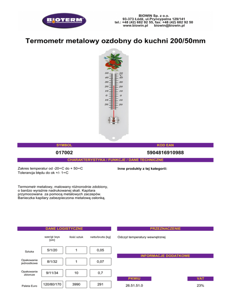 Termometr metalowy ozdobny do kuchni 200/50mm SYMBOL KOD EAN 017002 5904816910988 CHARAKTERYSTYKA / FUNKCJE / DANE TECHNICZNE Zakres temperatur od -20°C do + 50°C Tolerancja błędu do ok +/- 1°C Inne produkty z tej kategorii: Termometr metalowy, malowany różnorodnie zdobiony, o bardzo wyraźnie nadrukowanej skali. Kapilara przymocowana za pomocą metalowych zaczepów. Banieczka kapilary zabezpieczona metalową osłonką. DANE LOGISTYCZNE Sztuka PRZEZNACZENIE szer/gł /wys [cm] Ilość sztuk netto/brutto [kg] 5/1/20 1 0,05 Odczyt temperatury wewnętrznej INFORMACJE DODATKOWE Opakowanie jednostkowe 8/1/32 1 0,07 Opakowanie zbiorcze 9/11/34 10 0,7 Paleta Euro 120/80/170 3990 291 PKWiU VAT 26.51.51.0 23%
