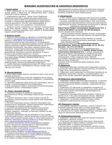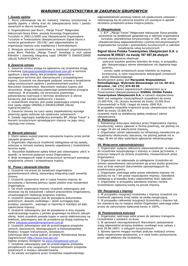 WARUNKI UCZESTNICTWA W ZAKUPACH GRUPOWYCH I. Zasady ogólne 1. Biuro zobowiązuje się do realizacji imprezy turystycznej w sposób zgodny z ofertą oraz do zabezpieczenia ilości i jakości zawartych w ofercie świadczeń. 2. Organizatorem jest Biuro „ Margo Travel” Małgorzata Hałuszczak-Sowa Które posiada Koncesję Organizatora Turystyki nr 290/11/2005 oraz Ubezpieczenie Organizatora Turystyki w Towarzystwie Ubezpieczeniowym Signal Iduna o numerze generalnym: 201156 i jest odpowiedzialne za organizację imprezy oraz współpracę z kontrahentami. 3. Niniejsze warunki uczestnictwa w imprezach organizowanych przez Biuro Podróży „Margo Travel” określają w nich udział Klientów i stanowią integralną część UMOWY O ŚWIADCZENIE USŁUG TURYSTYCZNYCH. II. Zawarcie umowy 1. Zawarcie umowy polega na zgłoszeniu się Uczestnika drogą e-mailową ([email protected]) w terminie zgodnym z daną ofertą. Nie przesłanie zgłoszenia w wymaganym terminie jest równoznaczne z przepadnięciem kuponu. Uczestnik ma obowiązek podpisać umowę o świadczenie usług turystycznych zgodnie z postanowieniami punktu II Warunków Uczestnictwa. Warunkiem realizacji kuponu jest otrzymanie drogą mailową pisemnego potwierdzenia przyjęcia rezerwacji. W przypadku nie otrzymania pisemnego potwierdzenia rezerwacji w terminie określonym w ofercie konieczny jest kontakt telefoniczny z biurem. 2. Uczestnikiem imprezy jest osoba podpisująca umowę oraz inne osoby objęte UMOWĄ O ŚWIADCZENIE USŁUG TURYSTYCZNYCH. 3. Zawarcie Umowy na rzecz osoby niepełnoletniej wymaga pisemnej zgody rodziców lub opiekunów ustawowych. 4. Zasady regulujące współpracę pomiędzy BP „Margo Travel” a biurami turystycznymi sprzedającymi imprezy na jego rzecz, regulują inne umowy. III. Warunki płatności 1. Klient opłaca wyjazd poprzez wykupienie kuponu przez portal zakupów grupowych. 2. Organizator dopuszcza możliwość odstępstwa od tej zasady, wówczas w Umowie zostaną zawarte uzgodnione z Uczestnikiem terminy wpłat. 3. Wszystkie dodatkowe opłaty klient jest zobowiązany uiścić w sposób i w terminie podanym przez Organizatora. 4. Brak wymaganych wpłat w oznaczonych terminach powoduje wygaśniecie umowy i przepadnięcie kuponu. IV. Prawa i obowiązki klientów. 1. Uczestnik ma prawo do świadczeń organizatora gwarantowanych ofertą, stanowiącą integralną część zawartej Umowy. 2. Uczestnik uprawniony jest w czasie trwania imprezy do korzystania z fachowej pomocy opieki pilotów oraz rezydentów Organizatora. 3. Od chwili rozpoczęcia imprezy Uczestnik zobowiązany jest stosować się do wskazówek i zaleceń pracowników Organizatora, umożliwiających realizację programu imprezy. 4. Uczestnik zobowiązany jest do posiadania dokumentów podróżnych, dowodu osobistego i jeżeli wymagają tego przepisy, paszportu , ważnego co najmniej 6 miesięcy od daty zakończenia imprezy. 5. Uczestnik zobowiązany jest do posiadania w dniu wyjazdu wydrukowanego kuponu z portalu grupowego na którym zakupił ofertę. Jeżeli uczestnik posiada kupon w wersji elektronicznej na telefonie, zobowiązany jest do przesłania go drogą mailową na adres [email protected] 6. Uczestnik zobowiązany jest do przestrzegania przepisów celnych, dewizowych, obowiązujących w Rzeczypospolitej Polskiej i krajach tranzytowych, docelowych. Informacje takie można pobrać ze strony Ministerstwa Spraw Zagranicznych http://www.msz.gov.pl/ Ogólne przepisy dostępne na www.margotravel.com.pl 7. Uczestnik zobowiązany jest do przestrzegania przepisów porządkowych oraz związanych z bezpieczeństwem przepisów pożarowych w miejscu zakwaterowania. 8. Za szkody wyrządzone przez Uczestnika niepełnoletniego odpowiedzialność ponoszą rodzice lub opiekunowie ustawowi i zobowiązują się do pokrycia kosztów ich usunięcia w sposób określony przepisami prawa miejsca pobytu. V. Ubezpieczenia 1. B.P. ,,Margo Travel” Małgorzata Hałuszczak Sowa posiada zezwolenie na działalność gospodarczą w zakresie organizatora turystyki, pośrednictwa turystycznego nr 290, oraz umowę ubezpieczeniową odpowiedzialności cywilnej koncesjonowanych organizatorów turystyki i pośredników turystycznych w zakresie świadczenia usług turystycznych Signal Iduna Polska Towarzystwo Ubezpieczeń S.A. o numerze M 256321 na kwotę 167 097,84 złotych Umowa ubezpieczenia obejmuje: -pokrycie kosztów powrotu klientów do kraju, w przypadku gdy Ubezpieczający wbrew obowiązkowi nie zapewnia tego powrotu, - zwrotu wpłat wniesionych przez klientów za imprezę turystyczną, w razie niewykonania zobowiązań umownych przez Ubezpieczającego. Beneficjentem polisy jest Marszałek Województwa Dolnośląskiego. Wybrzeże Słowackiego 12-14, 50-411 Wrocław , tel. (71) 374 90 00 3. Uczestnicy imprez zagranicznych ubezpieczeni są w Towarzystwie Ubezpieczeniowym SIGNAL IDUNA Polska Towarzystwo Ubezpieczeń S.A. w ramach ubezpieczenia NNW (od następstw nieszczęśliwych wypadków) do kwoty 15.000 PLN, i KL (koszty leczenia) do kwoty 10.000 Euro (równowartość w PLN) i bagaż do kwoty 1000 PLN W przypadku wyjazdów krajowych grupy ubezpieczane są od NNW do kwoty 10.000.PLN. Uczestnik może za dodatkową opłatą zwiększyć zakres ubezpieczenia. VI. Reklamacje 1. Reklamacje dotyczące realizacji przez Organizatora imprezy turystycznej, należy zgłaszać w formie pisemnej, nie później niż w ciągu 30 dni od zakończenia imprezy. 2. Organizator udzieli odpowiedzi na reklamację niezwłocznie po wyjaśnieniu okoliczności zdarzenia, nie później jednak niż w ciągu 30 dni od daty wpłynięcia zgłoszenia reklamacyjnego. VII. Wyłączenie odpowiedzialności 1. Organizator wyłącza całkowicie odpowiedzialność w stosunku do Uczestnika rezygnującego z imprezy w czasie jej trwania, z przyczyn leżących po stronie Uczestnika, niezawinionych przez Organizatora. 2. Organizator nie odpowiada za odstąpienie Uczestnika od umowy spowodowane zatrzymanie
