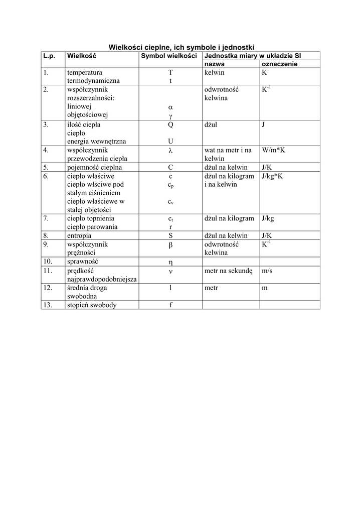 Wielkości cieplne, ich symbole i jednostki L.p. Wielkość 1. temperatura termodynamiczna współczynnik rozszerzalności: liniowej objętościowej ilość ciepła ciepło energia wewnętrzna współczynnik przewodzenia ciepła pojemność cieplna ciepło właściwe ciepło włsciwe pod stałym ciśnieniem ciepło właściewe w stałej objętości ciepło topnienia ciepło parowania entropia współczynnik prężności sprawność prędkość najprawdopodobniejsza średnia droga swobodna stopień swobody 2. 3. 4. 5. 6. 7. 8. 9. 10. 11. 12. 13. Symbol wielkości T t α γ Q U λ C c cp Jednostka miary w układzie SI nazwa oznaczenie kelwin K odwrotność kelwina K-1 dżul J wat na metr i na kelwin dżul na kelwin dżul na kilogram i na kelwin W/m*K J/K J/kg*K cv ct r S β dżul na kilogram J/kg dżul na kelwin odwrotność kelwina J/K K-1 η ν metr na sekundę m/s l metr m f
