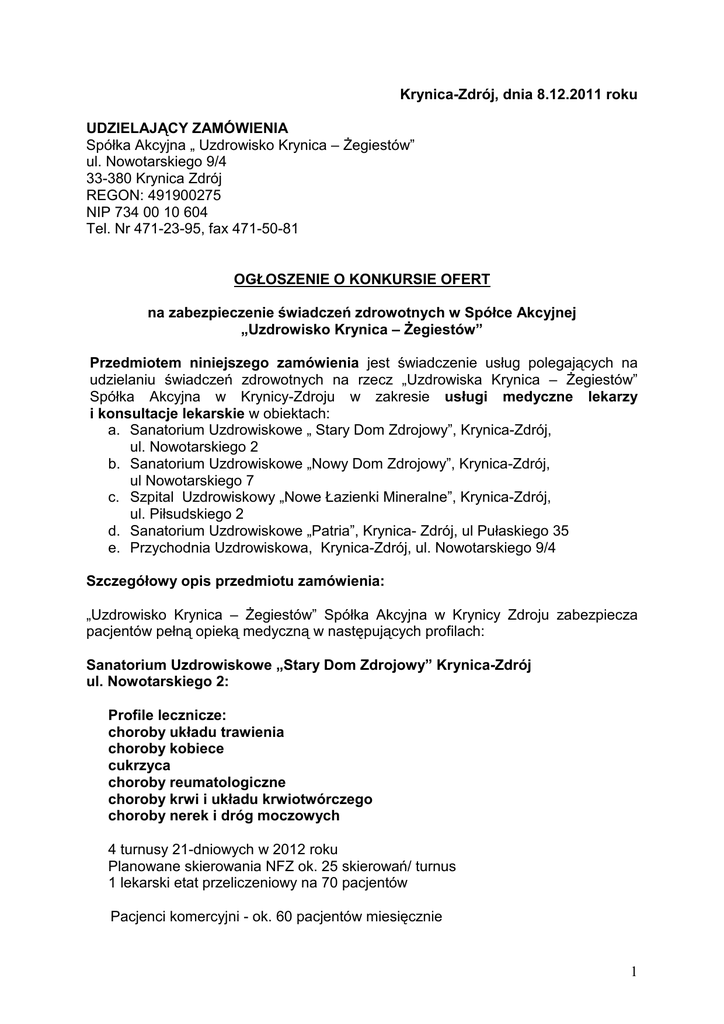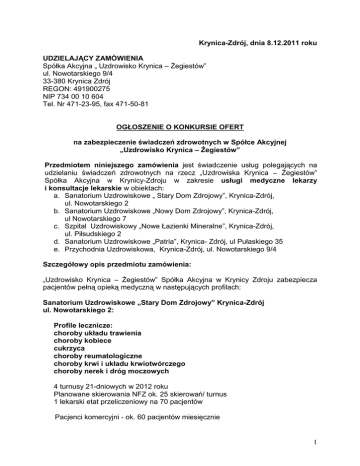 Krynica-Zdrój, dnia 8.12.2011 roku UDZIELAJĄCY ZAMÓWIENIA Spółka Akcyjna „ Uzdrowisko Krynica – Żegiestów” ul. Nowotarskiego 9/4 33-380 Krynica Zdrój REGON: 491900275 NIP 734 00 10 604 Tel. Nr 471-23-95, fax 471-50-81 OGŁOSZENIE O KONKURSIE OFERT na zabezpieczenie świadczeń zdrowotnych w Spółce Akcyjnej „Uzdrowisko Krynica – Żegiestów” Przedmiotem niniejszego zamówienia jest świadczenie usług polegających na udzielaniu świadczeń zdrowotnych na rzecz „Uzdrowiska Krynica – Żegiestów” Spółka Akcyjna w Krynicy-Zdroju w zakresie usługi medyczne lekarzy i konsultacje lekarskie w obiektach: a. Sanatorium Uzdrowiskowe „ Stary Dom Zdrojowy”, Krynica-Zdrój, ul. Nowotarskiego 2 b. Sanatorium Uzdrowiskowe „Nowy Dom Zdrojowy”, Krynica-Zdrój, ul Nowotarskiego 7 c. Szpital Uzdrowiskowy „Nowe Łazienki Mineralne”, Krynica-Zdrój, ul. Piłsudskiego 2 d. Sanatorium Uzdrowiskowe „Patria”, Krynica- Zdrój, ul Pułaskiego 35 e. Przychodnia Uzdrowiskowa, Krynica-Zdrój, ul. Nowotarskiego 9/4 Szczegółowy opis przedmiotu zamówienia: „Uzdrowisko Krynica – Żegiestów” Spółka Akcyjna w Krynicy Zdroju zabezpiecza pacjentów pełną opieką medyczną w następujących profilach: Sanatorium Uzdrowiskowe „Stary Dom Zdrojowy” Krynica-Zdrój ul. Nowotarskiego 2: Profile lecznicze: choroby układu trawienia choroby kobiece cukrzyca choroby reumatologiczne choroby krwi i układu krwiotwórczego choroby nerek i dróg moczowych 4 turnusy 21-dniowych w 2012 roku Planowane skierowania NFZ ok. 25 skierowań/ turnus 1 lekarski etat przeliczeniowy na 70 pacjentów Pacjenci komercyjni - ok. 60 pacjentów miesięcznie 1 Szpital Uzdrowiskowy „Nowe Łazienki Mineralne”, Krynica-Zdrój, ul. Piłsudskiego 2 Uzdrowiskowe Leczenie Sanatoryjne Dorosłych Profile lecznicze: choroby układu nerwowego choroby układu trawienia choroby kobiece cukrzyca choroby reumatologiczne choroby krwi i układu krwiotwórczego choroby nerek i dróg moczowych 16 turnusów 21-dniowych w 2012 roku Planowane skierowania NFZ ok. 70 skierowań/ turnus 1 lekarski etat przeliczeniowy na 70 pacjentów Pacjenci komercyjni - ok. 20 pacjentów miesięcznie Szpital Uzdrowiskowy „Nowe Łazienki Mineralne”, Krynica-Zdrój, ul. Piłsudskiego 2 Uzdrowiskowe Leczenie Szpitalnego Dorosłych Profile lecznicze: choroby układu nerwowego choroby układu trawienia choroby kobiece cukrzyca choroby reumatologiczne choroby krwi i układu krwiotwórczego choroby nerek i dróg moczowych 16 turnusów 21 - dniowych w 2012 roku Planowane skierowania NFZ ok. 45 skierowań/ turnus 1 lekarski etat przeliczeniowy na 50 pacjentów Sanatorium Uzdrowiskowe „Nowy Dom Zdrojowy”, Krynica-Zdrój, ul. Nowotarskiego7 Profile lecznicze: choroby układu nerwowego choroby układu trawienia choroby kobiece cukrzyca choroby reumatologiczne choroby krwi i układu krwiotwórczego choroby nerek i dróg moczowych 16 turnusów 21-dniowych w 2012 roku Planowane skierowania NFZ ok. 140 skierowań/ turnus 1 lekarski etat przeliczeniowy na 70 pacjentów 2 Pacjenci komercyjni - ok. 80 pacjentów miesięcznie Sanatorium Uzdrowiskowe „Patria”, Krynica-Zdrój, ul. Pułaskiego 35 Profile lecznicze: choroby układu trawienia choroby kobiece cukrzyca choroby reumatologiczne choroby krwi i układu krwiotwórczego choroby nerek i dróg moczowych 16 turnusów 21-dniowych w 2012 roku Planowane skierowania NFZ ok. 32 skierowań/ turnus 1 lekarski etat przeliczeniowy na 70 pacjentów Pacjenci komercyjni - ok. 48 pacjentów miesięcznie Przychodnia Uzdrowiskowa, Krynica-Zdrój, ul. Nowotarskiego 9/4 Profile lecznicze: choroby układu nerwowego choroby układu trawienia choroby kobiece cukrzyca choroby reumatologiczne choroby krwi i układu krwiotwórczego choroby nerek i dróg moczowych Planowane ilości na rok 2012: a) Pacjenci ambulatoryjni z NFZ - ok. 6 370 osobodni b) Pacjenci komercyjni - 360 porad 2. Usługi wykonywane będą z należytą starannością w pomieszczeniach udzielającego zamówienia i przy użyciu jego materiałów, środków oraz sprzętu. 3. Przedmiotem postępowania jest wybór lekarza, który będzie świadczył na rzecz Zamawiającego świadczenia zdrowotne. Do świadczeń tych należy w szczególności: a) Badanie stanu zdrowia kuracjuszy skierowanych na turnus przez NFZ– wstępne - do 24 godzin od przyjazdu, w toku kuracji dwukrotnie oraz końcowe 24 godziny przed wyjazdem w obiektach opisanych w pkt 1 a- f b) Zobowiązanie do przyjęcia pacjentów przyjeżdżających ze skierowaniem na turnus NFZ w możliwie najkrótszym terminie, nie dłuższym jednak niż 24 godziny od przyjazdu, bez możliwości uzyskania czasu wolnego za przepracowane w takim trybie godziny c) Zapewnienie codziennej (od poniedziałku do piątku) możliwości uzyskania porady lekarskiej przez pacjentów, będących pod opieką danego lekarza d) w przypadku kuracjuszy komercyjnych wstępne i końcowe w obiektach opisanych w pkt 1 a-f . 3 e) Udzielanie porad lekarskich kuracjuszom Spółki w zastępstwie lekarza prowadzącego, po uzgodnieniu zastępstwa z Dyrektorem Pionu. f) Wydawanie opinii i orzeczeń lekarskich dla kuracjuszy Spółki. g) Prowadzenie obowiązującej dokumentacji w historii choroby pacjenta a także rzetelne sporządzanie kart informacyjnych z przebiegu leczenia w Spółce. h) Prowadzenie zebrań informacyjnych w drugim lub najpóźniej trzecim dniu po przyjeździe dla pacjentów NFZ - na polecenie Dyrektora Pionu i) Dostosowanie przepisywanych zabiegów do możliwości ich wydawania przez działy zabiegowe Spółki zgodnie z koszykiem świadczeń gwarantowanych w poszczególnych jednostkach chorobowych. j) W przypadku podejrzenia, że pacjent pod wpływem alkoholu przebywa w budynku szpitala uzdrowiskowego lub sanatorium lekarz jest zobowiązany do zbadania pacjenta przy pomocy alkomatu a w razie odmowy zanotowania swoich uwag o stanie pacjenta i zaistniałym podejrzeniu w historii choroby Badanie ma nastąpić ni