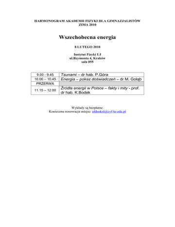 HARMONOGRAM AKADEMII FIZYKI DLA GIMNAZJALISTÓW ZIMA 2010 Wszechobecna energia 8 LUTEGO 2010 Instytut Fizyki UJ ul.Reymonta 4, Kraków sala 055 9.00 - 9.45 10.00 – 10.45 PRZERWA 11.15 – 12.00 Tsunami – dr hab. P.Góra Energia – pokaz doświadczeń – dr M. Gołąb Źródła energii w Polsce – fakty i mity - prof. dr hab. K.Bodek Wykłady są bezpłatne. Konieczna rezerwacja miejsc: [email protected]