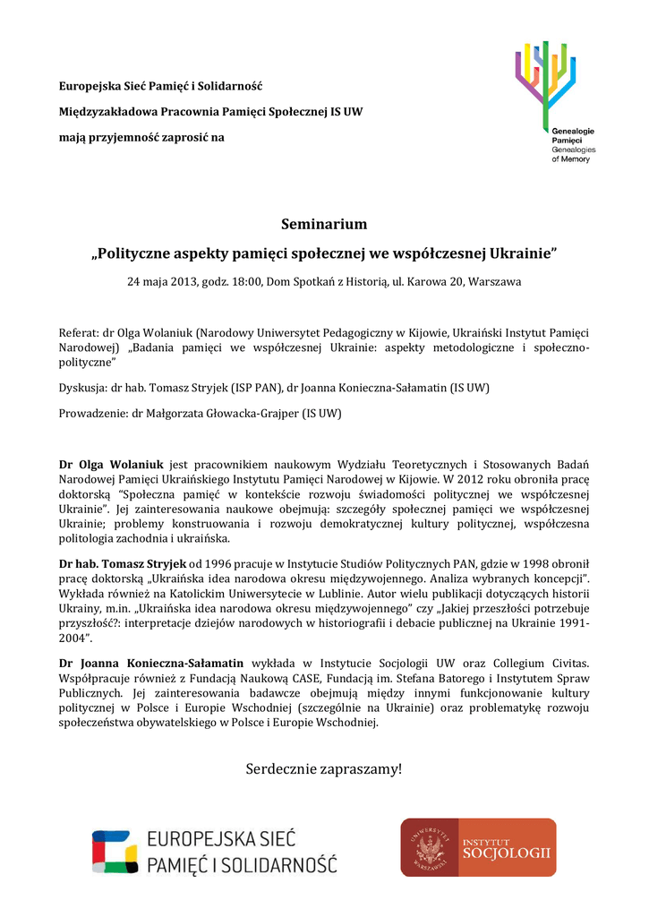 Europejska Sieć Pamięć i Solidarność Międzyzakładowa Pracownia Pamięci Społecznej IS UW mają przyjemność zaprosić na Seminarium „Polityczne aspekty pamięci społecznej we współczesnej Ukrainie” 24 maja 2013, godz. 18:00, Dom Spotkań z Historią, ul. Karowa 20, Warszawa Referat: dr Olga Wolaniuk (Narodowy Uniwersytet Pedagogiczny w Kijowie, Ukraiński Instytut Pamięci Narodowej) „Badania pamięci we współczesnej Ukrainie: aspekty metodologiczne i społecznopolityczne” Dyskusja: dr hab. Tomasz Stryjek (ISP PAN), dr Joanna Konieczna-Sałamatin (IS UW) Prowadzenie: dr Małgorzata Głowacka-Grajper (IS UW) Dr Olga Wolaniuk jest pracownikiem naukowym Wydziału Teoretycznych i Stosowanych Badań Narodowej Pamięci Ukraińskiego Instytutu Pamięci Narodowej w Kijowie. W 2012 roku obroniła pracę doktorską “Społeczna pamięć w kontekście rozwoju świadomości politycznej we współczesnej Ukrainie”. Jej zainteresowania naukowe obejmują: szczegóły społecznej pamięci we współczesnej Ukrainie; problemy konstruowania i rozwoju demokratycznej kultury politycznej, współczesna politologia zachodnia i ukraińska. Dr hab. Tomasz Stryjek od 1996 pracuje w Instytucie Studiów Politycznych PAN, gdzie w 1998 obronił pracę doktorską „Ukraińska idea narodowa okresu międzywojennego. Analiza wybranych koncepcji”. Wykłada również na Katolickim Uniwersytecie w Lublinie. Autor wielu publikacji dotyczących historii Ukrainy, m.in. „Ukraińska idea narodowa okresu międzywojennego” czy „Jakiej przeszłości potrzebuje przyszłość?: interpretacje dziejów narodowych w historiografii i debacie publicznej na Ukrainie 19912004”. Dr Joanna Konieczna-Sałamatin wykłada w Instytucie Socjologii UW oraz Collegium Civitas. Współpracuje również z Fundacją Naukową CASE, Fundacją im. Stefana Batorego i Instytutem Spraw Publicznych. Jej zainteresowania badawcze obejmują między innymi funkcjonowanie kultury politycznej w Polsce i Europie Wschodniej (szczególnie na Ukrainie) oraz problematykę rozwoju społeczeństwa obywatelskiego w Polsce i Europie Wschodniej. Serdecznie zapraszamy!
