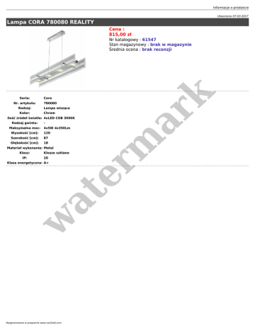 Informacje o produkcie Utworzono 07-03-2017 Lampa CORA 780080 REALITY Cena : 815,00 zł Seria: Nr. artykułu: Rodzaj: Kolor: Cora 780080 Lampa wisząca Chrom er m ar k Nr katalogowy : 61547 Stan magazynowy : brak w magazynie Średnia ocena : brak recenzji Ilość źródeł światła: 4xLED COB 3000K Rodzaj gwintu: Maksymalna moc: 4x5W 4x350Lm Wysokość [cm]: 120 Szerokość [cm]: 87 Głębokość [cm]: 18 Materiał wykonania: Metal Klosz: IP: Klosze szklane 20 w at Klasa energetyczna: A+ Wygenerowano w programie www.oscGold.com