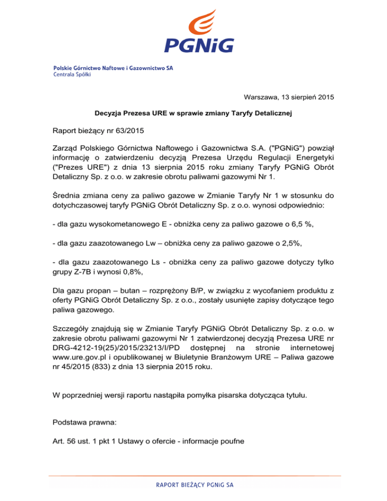 ("Prezes URE") z dnia 13 sierpnia 2015 roku zmiany Taryfy PGNiG Obrót