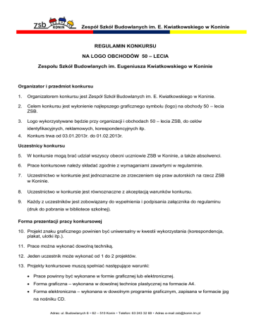 Zespół Szkół Budowlanych im. E. Kwiatkowskiego w Koninie REGULAMIN KONKURSU NA LOGO OBCHODÓW 50 – LECIA Zespołu Szkół Budowlanych im. Eugeniusza Kwiatkowskiego w Koninie Organizator i przedmiot konkursu 1. Organizatorem konkursu jest Zespół Szkół Budowlanych im. E. Kwiatkowskiego w Koninie. 2. Celem konkursu jest wyłonienie najlepszego graficznego symbolu (logo) na obchody 50 – lecia ZSB. 3. Logo wykorzystywane będzie przy organizacji i obchodach 50 – lecia ZSB, do celów identyfikacyjnych, reklamowych, korespondencyjnych itp. 4. Konkurs trwa od 03.01.2013r. do 01.02.2013r. Uczestnicy konkursu 5. W konkursie mogą brać udział wszyscy obecni uczniowie ZSB w Koninie, a także absolwenci. 6. Prace konkursowe należy składać zgodnie z wymaganiami zawartymi w regulaminie. 7. Uczestnictwo w konkursie jest jednoznaczne ze zrzeczeniem się praw autorskich na rzecz ZSB w Koninie. 8. Uczestnictwo w konkursie jest równoznaczne z akceptacją warunków konkursu. 9. Każdy z uczestników jest zobowiązany do wypełnienia i podpisania załącznika do regulaminu (druk do pobrania w bibliotece szkolnej). Forma prezentacji pracy konkursowej 10. Projekt znaku graficznego powinien być uniwersalny w kwestii wykorzystania (korespondencja, plakat, ulotki itp.). 11. Prace można wykonać dowolną techniką. 12. Jeden uczestnik może wykonać od 1 do 2 projektów. 13. Projekty konkursowe muszą spełniać następujące warunki: Prace powinny być wykonane w formie graficznej lub elektronicznej. Forma graficzna – wykonana w dowolnej technice plastycznej na formacie A4. Forma elektroniczna – wykonana w dowolnym programie graficznym, zapisana w formacie jpg na nośniku CD. Adres: ul. Budowlanych 6 62 – 510 Konin Telefon: 63 243 32 68 Adres e-mail [email protected] Zespół Szkół Budowlanych im. E. Kwiatkowskiego w Koninie 14. Logo winno charakteryzować się następującymi cechami: być czytelne i łatwe do zapamiętania, być łatwo identyfikowane z obchodami 50 – lecia ZSB, wzbudzać pozytywne emocje, prace powinny być oryginalne, niedopuszczalne jest stosowanie form już istniejących. 15. Prace należy składać w zamkniętych kopertach, każda powinna być opatrzona danymi autora ( imię, nazwisko, klasa) do dnia 01.02.2013r. w bibliotece Zespołu Szkół Budowlanych w Koninie. Do prac należy dołączyć druk będący załącznikiem do niniejszego regulaminu. Prace konkursowe, które nie spełniają wymagań, o których mowa w regulaminie konkursu, nie będą podlegały ocenie Komisji Konkursowej. 16. Kryteria oceny prac konkursowych: Zgodność projektu z danymi szkoły. Oryginalność znaku, łatwość zapamiętywania. Czytelność i funkcjonalność projektu. Estetyka wykonania projektu. Rozstrzygnięcie konkursu 17. W wyniku postępowania konkursowego Komisja Konkursowa wyłania zwycięzcę. 18. Dla zwycięzcy przewidziano atrakcyjną nagrodę. 19. Planowany termin ogłoszenia wyników – 05.02.2013r. na tablicy ogłoszeń poświęconej konkursom z okazji 50 – lecia ZSB oraz na stronie internetowej szkoły. 20. Zwycięzca zostanie nagrodzony podczas uroczystego zakończenia roku szkolnego 2012/2013. 21. Komisja zastrzega sobie prawo do przedłużenia konkursu oraz nie wybrania pracy zwycięskiej. Wszelkich informacji udziela pani Małgorzata Powidzka Adres: ul. Budowlanych 6 62 – 510 Konin Telefon: 63 243 32 68 Adres e-mail [email protected]