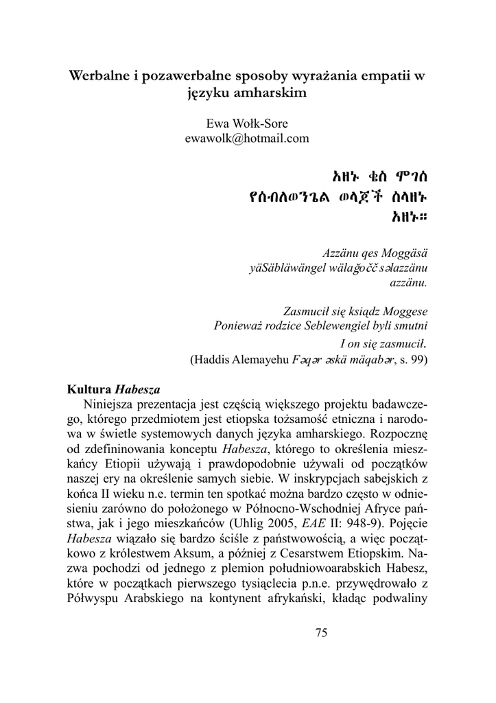 Werbalne i pozawerbalne sposoby wyrażania empatii w języku amharskim Ewa Wołk-Sore [email protected] A A Azzänu qes Moggäsä yäSäbläwängel wälaêoóó sélazzänu azzänu. Zasmucił się ksiądz Moggese Ponieważ rodzice Seblewengiel byli smutni I on się zasmucił. (Haddis Alemayehu Féqér éskä mäqabér, s. 99) Kultura Habesza Niniejsza prezentacja jest częścią większego projektu badawczego, którego przedmiotem jest etiopska tożsamość etniczna i narodowa w świetle systemowych danych języka amharskiego. Rozpocznę od zdefininowania konceptu Habesza, którego to określenia mieszkańcy Etiopii używają i prawdopodobnie używali od początków naszej ery na określenie samych siebie. W inskrypcjach sabejskich z końca II wieku n.e. termin ten spotkać można bardzo często w odniesieniu zarówno do położonego w Północno-Wschodniej Afryce państwa, jak i jego mieszkańców (Uhlig 2005, EAE II: 948-9). Pojęcie Habesza wiązało się bardzo ściśle z państwowością, a więc początkowo z królestwem Aksum, a później z Cesarstwem Etiopskim. Nazwa pochodzi od jednego z plemion południowoarabskich Habesz, które w początkach pierwszego tysiąclecia p.n.e. przywędrowało z Półwyspu Arabskiego na kontynent afrykański, kładąc podwaliny 75 cywilizacji nazywanej obecnie przez świat zewnętrzny cywilizacją etiopską, w samej zaś Etiopii wciąż znanej jako yäHabäša bahél – „kultura Habesza”. Termin ten jest źródłem nazwy państwa Abisynia, używanego powszechnie do połowy XX wieku, zanim zastąpiło ją biblijne określenie greckiego pochodzenia Etiopia (Mantel-Niećko 1987). U schyłku XIX wieku wraz ze znacznym poszerzeniem granic Cesarstwa Etiopskiego w jego skład weszło wiele sąsiadujących z nim dotychczas grup etnicznych, a termin Habesza, używany przez wieki głównie przez Etiopczyków o amharsko-tygrejskim pochodzeniu, rozszerzył swoje znaczenie i zaczął być stosowany przez wszystkich mieszkańców państwa etiopskiego chcących zaznaczyć swoją przynależność do kultury Habesza. Jednocześnie kultura ta wzbogacona została wieloma elementami charakterystycznymi dla kultur wcielonych przez nią ludów. Moim celem jest określenie różnych aspektów kultury Habesza u progu trzeciego tysiąclecia, w czasie dotykającej wszystkie cywilizacje, także etiopską, wszechobecnej globalizacji. W tym przedsięwzięciu jako materiał źródłowy posłuży głównie współczesna literatura amharska, język mediów oraz przykłady mowy potocznej pozyskane w wyniku wywiadów oraz uczestniczącej obserwacji. Język amharski pozostaje w Etiopii lingua franca, a liczba jego użytkowników stale rośnie: staje się on pierwszym językiem coraz większej liczby młodych Etiopczyków, którzy nie mówią już macierzystymi językami swoich rodziców (Meyer, Richter 2003). Jest również najchętniej wybierany jako drugi język, służąc komunikacji międzykulturowej i stając się jednym z wyznaczników kultury Habesza. Język a emocje Dotychczas w ramach tego projektu analizowane były różne sposoby werbalizowania pozytywnych i negatywnych emocji w perspektywie społecznej wśród użytkowników języka amharskiego. Emocje stanowią bowiem bardzo ważną część naszego życia jako jednostek, a werbalne i pozawerbalne sposoby ich okazywania są wizytówką społeczeństwa, do którego należymy, mówiąc wiele o wartościach, jakim ono hołduje (Athanasiadou, Tabakowska 1998, 76 Harkins, Wierzbicka 2001, Santangelo 2006). Emocje wyrażane w różny sposób w różnych kulturach i językach są również integralną częścią językowego obrazu świata charakterystycznego dla tych kultur (Bartmiński 2006). Świadomość faktu, że świat składa się z wielu jego obrazów kształtowanych przez rozmaite czynniki ma wielkie znaczenie w relacjach międzykulturowych i prowadzi do głębszej wiedzy pragmatycznej, a także zrozumienia różnych zachowań. Walter Ong zauważył na przykład, że cywilizacje, w których słowo mówione kształtowało świadomość społeczną, takie jak cywilizacja etiopska, różnią się od tych, u których podstaw legło słowo pisane tym, że są bardziej empatyczne i zaangażowane (Ong 1999). Badania naukowe dotyczące emocji w języku amharskim rozpoczął dopiero niedawno Mengistu Amberber (2001) rozważaniami nad tym, czy proponowane przez Annę Wierzbicką uniwersalia językowe opisujące emocje potwierdzają się w języku amharskim. Autor, prezentując ogólny obraz semantyki niektórych wyrażeń emotywnych, wyłonił semantyczne jednostki elementarne definiujące pozytywne i negatywne emocje w języku amharskim za pomocą rdzeni: (1) dässätä ‘cieszyć się’ oraz (2) A azzänä ‘smucić się’ Ściśle związana z pozytywnymi i negatywnymi emocjami empatia jest bardzo ważna w kulturze Habesza: wspieranie bliskich w smutku (A azzän), a także dzielenie ich radości ( dässéta) jest wręcz uważane za obowiązek każdego sąsiada, przyjaciela, nie wspominając o osobach bardzo bliskich, jak członkowie rodziny. Empatia po amharsku Współodczuwanie widoczne jest w Etiopii na każdym kroku, począwszy od powszechnego wspierania datkami ubogich. Znamienne określanie żebraków jako: (3) yäne béte ‘ktoś taki jak ja, w moim rodzaju’ 77 jest niczym innym jak właśnie wyrazem empatii i niejako emocjonalnego dzielenia ich losu. Służący wywołaniu empatii charakterystyczny gest wyciągniętej ręki, bądź też inny imitujący wkładanie do ust kawałka yndżery (etiopskiego chleba) z towarzyszącym temu charakterystycznym cmokaniem nigdy nie pozostaje bez odpowiedzi w postaci jałmużny lub przynajmniej formuły: (4) EA !"#/% égziabher yéstéh/š ‘niech Bóg Ci m/f da’ wypowiadanej w przekonaniu, iż kiedy los się odwróci, Bóg nie pozostanie obojętny na potrzeby osoby wymawiającej te słowa. Fortuna bowiem kołem się toczy i co jest dziś twoim udziałem, jutro może sp