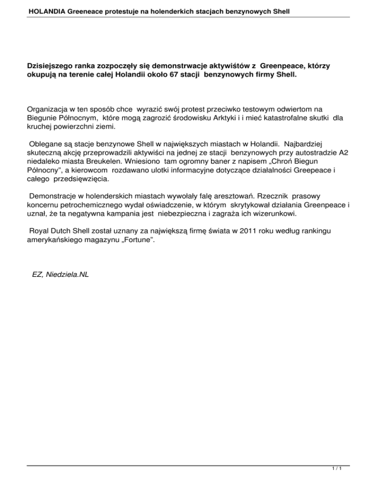 HOLANDIA Greeneace protestuje na holenderkich stacjach benzynowych Shell Dzisiejszego ranka zozpoczęły się demonstrwacje aktywiśtów z Greenpeace, którzy okupują na terenie całej Holandii około 67 stacji benzynowych firmy Shell. Organizacja w ten sposób chce wyrazić swój protest przeciwko testowym odwiertom na Biegunie Północnym, które mogą zagrozić środowisku Arktyki i i mieć katastrofalne skutki dla kruchej powierzchni ziemi. Oblegane są stacje benzynowe Shell w największych miastach w Holandii. Najbardziej skuteczną akcję przeprowadzili aktywiści na jednej ze stacji benzynowych przy autostradzie A2 niedaleko miasta Breukelen. Wniesiono tam ogromny baner z napisem „Chroń Biegun Północny”, a kierowcom rozdawano ulotki informacyjne dotyczące działalności Greepeace i całego przedsięwzięcia. Demonstracje w holenderskich miastach wywołały falę aresztowań. Rzecznik prasowy koncernu petrochemicznego wydał oświadczenie, w którym skrytykował działania Greenpeace i uznał, że ta negatywna kampania jest niebezpieczna i zagraża ich wizerunkowi. Royal Dutch Shell został uznany za największą firmę świata w 2011 roku według rankingu amerykańskiego magazynu „Fortune”. EZ, Niedziela.NL 1/1