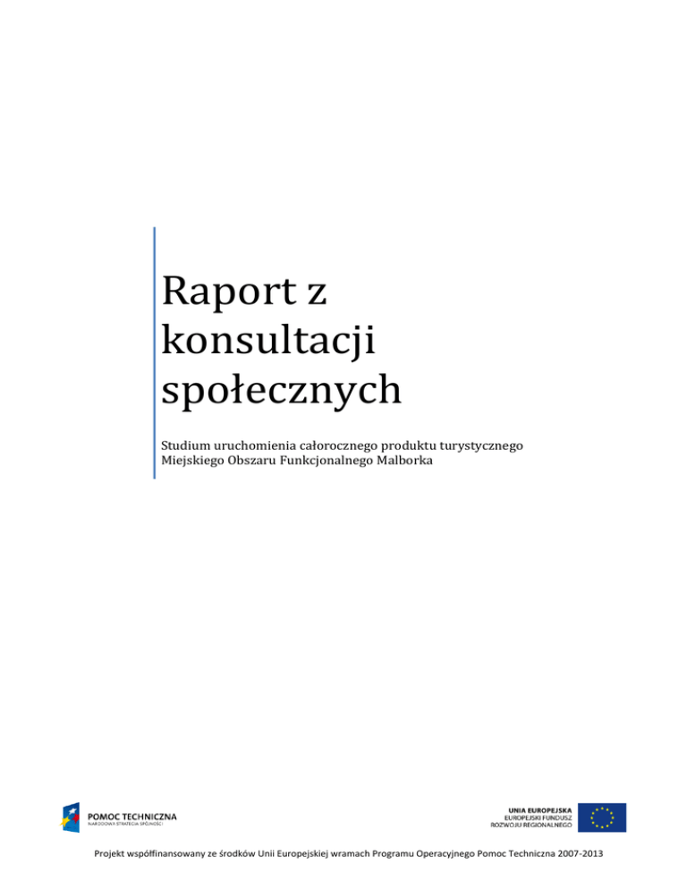 Raport z konsultacji społecznych Studium uruchomienia całorocznego produktu turystycznego Miejskiego Obszaru Funkcjonalnego Malborka Projekt współfinansowany ze środków Unii Europejskiej wramach Programu Operacyjnego Pomoc Techniczna 2007-2013 Raport z konsultacji społecznych w ramach Studium uruchomienia całorocznego produktu turystycznego Miejskiego Obszaru Funkcjonalnego Malborka Podsumowanie spotkań konsultacyjnych W dniach 22 – 25 kwietnia 2014 roku odbyły się spotkania konsultacyjne dla mieszkańców terenów MOF, przedstawicieli JST, biznesu oraz organizacji pozarządowych. Harmonogram spotkań był następujący: 22 kwietnia- spotkanie konsultacyjne w Nowym Stawie, 23 kwietnia- spotkanie konsultacyjne w Malborku (Urząd Miasta Malborka) dla Partnerów Miasta Malbork, Gminy Malbork oraz Powiatu Malborskiego, 24 kwietnia- spotkanie konsultacyjne w Starym Polu, 25 kwietnia- spotkanie konsultacyjne w Sztumie (Urząd Miasta i Gminy Sztum) dla Partnerów Miasta i Gminy Sztum oraz Powiatu Sztumskiego. Spotkania konsultacyjne zgromadziły w sumie 206 uczestników i miały na celu omówienie głównych założeń oraz strategicznych kierunków działania przyjętych w projekcie Studium uruchomienia całorocznego produktu turystycznego Miejskiego Obszaru Funkcjonalnego Malborka na szlaku dziedzictwa kulturowego Polskich Zamków Gotyckich. Podczas spotkań konsultacyjnych przedstawiony został proponowany zakres Studium, przeanalizowano wspólnie z uczestnikami spotkań potencjał turystyczny MOF Malborka, obejmujący m.in. opis najważniejszych atrakcji turystycznych poszczególnych Partnerów obszaru funkcjonalnego, przedyskutowano już istniejące produkty turystyczne, ich powiązania i interakcje. W ramach spotkań konsultacyjnych przeprowadzono również analizę SWOT branży (potencjału) turystycznej MOF Malborka, która miała być podstawą sprecyzowania koncepcji stworzenia całorocznego produktu turystycznego MOF Malborka na szlaku dziedzictwa kulturowego Polskich Zamków Gotyckich. Uczestnikom spotkań rozdane zostały formularze konsultacyjne, na których mogli oni wskazać swoje uwagi, przemyślenia i propozycje dotyczące uruchomienia całorocznego produktu turystycznego. Spotkania konsultacyjne prowadzone były przez przedstawicieli formy TREK, Doradztwo i szkolenia, będącej ówczesnym wybranym wykonawcą Studium i miały one formę prezentacji połączonej z debatą publiczną. Podczas spotkań konsultacyjnych nawiązała się konstruktywna dyskusja dotycząca głównie wstępnie przyjętych założeń odnośnie uruchomienia całorocznego produktu turystycznego, m.in. w zakresie sieciowania nowego produktu z produktami już istniejącymi na terenie MOF Malborka, grup docelowych oraz proponowanej strategii marketingowej związanej z utworzeniem spójnej marki turystycznej MOF Malborka. Wszystkie działania i założenia Studium wynikały wprost z opracowanej Strategii Rozwoju MOF Malborka na lata 2014-2020 i stanowiły poniekąd jej program wykonawczy. Projekt współfinansowany ze środków Unii Europejskiej wramach Programu Operacyjnego Pomoc Techniczna 2007-2013 2 3 Raport z konsultacji społecznych w ramach Studium uruchomienia całorocznego produktu turystycznego Miejskiego Obszaru Funkcjonalnego Malborka W ramach przeprowadzonych konsultacji nie wpłynęły żadne uwagi i propozycje zmian co do założeń Studium (zgłoszone na formularzach konsultacyjnych). Ewentualne wątpliwości i pytania wyjaśnione zostały podczas spotkań konsultacyjnych, dodatkowe uwagi, przemyślenia i propozycje przedstawione podczas dyskusji miały być uwzględnione w samym dokumencie. Załącznik nr 1- Prezentacje ze spotkań konsultacyjnych Projekt współfinansowany ze środków Unii Europejskiej wramach Programu Operacyjnego Pomoc Techniczna 2007-2013