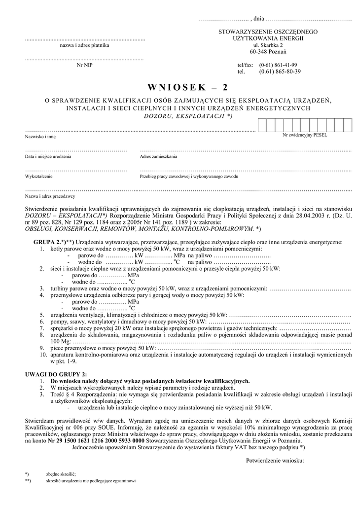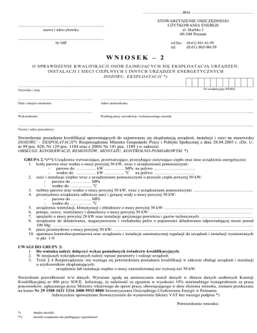 ……………………. , dnia ……………………….…………… STOWARZYSZENIE OSZCZĘDNEGO UśYTKOWANIA ENERGII ............................................................................ nazwa i adres płatnika ul. Skarbka 2 60-348 Poznań ........................................................................... Nr NIP tel/fax: (0-61) 861-41-99 tel. (0.61) 865-80-39 WNIOSEK – 2 O SPRAWDZE NIE KWALIFIKACJI OSÓB ZAJMUJĄCYCH SIĘ E KSPLOAT ACJĄ URZĄDZE Ń, INST ALACJI I SIE CI CIE PLNYCH I INNYCH URZĄDZE Ń E NE RGE T YCZNYCH DOZOR U, E KSPLOA TA CJ I *) …………………....................................................................................................................... Nr ewidencyjny PESEL Nazwisko i imię …………………………………………… ………………………………………………………………………………………….... Data i miejsce urodzenia Adres zamieszkania …………………………………………… ………………………………………………………………………………………….... Wykształcenie Przebieg pracy zawodowej i wykonywanego zawodu ………………………………………………....………………………………………………………………………………………….... Nazwa i adres pracodawcy Stwierdzenie posiadania kwalifikacji uprawniających do zajmowania się eksploatacją urządzeń, instalacji i sieci na stanowisku DOZORU – EKSPOLATACJI*) Rozporządzenie Ministra Gospodarki Pracy i Polityki Społecznej z dnia 28.04.2003 r. (Dz. U. nr 89 poz. 828, Nr 129 poz. 1184 oraz z 2005r Nr 141 poz. 1189 ) w zakresie: OBSŁUGI, KONSERWACJI, REMONTÓW, MONTAśU, KONTROLNO-POMIAROWYM. *) GRUPA 2.*)**) Urządzenia wytwarzające, przetwarzające, przesyłające zuŜywające ciepło oraz inne urządzenia energetyczne: 1. kotły parowe oraz wodne o mocy powyŜej 50 kW, wraz z urządzeniami pomocniczymi: - parowe do ………….. kW ………….. MPa na paliwo ……………………….. - wodne do ………….. kW ………….. oC na paliwo ……………………….. 2. sieci i instalacje cieplne wraz z urządzeniami pomocniczymi o przesyle ciepła powyŜej 50 kW: - parowe do ………….. MPa - wodne do …..……….. oC 3. turbiny parowe oraz wodne o mocy powyŜej 50 kW, wraz z urządzeniami pomocniczymi: ………………………………….. 4. przemysłowe urządzenia odbiorcze pary i gorącej wody o mocy powyŜej 50 kW: - parowe do ………….. MPa - wodne do …..……….. oC 5. urządzenia wentylacji, klimatyzacji i chłodnicze o mocy powyŜej 50 kW: ……………………………………………………. 6. pompy, ssawy, wentylatory i dmuchawy o mocy powyŜej 50 kW: …………………………………..………………………… 7. spręŜarki o mocy powyŜej 20 kW oraz instalacje spręŜonego powietrza i gazów technicznych: ……………………………… 8. urządzenia do składowania, magazynowania i rozładunku paliw o pojemności składowania odpowiadającej masie ponad 100 Mg: …………………………………..…………………………………..…………………………………..…………….. 9. piece przemysłowe o mocy powyŜej 50 kW: …………………………………..…………………………………..…………… 10. aparatura kontrolno-pomiarowa oraz urządzenia i instalacje automatycznej regulacji do urządzeń i instalacji wymienionych w pkt. 1-9. UWAGI DO GRUPY 2: 1. Do wniosku naleŜy dołączyć wykaz posiadanych świadectw kwalifikacyjnych. 2. W miejscach wykropkowanych naleŜy wpisać parametry i rodzaje urządzeń. 3. Treść § 4 Rozporządzenia: nie wymaga się potwierdzenia posiadania kwalifikacji w zakresie obsługi urządzeń i instalacji u uŜytkowników eksploatujących: - urządzenia lub instalacje cieplne o mocy zainstalowanej nie wyŜszej niŜ 50 kW. Stwierdzam prawidłowość w/w danych. WyraŜam zgodę na umieszczenie moich danych w zbiorze danych osobowych Komisji Kwalifikacyjnej nr 006 przy SOUE. Informuję, Ŝe naleŜność za egzamin w wysokości 10% minimalnego wynagrodzenia za pracę pracowników, ogłaszanego przez Ministra właściwego do spraw pracy, obowiązującego w dniu złoŜenia wniosku, zostanie przekazana na konto Nr 29 1500 1621 1216 2000 5933 0000 Stowarzyszenia Oszczędnego UŜytkowania Energii w Poznaniu. Jednocześnie upowaŜniam Stowarzyszenie do wystawienia faktury VAT bez naszego podpisu *) Potwierdzenie wniosku: *) **) zbędne skreślić; skreślić urządzenia nie podlegające egzaminowi ……………………… dnia ……………………….…………… PROTOKÓŁ NR ………………… .................................................. (pieczęć komisji) …………………...................................................................................................................... Nr ewidencyjny PESEL Nazwisko i imię Dokument toŜsamości: Seria i Nr dokumentu toŜsamości WYNIK EGZAMINU: Lp. TEMATYKA EGZAMINU 1. Przepisy dotyczące przyłączania urządzeń i instalacji do sieci, dostarczania paliw i energii oraz prowadzenia ruchu i eksploatacji urządzeń, instalacji i sieci. Przepisy i zasady postępowania przy programowaniu pracy urządzeń, instalacji i sieci z uwzględnieniem zasad racjonalnego uŜytkowania paliw i energii. Przepisy dotyczące eksploatacji, wymagań w zakresie prowadzenia dokumentacji technicznej i eksploatacyjnej oraz stosowania instrukcji eksploatacji urządzeń, instalacji i sieci. Przepisy dotyczące budowy urządzeń, instalacji i sieci oraz normy i warunki techniczne, jakim powinny odpowiadać te urządzenia, instalacje i sieci. Przepisy, zasady i wymagania w zakresie BHP oraz ochrony przeciwpoŜarowej z uwzględnieniem umiejętności udzielania pierwszej pomocy oraz wymagań ochrony środowiska. Zasady i instrukcje postępowania w razie aw