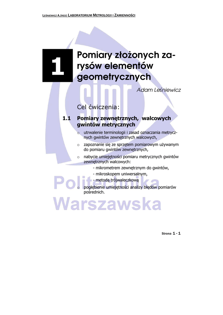 LEŚNIEWICZ A.(RED) LABORATORIUM METROLOGII I ZAMIENNOŚCI 1 Pomiary złoŜonych zarysów elementów geometrycznych Adam Leśniewicz Cel ćwiczenia: 1.1 Pomiary zewnętrznych, walcowych gwintów metrycznych o utrwalenie terminologii i zasad oznaczania metrycznych gwintów zewnętrznych walcowych, o zapoznanie się ze sprzętem pomiarowym używanym do pomiaru gwintów zewnętrznych, o nabycie umiejętności pomiaru metrycznych gwintów zewnętrznych walcowych: - mikrometrem zewnętrznym do gwintów, - mikroskopem uniwersalnym, - metodą trójwałeczkową o pogłębienie umiejętności analizy błędów pomiarów pośrednich. Strona 1-1 LABORATORIUM METROLOGII I ZAMIENNOŚCI ĆWICZENIE 1 1.1 Pomiary zewnętrznych walcowych gwintów metrycznych 1.1.1 Wymagane wiadomości znajomość ogólnych zasad oznaczania i tolerowania metrycznych gwintów zewnętrznych walcowych, ogólna znajomość metod pomiaru wybranych parametrów gwintów, ogólna znajomość przyrządów pomiarowych do gwintów. Zasady oznaczania i tolerowania metrycznych gwintów zewnętrznych walcowych Podstawowymi parametrami gwintu zewnętrznego walcowego są: d – średnica zewnętrzna (znamionowa) gwintu (średnica wyobraŜalnego walca opisanego na wierzchołkach występów gwintu zewnętrznego, d1 – średnica wewnętrzna gwintu (średnica wyobraŜalnego walca wpisanego w dna bruzd gwintu zewnętrznego), d2 – średnica podziałowa gwintu (φ wyobraŜalnego walca, którego oś pokrywa się z osią gwintu, a jego tworzące przecinają bruzdę gwintu w ten sposób, Ŝe w kaŜdej płaszczyźnie osiowej rzut prostokątny odcinka tworzącej, odpowiadającego szerokości bruzdy na oś gwintu, ma długość równą połowie wartości nominalnej podziałki lub prościej, jest to średnica wyobraŜalnego walca, którego tworzące przecinają gwint tak, Ŝe szerokość bruzdy i szerokość występu są sobie równe), P – podziałka gwintu (odległość osiowa między odpowiadaStrona 1-2 POMIARY ZŁOśONYCH ZARYSÓW ELEMENTÓW GEOMETRYCZNYCH jącymi sobie punktami najbliŜszych jednoimiennych boków gwintu; w przypadku gwintu jednokrotnego podziałka gwintu jest równa skokowi), α – kąt gwintu (kąt zarysu), kąt między róŜnoimiennymi bokami zarysu. Podstawowe wymiary gwintów metrycznych określa zarys nominalny, tj. zarys określony dla gwintów zewnętrznych i wewnętrznych, do którego odnoszą się wymiary nominalne względem, których odnosi się odchyłki graniczne (rysunek 1.1.1). Rysunek 1.1.1 Zarys nominalny gwintów metrycznych Ponadto przy opisie gwintu naleŜy podać: • • • kierunek pochylenia linii linii śrubowej gwintu (gwint prawy gwint, który się wkręca przy obrocie zgodnym z ruchem wskazówek zegara, gwint lewy - gwint, który się wkręca przy obrocie przeciwnym do ruchu wskazówek zegara, oznaczany symbolem LH), krotność gwintu (liczba występów w płaszczyźnie prostopadłej do osi walca, na którym utworzono gwint; dla gwintów wielokrotnych oprócz podziałki podaje się skok gwintu Ph , określany zaleŜnością: Ph = n P gdzie: n - krotność gwintu, P - podziałka gwintu), długość skręcenia gwintu (długość osiowa, na której w złączu gwintowym moŜe występować styk gwintu zewnętrznego i wewnętrznego; wyróŜnia się trzy grupy długości skręcenia: małą - S, średnią - N i duŜą – L), Strona 1-3 LABORATORIUM METROLOGII I ZAMIENNOŚCI • ĆWICZENIE 1 klasę gwintu (zbiór znormalizowanych pól tolerancji gwintów, przyporządkowanych odpowiednim przedziałom długości skręcenia w ten sposób, Ŝe zbiór odpowiada w przybliŜeniu jednakowemu poziomowi dokładności i trudności wykonania gwintów; wyróŜnia się 3 klasy gwintów: dokładną, średniodokładną i zgrubną). Tolerowanie gwintów zewnętrznych, zgodnie z PN-ISO 9652:2001, sprowadza się do określenia: • • • pola tolerancji średnicy podziałowej d2, pola tolerancji średnicy zewnętrznej d, odchyłki górnej średnicy wewnętrznej d1 (maksymalnej wartości średnicy d1). Dla porównania, w gwintach wewnętrznych naleŜy określić: • • • pole tolerancji średnicy podziałowej D2, pole tolerancji średnicy wewnętrznej D1, odchyłki dolnej średnicy zewnętrznej D (minimalnej wartości średnicy D). Norma określa 3 szeregi tolerancji dla średnicy zewnętrznej (oznaczone cytrami 4, 6 lub 8) i 7 szeregów tolerancji dla średnicy podziałowej (oznaczonych cytrami od 3 do 9), przy czym dokładność gwintu maleje wraz ze wzrostem numeru klasy jego wykonania. Ponadto norma określa połoŜenie pól tolerancji tych średnic, przez podanie odchyłek podstawowych dla pięciu pasowań (oznaczonych literami d, e, f, g, h), od najbardziej ujemnej dla pasowania d do O dla pasowania h. NaleŜy podkreślić, Ŝe dla danego gwintu połoŜenie pól tolerancji wszystkich średnic, a więc wartości odchyłek podstawowych muszą być takie same. Oznacza to jednakowe przesunięcie pola tolerancji całego zarysu względem zarysu nominalnego (rysunek 1.1.2). Wybór pola tolerancji gwintu zaleŜy od długości skręcenia i klasy gwintu. Wartości tolerancji średnicy podziałowej d1 zaleŜą od szeregu tolerancji, średnicy znamionowej (zewnętrznej) d i podziałki P gwintu. Strona 1-4 POMIARY ZŁOśONYCH ZARYSÓW ELEMENTÓW GEOMETRYCZNYCH Wartości tolerancji średnicy zewnętrznej d zaleŜą od szeregu tolerancji i skoku gwintu, natomiast wartość odchyłek podstawowych zaleŜy wyłącznie od skoku gwintu. Rysunek 1.1.2 Położenie pól tolerancji dla gwintu zewnętrznego Polska Norma nie przewiduje oddzielnego tolerowania skoku i kąta zarysu w gwintach metrycznych ogólnego przeznaczenia. Odchyłki tych wymiarów są niejako ukryte w tolerancji średnicy podziałowej. Pełne oznaczenie metrycznego gwintu walcowego zewnętrznego zawiera: a. symbol literowy M, b. wartość średnicy znamionowej i podziałki (w przypadku gwintów wielokrotnych - skoku) w [mm] rozdzielone znakiem x (w przypadku gwintu zw