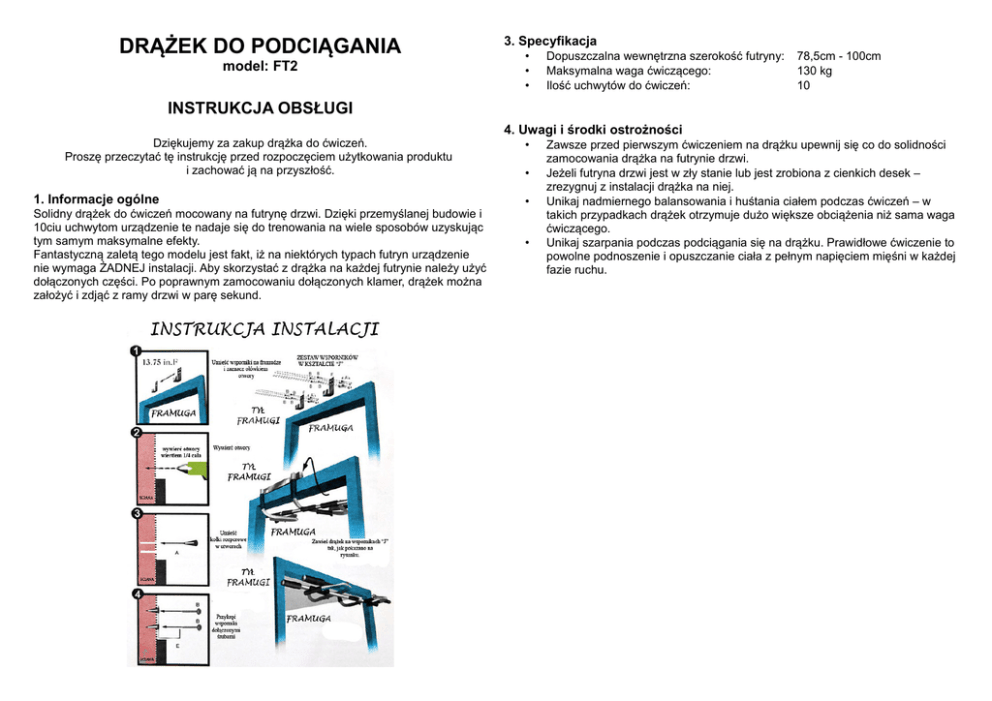 DRĄŻEK DO PODCIĄGANIA model: FT2 3. Specyfikacja • • • Dopuszczalna wewnętrzna szerokość futryny: Maksymalna waga ćwiczącego: Ilość uchwytów do ćwiczeń: 78,5cm - 100cm 130 kg 10 INSTRUKCJA OBSŁUGI 4. Uwagi i środki ostrożności Dziękujemy za zakup drążka do ćwiczeń. Proszę przeczytać tę instrukcję przed rozpoczęciem użytkowania produktu i zachować ją na przyszłość. 1. Informacje ogólne Solidny drążek do ćwiczeń mocowany na futrynę drzwi. Dzięki przemyślanej budowie i 10ciu uchwytom urządzenie te nadaje się do trenowania na wiele sposobów uzyskując tym samym maksymalne efekty. Fantastyczną zaletą tego modelu jest fakt, iż na niektórych typach futryn urządzenie nie wymaga ŻADNEJ instalacji. Aby skorzystać z drążka na każdej futrynie należy użyć dołączonych części. Po poprawnym zamocowaniu dołączonych klamer, drążek można założyć i zdjąć z ramy drzwi w parę sekund. • • • • Zawsze przed pierwszym ćwiczeniem na drążku upewnij się co do solidności zamocowania drążka na futrynie drzwi. Jeżeli futryna drzwi jest w zły stanie lub jest zrobiona z cienkich desek – zrezygnuj z instalacji drążka na niej. Unikaj nadmiernego balansowania i huśtania ciałem podczas ćwiczeń – w takich przypadkach drążek otrzymuje dużo większe obciążenia niż sama waga ćwiczącego. Unikaj szarpania podczas podciągania się na drążku. Prawidłowe ćwiczenie to powolne podnoszenie i opuszczanie ciała z pełnym napięciem mięśni w każdej fazie ruchu.