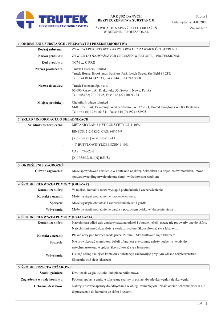 ARKUSZ DANYCH BEZPIECZEēSTWA SUBSTANCJI Strona 1 Data wydania: 4/08/2005 ĩYWICA DO NAJWYĩSZYCH OBCIĄĩEē W BETONIE - PROFESSIONAL Zmiana Nr 2 1. OKREĝLENIE SUBSTANCJI / PREPARATU I PRZEDSIĉBIORSTWA Rodzaj substancji ĩYWICA EPOKSYDOWO - AKRYLOWA BEZ ZAWARTOĝCI STYRENU Nazwa produktu: ĩYWICA DO NAJWYĩSZYCH OBCIĄĩEē W BETONIE – PROFESSIONAL Kod produktu: Nazwa producenta: Nazwa dostawcy: Miejsce produkcji TCM … C PRO Trutek Fasteners Limited Trutek House, Brooklands Business Park, Leigh Street, Sheffield S9 2PR Tel.: +44 0114 242 333, Faks: +44 0114 242 3300 Trutek Fasteners Sp. z o.o. 05-090 Raszyn, Al. Krakowska 55, SĊkocin Nowy, Polska Tel: +48 (22) 701 93 25, Fax: +48 (22) 701 93 24 Chemfix Products Limited Mill Street East, Dewsbury, West Yorkshire, WF12 9BQ, United Kingdom (Wielka Brytania) Tel.: +44 (0) 1924 461341, Faks: +44 (0) 1924 458995 2. SKŁAD / INFORMACJA O SKŁADNIKACH Składniki niebezpieczne: METAKRYLAN 2-HYDROKSYETYLU 1-10% EINECS: 212-782-2 CAS: 868-77-9 [Xi] R36/38; [WraĪliwoĞü] R43 . 4-T-BUTYLOWINYLOBENZEN 1-10% CAS: 1746-23-2 [Xi] R36/37/38; [N] R51/53 3. OKREĝLENIE ZAGROĩEē Główne zagroĪenia: MoĪe spowodowaü uczulenie w kontakcie ze skórą. Szkodliwa dla organizmów morskich, moĪe spowodowaü długotrwałe ujemne skutki w Ğrodowisku wodnym. 4. ĝRODKI PIERWSZEJ POMOCY (OBJAWY) Kontakt ze skórą: W miejscu kontaktu moĪe wystąpiü podraĪnienie i zaczerwienienie. Kontakt z oczami: MoĪe wystąpiü podraĪnienie i zaczerwienienie. SpoĪycie: Wdychanie: MoĪe wystąpiü obolałoĞü i zaczerwienienie ust i gardła. MoĪe wystąpiü podraĪnienie gardła z poczuciem ucisku w klatce piersiowej.. 4. ĝRODKI PIERWSZEJ POMOCY (DZIAŁANIA) Kontakt ze skórą: Natychmiast zdjąü całą zanieczyszczoną odzieĪ i obuwie, jeĪeli jeszcze nie przywarły one do skóry. Natychmiast zmyü duĪą iloĞcią wody z mydłem. Skonsultowaü siĊ z lekarzem. Kontakt z oczami: SpoĪycie: Płukaü oczy pod bieĪącą wodą przez 15 minut. Skonsultowaü siĊ z lekarzem. Nie prowokowaü wymiotów. JeĪeli ofiara jest przytomna, naleĪy podaü litr wody do natychmiastowego wypicia. Skonsultowaü siĊ z lekarzem. Wdychanie: Usunąü ofiarĊ z miejsca kontaktu z substancją zachowując przy tym własne bezpieczeĔstwo. Skonsultowaü siĊ z lekarzem 5. ĝRODKI PRZECIWPOĩAROWE ĝrodki gaĞnicze: ZagroĪenia w razie kontaktu: Ochrona straĪaków: Dwutlenek wĊgla. Alkohol lub piana polimerowa. Podczas spalania emituje toksyczne spaliny w postaci dwutlenku wĊgla / tlenku wĊgla. NaleĪy stosowaü aparaty do oddychania w obiegu zamkniĊtym. Nosiü odzieĪ ochronną w celu nie dopuszczenia do kontaktu ze skórą i oczami. [c.d …] ARKUSZ DANYCH BEZPIECZEēSTWA SUBSTANCJI Data wydania: 4/08/2005 Strona 2 ĩYWICA DO NAJWYĩSZYCH OBCIĄĩEē W BETONIE - PROFESSIONAL 6. ĝRODKI STOSOWANE W OKOLICZNOĝCIACH UWOLNIENIA SUBSTANCJI WSKUTEK WYPADKU Osobiste Ğrodki ostroĪnoĞci: Dane dotyczące ochrony osobistej dostĊpne są w p.8 ADBS. ĝrodowiskowe Ğrodki ostroĪnoĞci: Procedura usuwania: Nie naleĪy wylewaü do kanalizacji ani do rzek. Powstrzymywaü rozlewanie stosując tamowanie. PrzemieĞciü do zamykanego, oznakowanego kontenera ratowniczego w celu usuniĊcia go właĞciwymi metodami. 7. PRZEMIESZCZANIE I SKŁADOWANIE Przemieszczanie: Warunki składowania: W obszarze przemieszczania naleĪy zapewniü odpowiednią wentylacjĊ. Składowaü w chłodnym, dobrze wentylowanym miejscu. Trzymaü z daleka od Ĩródeł zapłonu. Nie trzymaü w bezpoĞrednim słoĔcu. Odpowiednie opakowanie: MoĪna przechowywaü wyłącznie w oryginalnym opakowaniu. 8. ĝRODKI KONTROLI RYZYKA / OCHRONA OSOBISTA ĝrodki techniczne: Ochrona dróg oddechowych: Ochrona rąk: NaleĪy zapewniü odpowiednią wentylacjĊ w miejscu przechowywania. Ochrona dróg oddechowych nie jest konieczna. RĊkawice ochronne. Ochrona oczu: Okulary ochronne. Ochrona skóry: OdzieĪ ochronna. 9. WŁAĝCIWOĝCI FIZYCZNE I CHEMICZNE Stan: Barwa: Zapach: Tempo wyparowywania: Utlenianie: RozpuszczalnoĞü w wodzie: Rozpuszczalna w: LepkoĞü: Temperatura wrzenia w °C Pasta Brązowa Charakterystyczny zapach Powolne Nie utlenia siĊ (według kryteriów EC) Nieco rozpuszczalna WiĊkszoĞci rozpuszczalników organicznych Lepka 198 Temperatura zapłonu °C: 80 GĊstoĞü wzglĊdna: 1,6 10. STABILNOĝû I REAKTYWNOĝû StabilnoĞü: Unikaü warunków takich, jak: NaleĪy unikaü materiałów : Stabilna w warunkach normalnych. MoĪe siĊ polimeryzowaü po wystawieniu na działanie Ğwiatła. BezpoĞrednie słoĔce. Gorąco. Płomienie. ĝrodki utleniające. Niebezpieczne produkty dekompozycji: Podczas spalania emituje toksyczne spaliny w postaci dwutlenku wĊgla / tlenku wĊgla. [c.d …] ARKUSZ DANYCH BEZPIECZEēSTWA SUBSTANCJI Data wydania: 4/08/2005 Strona 3 ĩYWICA DO NAJWYĩSZYCH OBCIĄĩEē W BETONIE - PROFESSIONAL 11. INFORMACJE TOKSYGOLOGICZNE Niebezpieczne składniki: METAKRYLAN 2-HYDROKSYETYLU IPR RAT LD50 1250 mg/kg ORL MUS LD50 3275 mg/kg ORL RAT LD50 5050 mg/kg ToksycznoĞü chroniczna: MoĪe spowodowaü uczulenie w miejscy kontaktu ze skórą. Drogi szkodliwego oddziaływania: Zob. p.4 ADBS opisujący drogi oddziaływania i związane z nimi objawy. 12. INFORMACJE EKOLOGICZNE MobilnoĞü: TrwałoĞü i rozkład: Potencjał bio-akumulatywny: Nierozpuszczalna w wodzie. Tylko trochĊ ulega biologicznemu rozkładowi. Brak danych. 13. OKOLICZNOĝCI ZWIĄZANE Z USUWANIEM SUBSTANCJI Operacje usuwania: NP.: D1 Zrzut na ziemiĊ lub pod ziemiĊ (np. na wysypisko, etc.) Zwraca siĊ uwagĊ uĪytkownika na moĪliwoĞü istnienia regionalnych lub krajowych regulacji dotyczących usuwania odpadów 14. INFORMACJE DORTYCZĄCE TRANSPORTU ADR / RID IMDG / IMO IATA / ICAO 15. INFORMACJE DOTYCZĄCE REGULACJI Symbole zagroĪeĔ: Frazy ryzyka: Substancja draĪniąca R43: MoĪe powodowaü uczulenie w miejscu kontaktu ze skórą. R52/53: Substancja szkodliwa dla organizmów wodnych, moĪe spowodowaü długotrwałe ujemne skutki w Ğro