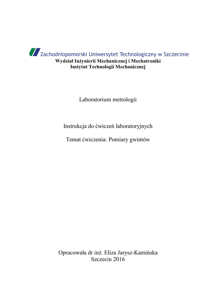 Wydział Inżynierii Mechanicznej i Mechatroniki Instytut Technologii Mechanicznej Laboratorium metrologii Instrukcja do ćwiczeń laboratoryjnych Temat ćwiczenia: Pomiary gwintów Opracowała dr inż. Eliza Jarysz-Kamińska Szczecin 2016 Pomiary gwintów Spis Treści Wprowadzenie........................................................................................................................2 1. Cel ćwiczenia .................................................................................................................2 2. Wymagany zakres wiedzy...............................................................................................2 3. Pytania kontrolne ............................................................................................................4 4. Przebieg ćwiczenia .........................................................................................................5 5. Sprawozdanie .................................................................................................................7 Literatura................................................................................................................................7 Wprowadzenie Niniejsze opracowanie powstało jako pomoc do ćwiczeń laboratoryjnych z Miernictwa warsztatowego, Metrologii i systemów pomiarowych, Metrologii oraz Podstaw metrologii realizowanych przez Studentów Wydziału Inżynierii Mechanicznej i Mechatroniki ZUT w Szczecinie. 1. Cel ćwiczenia Celem ćwiczenia jest poznanie technik pomiaru i oznaczania podstawowych parametrów gwintów oraz zdobycie umiejętności posługiwania się środkami pomiarowymi (narzędziami i urządzeniami pomiarowymi pomocniczymi) stosowanymi przy pomiarach gwintów. 2. Wymagany zakres wiedzy wiadomości podstawowe na temat gwintów Zależnie od zarysu gwintu w przekroju wzdłużnym przechodzącym przez jego os, rozróżnia się trzy zasadnicze rodzaje gwintów: gwinty trójkątne, trapezowe i okrągłe. Ze względu na symetrię zarysu gwinty możemy podzielić na: symetryczne i niesymetryczne, Gwint może być prawy, gdy dla obserwatora patrzącego wzdłuż osi gwintu oddalające się od niego zwoje gwintu przebiegają zgodnie z ruchem wskazówki zegarowej, albo lewy – gdy kierunek przebiegu zwojów jest przeciwny. Gwinty (znormalizowane) utworzone przez skojarzenie odpowiednio stopniowanego szeregu średnic z dobranym do każdej średnicy określonym skokiem gwintu noszą nazwę gwintów zwykłych. Gwinty o skokach mniejszych niż w gwintach zwykłych nazywają się drobnozwojowymi, a gwinty o skokach większych niż w gwintach zwykłych – grubozwojowymi. Inny podział gwintów ze względu na rodzaj pasowania dzieli je na gwinty ciasne i luźne. znajomość parametrów charakteryzujących gwinty i zależności występujących między nimi Głównymi wymiarami konstrukcyjnymi gwintu (Rys 1.) są: skok gwintu (P), kąt zarysu (), średnica podziałowa nominalna (d2 – gwintu zewnętrznego lub D2 – gwintu wewnętrznego), średnica zewnętrzna (d lub D), średnica wewnętrzna (d1 lub D1). 2 Dr inż. Eliza Jarysz-Kamińska Rys. 1 Wymiary gwintu [5] budowa, działanie i zastosowanie: suwmiarki, mikrometru do gwintów, wzornika grzebieniowego do gwintów. kryteria dokładności gwintów, zasady tolerowania i oceny poszczególnych grup wskaźników, Zgodnie z PN-ISO 965-1:2001 [6] dla gwintów metrycznych ogólnego przeznaczenia tolerowaniu podlegają następujące elementy gwintów: średnica wewnętrzna gwintu wewnętrznego – D1, średnica zewnętrzna gwintu zewnętrznego - d, średnica podziałowa D2 i d2. Jeżeli oznaczenia dwóch pól tolerancji dla średnicy podziałowej i średnicy wierzchołkowej (odpowiednio dla gwintów zewnętrznych i wewnętrznych) są takie same, nie jest konieczne powtarzanie symboli. Układ tolerancji gwintów obejmuje: zbiór szeregów tolerancji dla każdej z czterech średnic gwintów: D1 - 4,5,6,7,8 d - 4,6,8 D2 - 4,5,6,7,8 d2 - 3,4,5,6,7,8,9. zbiór położeń pól tolerancji (Rys. 2) : dla gwintów wewnętrznych - G i H, dla gwintów zewnętrznych - e, f, g, h. 3 Pomiary gwintów Rys. 2 Odchyłki podstawowe gwintu dla średnic 1-600 mm. [1] oznaczenie gwintów: Oznaczenie gwintu powinno zawierać: 1) oznaczenie wielkości gwintu, 2) oznaczenie pola tolerancji gwintu, oznaczenie pola tolerancji średnicy gwintu powinno zawierać: · symbol cyfrowy szeregu tolerancji średnicy gwintu, · symbol literowy położenia polo tolerancji (odchyłki podstawowej) średnicy gwintu. 3) wartość długości skręcenia w mm – podajemy w trzech grupach S-mała (tylko wówczas, gdy długość skręcenia jest mniejsza niż całkowita długość gwintu) Nśrednia i L- duża, Gwinty metryczne ogólnego przeznaczenia zgodnie z ISO 68-1[5], ISO 261 [6], ISO 262 [7], ISO 724 [8], ISO 965-2 [10], ISO 965-3 [11] oznacza się [9]: literą M i następującą po niej wartością średnicy znamionowej, znakiem x, literami Ph i wartością skoku, litery P i wartością podziałki, poziomej kreski i polem tolerancji. Średnica znamionowa, skok i podziałka wyrażone są w milimetrach. W przypadku gwintu lewego, na końcu oznaczenia gwintu należy dodać litery LH oddzielone poziomą kreską. Np. M20 x 1,5 ;gwint metryczny o średnicy znamionowej 20 mm i podziałce 1,5 mm. M20 ;gwint metryczny o średnicy znamionowej 20 mm i podziałce zwykłej. M20xPh3P1,5 – 6H/5g6g – S – LH; gwint metryczny dwukrotny (dwuzwojny) o średnicy znamionowej 20 mm, skoku 3mm. i podziałce 1,5 mm., wykonany w tolerancji 6H dla gwintu wewnętrznego i 5g6g dla gwintu zewnętrznego, o „małej” długości skręcenia, lewy 3. Pytania kontrolne 1) 2) 3) 4) 5) 6) 7) 8) Wymień zasadnicze rodzaje gwintów Wymień główne wymiary konstrukcyjne gwintów. Wymień z jakich elementów składa się oznaczenie gwintu. Wymień z jakich elementów składa się oznaczenie gwintu metrycznego. Wymień z jakich elementów składa się oznaczenie pola toler