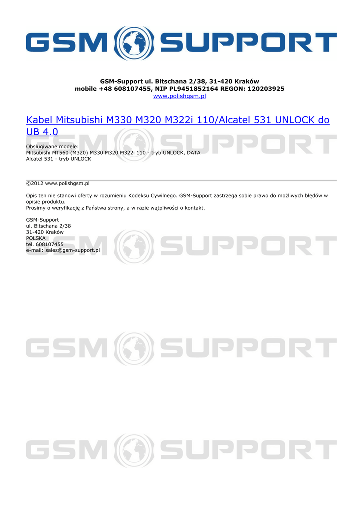 GSM-Support ul. Bitschana 2/38, 31-420 Kraków mobile +48 608107455, NIP PL9451852164 REGON: 120203925 www.polishgsm.pl Kabel Mitsubishi M330 M320 M322i 110/Alcatel 531 UNLOCK do UB 4.0 Obsługiwane modele: Mitsubishi MT560 (M320) M330 M320 M322i 110 - tryb UNLOCK, DATA Alcatel 531 - tryb UNLOCK ©2012 www.polishgsm.pl Opis ten nie stanowi oferty w rozumieniu Kodeksu Cywilnego. GSM-Support zastrzega sobie prawo do możliwych błędów w opisie produktu. Prosimy o weryfikację z Państwa strony, a w razie wątpliwości o kontakt. GSM-Support ul. Bitschana 2/38 31-420 Kraków POLSKA tel. 608107455 e-mail: [email protected] Powered by TCPDF (www.tcpdf.org)