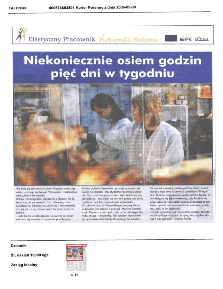 060574693801 Kurier Poranny z dnia 2006-05-09 TAI Press r] Elastyczny Pracownik Partnei Rodzina Niekoniecznie osiem godzin pięć dni w tygodniu Nie boję się zatrudniać kobiet. Przecież sama nią jestem - śmieje się Lucyna Yermeulen, właścicielka sieci cukierni Yermeulen. Urlopy macierzyńskie, chodzenie z dziećmi do lekarza czy na szczepienia zna T własnego doświadczenia. Dlatego nie dziwi się (i nie przeszka' dza jej to), że jej „dziewczyny" też mają życie rodzinne. - Jeśli któraś urodzi dziecko, o powrót do pracy nie musi się martwić - zapewnia pani Lucyna. Dziennik Śr. nakład 19000egz. Zasięg lokalny s. 15 W sieci cukierni Vermeulen pracuje w sumie pięć kobiet na etatach i trzy studentki na umowę zlecenie. Trzy z nich mają już dzieci. Ale nadal pracują zawodowo, l nie cierpi na tym ani praca, ani życie rodzinne. Jest tak dzięki dobrej organizacji. W cukierni przy ul. Wyszyńskiego pracują Marta Żukowska (na zdjęciu z prawej) i Paulina Aleksiejczuk. Pierwsza z nich jest matką czteroletniego Kamila, druga - studentką. Taki tandem doskonale się sprawdza. Mąż Marty też pracuje na zmiany. Oboje tak ustawiają sobie godziny, żeby zawsze któreś z nich było w domu z dzieckiem. W tygodniu Paulina dopasowuje się do planów Marty. Ta odwdzięcza się jej w weekendy, gdy Paulina się uczy. Obie sq więc zadowolone. Zwłaszcza że szefowa - pani Lucyna, pozwala im ustawiać grafiki tak, żeby to im pasowały. - A jak wypadnie coś niespodziewanego, zawsze możemy liczyć na panią Lucynę, że przyjdzie którąś z nas zastąpić - dodaje Marta. TAI Press 060574693802 Kurier Poranny z dnia 2006-05-09 Praca na pół etatu, zadaniowy czy ruchomy czas pracy, wykonywanie obowiązków służbowych tylko w weekendy - okazuje się, że można pogodzić prace i wychowywanie dzieci, l to przestrzegając przepisów prawa pracy. dostosowanie długości czasu pracy do indywidualnych potrzeb pracownika. Zwiększa to w wielu przypadkach szansę rozpoczęcia pracy, powrotu do niej na przykład po urlopie rodzicielskim i/lub jej utrzymanie - zwłaszcza gdy trzeba godzić pracę zawodową z wychowywaniem dzieci. Małe dziecko to nie lada obowiązki. Jeśli chcemy je wychowywać i zarazem pracować - czeka nas nieco główkowania: znaleźć najlepszą opiekunkę lub przedszkole, które będzie spełniać nasze oczekiwania, poza tym poprosić pracodawcę o takie ułożenie grafiku w pracy, żebyśmy byli w stanie z tego przedszkola odbierać dzieci na czas. Nie dla nas też najczęściej praca po godzinach i kilkudniowe służbowe wyjazdy. Nie znaczy to oczywiście, że z pracy zawodowe) musimy zrezygnować zupełnie. Polski kodeks pracy osobom mającym małe dzieci proponuje rozwiązania, które można stosować w zależności od potrzeb i danej sytuacji. Pracownik „niestandardowy", który nie pracuje po osiem godzin przez pięć dni w tygodniu, wcale nie musi być gorszy czy mniej wydajny. • Zadaniowy czas pracy. Pracownik ma do wykonania określone zadania. Czas do tego potrzebny pracodawca ustala w porozumieniu z pracownikiem. Pracownik zatrudniony w tym trybie może więc pracować na cały bądź część etatu. Wszylko zależy od postawionych mu zadań. jej wykonywania. Pracownik jednego dnia pracuje kilka godzin, następnie ma kilka godzin przerwy, po czym znów pracuje. W ciągu doby może być zastosowana jedna taka przerwa, trwająca nie dłużej niż 5 godzin. Za czas przerwy w pracy przysługuje prawo do połowy wynagrodzenia należnego za czas przestoju. • Indywidualny rozkład czasu pracy. O takie rozwiązanie musi wystąpić sam pracownik. Zwykle robi to, gdy ciężko mu pogodzić obowiązki służbowe z rodzinnymi. Indywidualny rozkład czasu pracy może polegać na ustaleniu innych godzin roz• Równoważny czas pracy. To roz- poczynania i kończenia pracy lub na wyznaczeniu innych dni pracująwiązanie pozwala na wydłużenie cych w tygodniu niż tradycyjnie od czasu pracy w określone dni, a skrócenie w inne. Dodatkowo przepraponiedziałku do piątku. cowane godziny można też „pozbierać" i odebrać jako całe dni wolne. • System skróconego tygodnia pracy. Pracując na cały etat, nie Trzeba tylko pilnować, żeby w daprzychodzimy do pracy pięć dni nym okresie rozliczeniowym (nie dłuższym niż miesiąc) średnia przew tygodniu. Swoje godziny przeprapracowanych godzin nie przekroczycowujemy w ciągu mniejszej liczby dni. Pracować jednak można nie ła 8. dłużej niż 12 godzin na dobę. W tym systemie można zatrudnić • Przerywany czas pracy. Istotą tej formy pracy jest przerwa w trakcie pracownika na pełny etat lub tylko Elastyczne formy czasu pracy dopuszczane przez polski kodeks pracy: na jego część, a dni pracy następować bezpośrednio po sobie lub być przedzielone dniami wolnymi od pracy. • Praca weekendowa. Decydując się na taki system, przychodzimy do pracy tylko w piątki, soboty, niedziele i święta. Pracujemy jednak nie dłużej niż 12 godzin na dobę. System ten można wprowadzić tylko na wniosek pracownika. • Ruchomy czas pracy. Pracownik zobowiązuje się przepracować ustaloną liczbę godzin. Jednak to on decyduje - konsultując wszystko z pracodawcą - o której godzinie-zaczyna i kończy pracę. Pracownik powinien być też poinformowany, że musi mieć co najmniej 11 godzin przerwy, zanim rozpocznie kolejny dzień pracy. • Część etatu zamiast urlopu wychowawczego. Jeśli jesteśmy uprawnieni do skorzystania z urlopu wychowawczego - możemy złożyć do pracodawcy wniosek o obniżenie wymiaru czasu pracy. Nie może być on niższy niż pół etatu. W tym przypadku pracodawca musi zgodzić się na prośbę pracownika. Projekt jest realizowany przy udziale środków Europejskiego Funduszu Społecznego w ramach Inicjatywy Wspólnotowej EQUAL • Praca w niepełnym wymiarze czasu. Ta forma zatrudnienia umożliwia Dziennik Śr. nakład 19000egz. Zasięg lokalny s. 15 TAI Press 060574693803 K