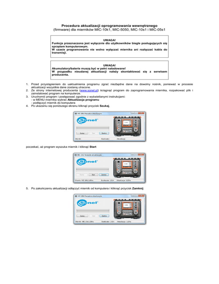 Procedura aktualizacji oprogramowania wewnętrznego (firmware) dla mierników MIC-10k1, MIC-5050, MIC-10s1 i MIC-05s1 UWAGA! Funkcja przeznaczona jest wyłącznie dla użytkowników biegle posługujących się sprzętem komputerowym. W czasie programowania nie wolno wyłączać miernika ani rozłączać kabla do transmisji. UWAGA! Akumulatory/baterie muszą być w pełni naładowane! W przypadku nieudanej aktualizacji należy skontaktować się z serwisem producenta. 1. Przed przystąpieniem do uaktualnienia programu zgrać niezbędne dane na dowolny nośnik, ponieważ w procesie aktualizacji wszystkie dane zostaną utracone. 2. Ze strony internetowej producenta (www.sonel.pl) ściągnąć program do zaprogramowania miernika, rozpakować plik i zainstalować program na komputerze. 3. Uruchomić program i postępować zgodnie z wyświetlanymi instrukcjami: - w MENU miernika wybrać Aktualizacja programu - podłączyć miernik do komputera 4. Po ukazaniu się poniższego ekranu kliknąć przycisk Szukaj, poczekać, aż program wyszuka miernik i kliknąć Start 5. Po zakończeniu aktualizacji odłączyć miernik od komputera i kliknąć przycisk Zamknij