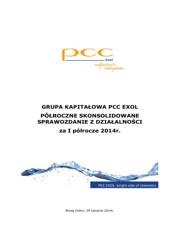 GRUPA KAPITAŁOWA PCC EXOL PÓŁROCZNE SKONSOLIDOWANE SPRAWOZDANIE Z DZIAŁALNOŚCI za I półrocze 2014r. Brzeg Dolny, 29 sierpnia 2014r. PCC EXOL SA Półroczne skonsolidowane sprawozdanie z działalności za I półrocze 2014r. SPIS TREŚCI I. WYBRANE DANE FINANSOWE ...................................................................................................... 3 I.1. I.2. Skonsolidowane dane finansowe Grupy Kapitałowej ....................................... 3 Dane finansowe Jednostki Dominującej ........................................................ 4 II. INFORMACJE OGÓLNE .................................................................................................................. 5 II.1. Informacje ogólne o Emitencie .................................................................... 5 II.2. Sytuacja kadrowa ...................................................................................... 8 II.3. Skład Grupy Kapitałowej, jednostki objęte skonsolidowanym sprawozdaniem finansowym .............................................................................................. 5 II.4. Przedmiot działalności Grupy Kapitałowej...................................................... 6 II.5. Skład Zarządu oraz Rady Nadzorczej Emitenta .............................................. 8 II.6. Akcjonariusze posiadający bezpośrednio lub pośrednio przez podmioty zależne co najmniej 5 % ogólnej liczby głosów na walnym zgromadzeniu Emitenta................................................................................................... 9 II.7. Zestawienie stanu posiadania akcji Emitenta lub uprawnień do nich przez osoby zarządzające i nadzorujące Emitenta ..................................................10 II.8. Stanowisko Zarządu odnośnie możliwości zrealizowania wcześniej publikowanych prognoz wyników ................................................................10 II.9. Zmiany w strukturze Grupy Kapitałowej w bieżącym okresie sprawozdawczym, połączenia, przejęcia i sprzedaż jednostek gospodarczych, informacje o zaniechaniu działalności ..........................................................10 III. KOMENTARZ ZARZĄDU DOTYCZĄCY SYTUACJI FINANSOWEJ GRUPY KAPITAŁOWEJ ................. 11 III.1. Opis czynników i zdarzeń o nietypowym charakterze, mających znaczący wpływ na osiągnięte wyniki finansowe .........................................................11 III.2. Zwięzły opis istotnych dokonań lub niepowodzeń Grupy Kapitałowej ...............11 III.3. Analiza wyniku finansowego .......................................................................15 III.4. Analiza zmian w sprawozdaniu z sytuacji finansowej .....................................17 III.5. Analiza zmian przepływów pieniężnych ........................................................19 III.6. Opis podstawowych zagrożeń i ryzyk związanych z pozostałymi miesiącami roku obrotowego ......................................................................................19 III.7. Czynniki, które w ocenie Zarządu będą miały wpływ na osiągnięte przez Grupę Kapitałową wyniki finansowe ............................................................26 III.8. Zdarzenia, które wystąpiły po dniu, na który sporządzono półroczne skrócone sprawozdanie finansowe, nieujęte w tym sprawozdaniu, a mogące w znaczący sposób wpłynąć na przyszłe wyniki finansowe Grupy Kapitałowej ....................26 III.9. Dywidendy wypłacone i zadeklarowane do wypłaty .......................................27 2 PCC EXOL SA Półroczne skonsolidowane sprawozdanie z działalności za I półrocze 2014r. I. WYBRANE DANE FINANSOWE I.1. Skonsolidowane dane finansowe Grupy Kapitałowej Przedstawione poniżej wybrane dane finansowe opracowano na podstawie skonsolidowanego sprawozdania finansowego Grupy Kapitałowej PCC EXOL za I półrocze 2014r. Grupa Kapitałowa PCC EXOL Przychody ze sprzedaży w tys. PLN 01.01.201401.01.201330.06.2014 30.06.2013 w tys. EUR 01.01.201401.01.201330.06.2014 30.06.2013 251 575 228 619 60 208 54 252 Zysk z działalności operacyjnej 9 631 10 532 2 305 2 499 Zysk (Strata) przed opodatkowaniem 3 503 4 402 838 1 045 Zysk (Strata) netto 2 591 3 121 620 741 205 (1 876) 49 (445) 2 796 1 245 669 295 18 545 12 865 4 438 3 053 (4 886) (2 511) (1 169) (596) (11 198) (16 852) (2 680) (3 999) 2 461 (6 498) 589 (1 542) 172 484 374 172 046 596 172 484 374 172 046 596 Inne całkowite dochody netto Całkowite dochody ogółem Przepływy pieniężne netto z działalności operacyjnej Przepływy pieniężne netto z działalności inwestycyjnej Przepływy pieniężne netto z działalności finansowej Przepływy pieniężne netto, razem Średnia, ważona liczba akcji zwykłych Zysk (Strata) na jedna akcje zwykła (w PLN/ EUR) 0,02 zł Stan na 30.06.2014 0,02 zł Stan na 31.12.2013 0,00 EUR Stan na 30.06.2014 0,00 EUR Stan na 31.12.2013 Aktywa trwale 372 205 373 497 89 453 90 060 Aktywa obrotowe 139 731 128 277 33 582 30 931 Zobowiązania długoterminowe 168 328 198 388 40 455 47 837 Zobowiązania krótkoterminowe 129 358 86 758 31 089 20 920 Kapitał własny 214 250 216 628 51 491 52 234 Kapitał podstawowy 172 484 172 484 41 454 41 590 Liczba akcji (w szt.) 172 484 374 172 484 374 172 484 374 172 484 374 1,24 zł 1,26 zł 0,30 EUR 0,30 EUR Wartość księgowa na jedna akcje (w PLN/EUR) 3 PCC EXOL SA Półroczne skonsolidowane sprawozdanie z działalności za I półrocze 2014r. I.2. Dane finansowe Jednostki Dominującej w tys. PLN PCC EXOL SA Przychody ze sprzedaży 01.01.201430.06.2014 w tys. EUR 01.01.201330.06.2013 01.01.201430.06.2014 01.01.201330.06.2013 210 114 187 514 50 286 44 498 Zysk z działalności operacyjnej 8 608 8 318 2 060 1 974 Zysk (Strata) przed opodatkowaniem 2 627 2 364 629 561 Zysk (Strata) netto 2 048 1 858 490 441 Inne całkowite dochody netto (266) (4 685) (64) (1 112) Całkowite dochody ogółem 1 782 (2 827) 426 (671) 18 650 11 949 4 4