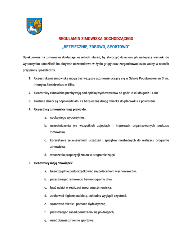 regulamin zimowiska dochodzącego „bezpiecznie, zdrowo, sportowo”
