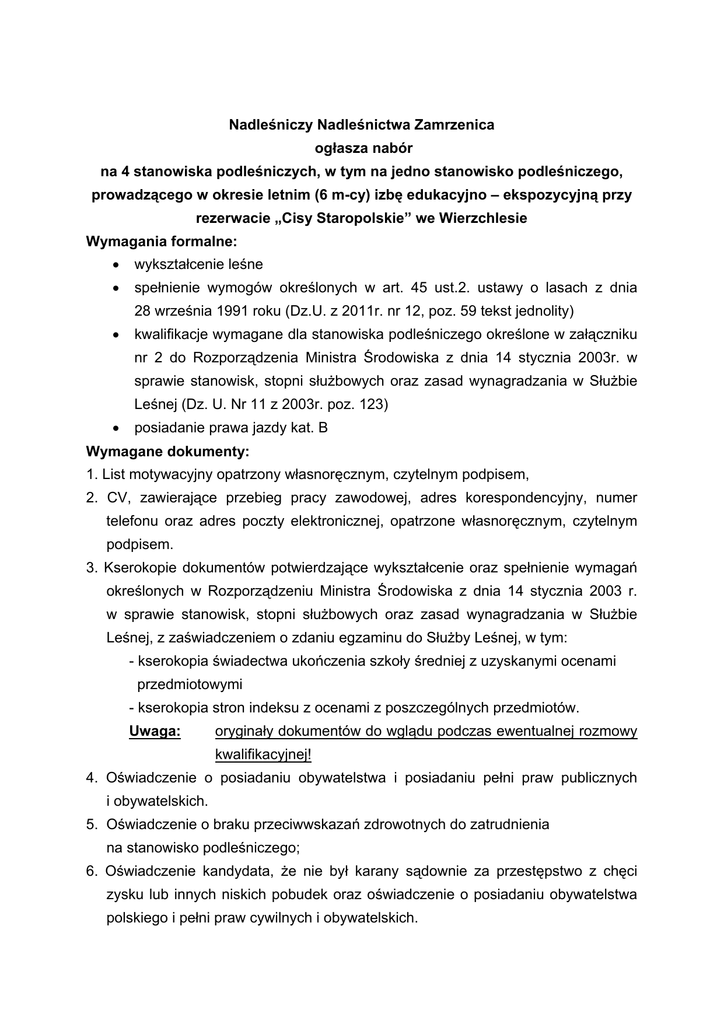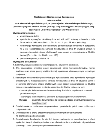 Nadleśniczy Nadleśnictwa Zamrzenica ogłasza nabór na 4 stanowiska podleśniczych, w tym na jedno stanowisko podleśniczego, prowadzącego w okresie letnim (6 m-cy) izbę edukacyjno – ekspozycyjną przy rezerwacie „Cisy Staropolskie” we Wierzchlesie Wymagania formalne: wykształcenie leśne spełnienie wymogów określonych w art. 45 ust.2. ustawy o lasach z dnia 28 września 1991 roku (Dz.U. z 2011r. nr 12, poz. 59 tekst jednolity) kwalifikacje wymagane dla stanowiska podleśniczego określone w załączniku nr 2 do Rozporządzenia Ministra Środowiska z dnia 14 stycznia 2003r. w sprawie stanowisk, stopni służbowych oraz zasad wynagradzania w Służbie Leśnej (Dz. U. Nr 11 z 2003r. poz. 123) posiadanie prawa jazdy kat. B Wymagane dokumenty: 1. List motywacyjny opatrzony własnoręcznym, czytelnym podpisem, 2. CV, zawierające przebieg pracy zawodowej, adres korespondencyjny, numer telefonu oraz adres poczty elektronicznej, opatrzone własnoręcznym, czytelnym podpisem. 3. Kserokopie dokumentów potwierdzające wykształcenie oraz spełnienie wymagań określonych w Rozporządzeniu Ministra Środowiska z dnia 14 stycznia 2003 r. w sprawie stanowisk, stopni służbowych oraz zasad wynagradzania w Służbie Leśnej, z zaświadczeniem o zdaniu egzaminu do Służby Leśnej, w tym: - kserokopia świadectwa ukończenia szkoły średniej z uzyskanymi ocenami przedmiotowymi - kserokopia stron indeksu z ocenami z poszczególnych przedmiotów. Uwaga: oryginały dokumentów do wglądu podczas ewentualnej rozmowy kwalifikacyjnej! 4. Oświadczenie o posiadaniu obywatelstwa i posiadaniu pełni praw publicznych i obywatelskich. 5. Oświadczenie o braku przeciwwskazań zdrowotnych do zatrudnienia na stanowisko podleśniczego; 6. Oświadczenie kandydata, że nie był karany sądownie za przestępstwo z chęci zysku lub innych niskich pobudek oraz oświadczenie o posiadaniu obywatelstwa polskiego i pełni praw cywilnych i obywatelskich. 7. Oświadczenie kandydata o wyrażeniu zgody na przetwarzanie danych osobowych dla potrzeb niezbędnych dla realizacji procesu rekrutacji - zgodnie z Ustawą z dnia 29 sierpnia 1997 roku o ochronie danych osobowych (Dz.U. z 2002r. nr 101, poz. 926 z późń. zm.) 8. Oświadczenie kandydata, że w przypadku wyboru jego kandydatury(oferty) nie będzie pozostawał w innym stosunku pracy, który uniemożliwiałby mu wykonywanie obowiązków służbowych w wymiarze pełnego etatu. 9. Oświadczenie kandydata, czy aplikuje również na stanowisko podleśniczego prowadzącego izbę edukacyjną. Oferta może również zawierać dodatkowe dokumenty: dokumenty poświadczające dodatkowe kwalifikacje np. ukończone studia podyplomowe, kursy, szkolenia, dokumenty potwierdzające osiągnięcia i doświadczenie zawodowe, dokumenty lub oświadczenia o posiadaniu dodatkowych umiejętności, (również spoza obszaru gospodarki leśnej), itp. (oryginały dokumentów do wglądu podczas ewentualnej rozmowy kwalifikacyjnej). • uprawnienia łowieckie ogólne i selekcjonerskie. Zakres czynności na stanowisku podleśniczego: Podlega bezpośrednio właściwemu leśniczemu. Wykonuje swoje obowiązki w charakterze pomocy lub w zastępstwie leśniczego. Do jego zadań należy wykonywanie wszelkich czynności techniczno-gospodarczych, administracyjnych i ochronnych w zakresie obejmującym realizację zadań ustalonych dla leśnictwa na polecenie leśniczego lub z własnej inicjatywy (szczególnie podczas nieobecności leśniczego na terenie leśnictwa), w tym: - ochrona granic leśnictwa, - zabezpieczenie przeciwpożarowe lasów i obiektów leśnych, - ochrona lasu przed czynnikami szkodotwórczymi, - nadzór nad wykonawstwem prac w leśnictwie, - instruowanie pracowników w zakresie zlecanych do wykonania robót, - przestrzeganie i egzekwowanie od pracowników lub ZUL-i wykonania prac zgodnie z obowiązującymi instrukcjami i przepisami i zleceniami, - dokonywanie obmiarów i wstępnego odbioru robót, - dokonywanie odbiórki pozyskanego drewna, - wydawanie drewna z lasu, - informowanie leśniczego o przebiegu swojej pracy, - prowadzenie książki służbowej, - prowadzenie edukacji leśnej i ekologicznej społeczeństwa, - zastępowanie leśniczego podczas jego nieobecności, - wykonywanie czynności związanych ze zwalczaniem szkodnictwa leśnego Podleśniczy prowadzący w okresie letnim izbę edukacyjno ekspozycyjną we Wierzchlesie będzie wykonywał w tym czasie dodatkowe czynności: - prowadzenie zajęć z edukacji leśnej i przyrodniczej, - utrzymywanie ładu i porządku organizacyjnego w izbie, - oprowadzanie grup osób odwiedzających rezerwat, - przygotowywanie różnych materiałów edukacyjnych (multimedia, eksponaty, itp.) - opracowywanie, aktualizacja i realizacja programu funkcjonowania izby. Ogólny zakres czynności na stanowisku podleśniczego oraz obowiązki ogólne, wspólne dla wszystkich pracowników, określa regulamin organizacyjny nadleśnictwa – do wglądu na miejscu w nadleśnictwie. Termin i miejsce składania ofert Wymagane dokumenty należy składać w Sekretariacie Nadleśnictwa Zamrzenica lub przesłać pocztą na adres: Nadleśnictwo Zamrzenica, Zamrzenica 1A, 89-510 Bysław, w terminie do dnia 21.07. 2014r. do godz. 10.00 – w zaklejonych kopertach z dopiskiem „Nabór na stanowisko podleśniczego w Nadleśnictwie Zamrzenica”. Na kopercie należy zamieścić adres korespondencyjny kandydata. W przypadku nadesłania dokumentów pocztą decyduje data i godzina wpływu dokumentów do Sekretariatu. Dokumenty, które wpłyną po terminie – nie będą rozpatrywane. Dokumenty przesłane drogą elektroniczną nie będą przyjmowane. Do udzielania informacji w sprawie naboru upoważnione jest stanowisko ds. pracowniczych pok. nr 28 , nr telefonu 52 3341175 wewn. 205 lub w zastępstwie sekretarka pok. nr 29 nr telefonu 52 3341175. Dodatkowe informacje W wyniku komisyjnej analizy i oceny przedstawionych dokumentów oraz oświadczeń zostaną wybrani, spe