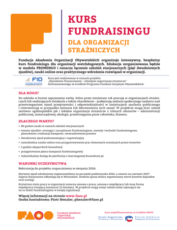 KURS FUNDRAISINGU DLA ORGANIZACJI STRAŻNICZYCH Fundacja Akademia Organizacji Obywatelskich organizuje intensywny, bezpłatny kurs fundraisingu dla organizacji watchdogowych. Edukacja zorganizowana będzie w modelu PROMENGO i oznacza łączenie szkoleń stacjonarnych (pięć dwudniowych zjazdów), nauki online oraz praktycznego wdrożenia rozwiązań w organizacji. Kurs jest realizowany w ramach projektu „Niezależne finansowanie – silniejsze organizacje strażnicze” dofinansowanego ze środków Programu Fundusz Inicjatyw Obywatelskich. DLA KOGO? Do udziału w kursie zapraszamy osoby, które przez minimum rok pracują w organizacjach strażniczych lub realizujących działania o takim charakterze – podejmują zadania społecznego nadzoru nad przestrzeganiem zasad przejrzystości i odpowiedzialności w instytucjach zaufania publicznego i interweniują w przypadku łamania lub lekceważenia tych zasad. W projekcie mogą brać udział zarówno ogólnopolskie jak i lokalne organizacje strażnicze z różnych obszarów – administracji publicznej, samorządowej, ekologii, przestrzegania praw człowieka, biznesu. DLACZEGO WARTO? • 80 godzin nauki w ramach szkoleń stacjonarnych • tematy zjazdów: strategia i zarządzanie fundraisingiem, metody i techniki fundraisingowe, planowanie i realizacja kampanii, uwarunkowania prawne • dwudniowy zjazd podsumowujący i superwizyjny • samodzielna nauka online oraz przygotowywanie prac domowych ocenianych przez trenerów • 5 godzin eksperckich konsultacji • przygotowanie planu kampanii fundraisingowej • indywidualny dostęp do platformy e-learningowej Kursodrom.pl. WARUNKI UCZESTNICTWA Rekrutację do projektu rozpoczniemy w sierpniu 2016. Pierwszy zjazd szkoleniowy zaplanowaliśmy na początek października 2016, a ostatni na czerwiec 2017. Zajęcia stacjonarne odbywają się w Warszawie. Osobom spoza stolicy zapewniamy zwrot kosztów dojazdów oraz noclegi. Kryterium stażu pracy w organizacji oznacza umowę o pracę, umowę o współpracy lub inną formę współpracy trwającą minimum 12 miesięcy. W projekcie mogą wziąć udział osoby zajmujące się na co dzień fundraisingiem w swojej organizacji. Więcej informacji na stronie www.faoo.pl Osoba kontaktowa: Piotr Henzler, [email protected] Kurs współfinansowany ze środków PAFW