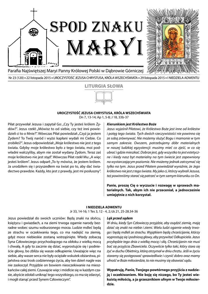 SPOD ZNAKU MARYI Parafia Najświętszej Maryi Panny Królowej Polski w Dąbrowie Górniczej Nr 23 (120) • 22 listopada 2015 • UROCZYSTOŚĆ JEZUSA CHRYSTUSA, KRÓLA WSZECHŚWIATA • 29 listopada 2015 • I NIEDZIELA ADWENTU LITURGIA SŁOWA | UROCZYSTOŚĆ JEZUSA CHRYSTUSA, KRÓLA WSZECHŚWIATA Dn 7, 13-14; Ap 1, 5-8; J 18, 33b-37 Piłat przywołał Jezusa i zapytał Go: „Czy Ty jesteś królem Żydów?”. Jezus rzekł: „Mówisz to od siebie, czy też inni powiedzieli ci to o Mnie?”. Wówczas Piłat powiedział: „Czyż ja jestem Żydem? To Twój naród i wyżsi kapłani wydali mi Ciebie. Co zrobiłeś?”. Jezus odpowiedział: „Moje królestwo nie jest z tego świata. Gdyby moje królestwo było z tego świata, moi podwładni walczyliby, abym nie został wydany Żydom. Teraz zaś moje królestwo nie jest stąd”. Wówczas Piłat rzekł Mu: „A więc jesteś królem”. Jezus odparł: „To ty mówisz, że jestem królem. Ja urodziłem się i przyszedłem na świat po to, aby dać świadectwo prawdzie. Każdy, kto jest z prawdy, jest mi posłuszny”. Kierunkiem jest Królestwo Boże Jezus wyjaśnił Piłatowi, że Królestwo Boże jest inne od królestw i potęg tego świata. Tych dwóch rzeczywistości nie powinno się ze sobą zrównywać. Nie możemy służyć Bogu i mamonie w tym samym zakresie. Owszem, potrzebujemy dóbr materialnych w naszej ludzkiej egzystencji: musimy mieć co zjeść, w co się ubrać i gdzie mieszkać. Dobrze jest, gdy wszystko to jest estetyczne i kiedy nasz byt materialny na tym świecie jest zapewniony na wystarczającym poziomie. Nie możemy jednak zatrzymać się tylko na tym. Jezus przed Piłatem powiedział wyraźnie, że Jego królestwo nie jest z tego świata. My jako ci, którzy wybrali Jezusa, też powinniśmy starać się patrzeć w tym samym kierunku co On. Panie, proszę Cię o wyczucie i rozwagę w sprawach materialnych. Tak, abym ich nie przeceniał, a jednocześnie umiejętnie z nich korzystał. I NIEDZIELA ADWENTU Jr 33, 14-16; 1 Tes 3, 12 - 4, 2; Łk 21, 25-28.34-36 Jezus powiedział do swoich uczniów: Będą znaki na słońcu, księżycu i gwiazdach, a na ziemi trwoga ogarnie narody bezradne wobec szumu wzburzonego morza. Ludzie mdleć będą ze strachu w oczekiwaniu tego, co ma nadejść na ziemię, gdyż moce niebieskie zostaną wstrząśnięte. Wtedy zobaczą Syna Człowieczego przychodzącego na obłoku z wielką mocą i chwałą. A gdy to zacznie się dziać, wyprostujcie się i podnieście głowy, bo zbliża się wasze odkupienie. Uważajcie więc na siebie, aby wasze serca nie były ociężałe wskutek obżarstwa, pijaństwa oraz trosk codziennego życia, aby ten dzień nagle was nie zaskoczył. Przyjdzie on bowiem nieoczekiwanie na mieszkańców całej ziemi. Czuwajcie więc i módlcie się w każdym czasie, abyście zdołali uniknąć tego wszystkiego, co ma się zdarzyć, i mogli stanąć przed Synem Człowieczym”. Lęk przed sądem W dniu, kiedy Syn Człowieczy przyjdzie, aby osądzić ziemię, mają dziać się znaki na niebie i ziemi. Wielu ludzi ogarnie wtedy trwoga i będą mdleli ze strachu. Wyjątkiem będą chrześcijanie, którzy wyprostują się i podniosą głowy, aby przywitać Odkupiciela. Jezus przybędzie tego dnia z wielką mocą i siłą. Chrześcijanin nie musi bać się przyjścia Zbawiciela. Oczywiście tylko taki, który stara się żyć w duchu Obietnicy, którą otrzymał w dniu chrztu. Jeśli w życiu staramy się postępować sprawiedliwie i czynić dobro oraz mamy ufność w Boże miłosierdzie, to nie musimy się obawiać sądu. Wypatruję, Panie, Twojego powtórnego przyjścia z nadzieją i oczekiwaniem. Nie boję się niczego, bo Ty jesteś wiekuistą miłością, a ja grzesznikiem ufnym w Twoje miłosierdzie. Legion Maryi Legion Maryi jest apostolskim ruchem katolików świeckich. Powstał w Irlandii w 1921 r. Założycielem Legionu był Irlandczyk Frank Duff, żyjący w latach 1889-1980, genialny działacz apostolatu świeckich. Obecnie Legion działa na wszystkich kontynentach świata. W Polsce Legion rozpoczął swoją działalność – dzięki inspiracji Anatola Kaszczuka – w 1948 r. Dopiero w latach osiemdziesiątych ub. wieku nastąpił rozkwit tego ruchu. W wielu diecezjach powstały liczne koła Legionu. Legioniści opierają swoją duchowość na pokorze i pobożności Maryi. Bóg pragnie zbawić każdego człowieka za pośrednictwem Najświętszej Pani. Maryja w tym dziele potrzebuje oddanych Jej ludzi. Legioniści podejmując pracę apostolską, docierają do serc i dusz tych, których Matka Boża prowadzi do Swojego Syna. Celem Legionu Maryi jest uwielbienie Boga i zdobycie świętości jego członków przez modlitwę i czynną pracę apostolską. Praca Legionu oparta jest na dyscyplinie wewnętrznej, wynikającej z poczucia obowiązku i głębokiej wiary. Legion działa w parafii za zgodą swego księdza proboszcza i pod stałą opieką kapłana. Są dwa rodzaje członków: aktywni, działający czynnie, oraz członkowie pomocniczy, którzy swoją codzienną modlitwą wspierają legionistów aktywnych. Legioniści, działający aktywnie, m.in. nawiązują kontakty apostolskie z ludźmi zaniedbanymi moralnie i religijnie, odwiedzają samotnych i chorych w domach, szpitalach i zakładach opieki społecznej, pracują wśród ludzi uzależnionych (np. alkoholicy, narkomani) spotykają się z więźniami, prowadzą dialogi z różnowiercami i osobami zagrożonymi przez sekty, organizują czuwania modlitewne przed Najświętszym Sakramentem, propagują idee orędzia fatimskiego, współpracują z legionistami z krajów sąsiadujących z Polską, prowadzą kolportaż prasy i książki religijnej, służą pomocą duchową wszystkim, którzy są w potrzebie. d ! e PRZED ŚWIATOWYMI DNIAMI MŁODZIEŻY (2) Żyjemy w świecie obrazów. Kolory, kształty, czasem ruch mówi więcej, niż tysiące słów, których zresztą wielu z nas alergicznie nie lubi czytać. Dlatego każde w