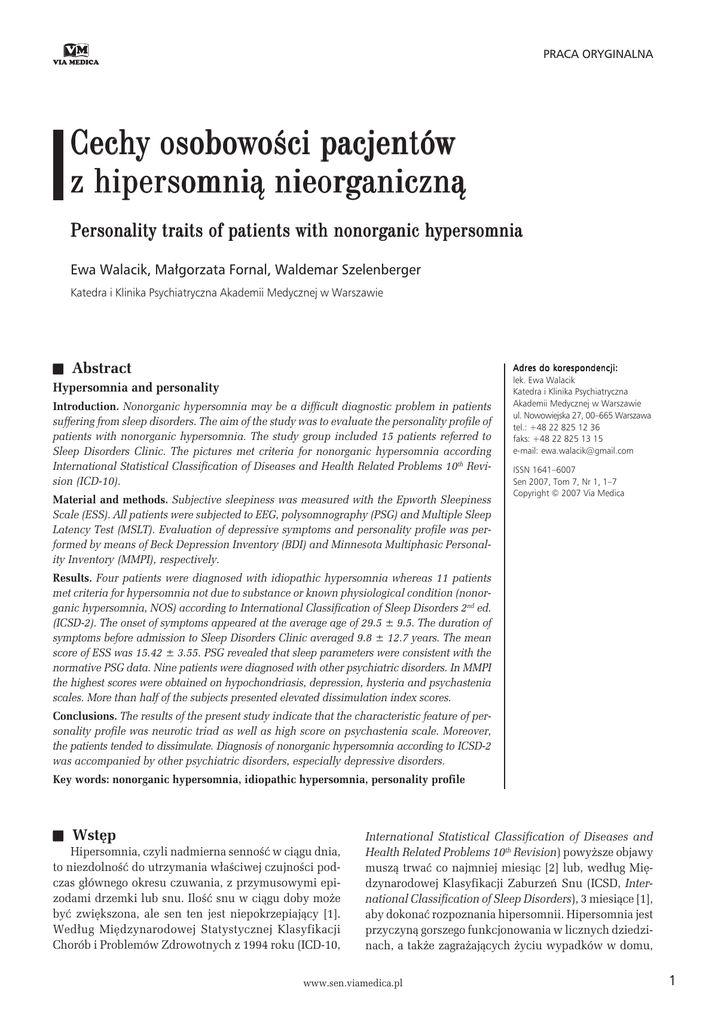 PRACA ORYGINALNA Cechy osobowości pacjentów z hipersomnią nieorganiczną Personality traits of patients with nonorganic hypersomnia Ewa Walacik, Małgorzata Fornal, Waldemar Szelenberger Katedra i Klinika Psychiatryczna Akademii Medycznej w Warszawie t Abstract Hypersomnia and personality Introduction. Nonorganic hypersomnia may be a difficult diagnostic problem in patients suffering from sleep disorders. The aim of the study was to evaluate the personality profile of patients with nonorganic hypersomnia. The study group included 15 patients referred to Sleep Disorders Clinic. The pictures met criteria for nonorganic hypersomnia according International Statistical Classification of Diseases and Health Related Problems 10th Revision (ICD-10). Material and methods. Subjective sleepiness was measured with the Epworth Sleepiness Scale (ESS). All patients were subjected to EEG, polysomnography (PSG) and Multiple Sleep Latency Test (MSLT). Evaluation of depressive symptoms and personality profile was performed by means of Beck Depression Inventory (BDI) and Minnesota Multiphasic Personality Inventory (MMPI), respectively. Adres do korespondencji: lek. Ewa Walacik Katedra i Klinika Psychiatryczna Akademii Medycznej w Warszawie ul. Nowowiejska 27, 00–665 Warszawa tel.: +48 22 825 12 36 faks: +48 22 825 13 15 e-mail: [email protected] ISSN 1641–6007 Sen 2007, Tom 7, Nr 1, 1–7 Copyright © 2007 Via Medica Results. Four patients were diagnosed with idiopathic hypersomnia whereas 11 patients met criteria for hypersomnia not due to substance or known physiological condition (nonorganic hypersomnia, NOS) according to International Classification of Sleep Disorders 2nd ed. (ICSD-2). The onset of symptoms appeared at the average age of 29.5 ± 9.5. The duration of symptoms before admission to Sleep Disorders Clinic averaged 9.8 ± 12.7 years. The mean score of ESS was 15.42 ± 3.55. PSG revealed that sleep parameters were consistent with the normative PSG data. Nine patients were diagnosed with other psychiatric disorders. In MMPI the highest scores were obtained on hypochondriasis, depression, hysteria and psychastenia scales. More than half of the subjects presented elevated dissimulation index scores. Conclusions. The results of the present study indicate that the characteristic feature of personality profile was neurotic triad as well as high score on psychastenia scale. Moreover, the patients tended to dissimulate. Diagnosis of nonorganic hypersomnia according to ICSD-2 was accompanied by other psychiatric disorders, especially depressive disorders. Key words: nonorganic hypersomnia, idiopathic hypersomnia, personality profile t Wstęp Hipersomnia, czyli nadmierna senność w ciągu dnia, to niezdolność do utrzymania właściwej czujności podczas głównego okresu czuwania, z przymusowymi epizodami drzemki lub snu. Ilość snu w ciągu doby może być zwiększona, ale sen ten jest niepokrzepiający [1]. Według Międzynarodowej Statystycznej Klasyfikacji Chorób i Problemów Zdrowotnych z 1994 roku (ICD-10, International Statistical Classification of Diseases and Health Related Problems 10th Revision) powyższe objawy muszą trwać co najmniej miesiąc [2] lub, według Międzynarodowej Klasyfikacji Zaburzeń Snu (ICSD, International Classification of Sleep Disorders), 3 miesiące [1], aby dokonać rozpoznania hipersomnii. Hipersomnia jest przyczyną gorszego funkcjonowania w licznych dziedzinach, a także zagrażających życiu wypadków w domu, www.sen.viamedica.pl 1 SEN 2007, Tom 7, Nr 1 w pracy i podczas prowadzenia pojazdów. W większości badań epidemiologicznych rozpowszechnienie hipersomnii wynosi 5–15% ogólnej populacji [3], w Polsce — 5% [4]. Do najczęstszych przyczyn nadmiernej senności należą: zaburzenia rytmu dobowego, zespoły zaburzeń oddychania w czasie snu, egzogenny niedobór snu, a także zaburzenia psychiczne, takie jak: choroba afektywna dwubiegunowa, dystymia, depresja atypowa i sezonowa choroba afektywna. Hipersomnia może być też objawem pierwotnym w rzadszych schorzeniach, takich jak narkolepsja, zespół Kleinego-Levina czy hipersomnia idiopatyczna. W ICD-10 nadmierną senność w ciągu dnia i napady snu, jak również wydłużone przechodzenie ze snu do stanu pełnego czuwania, umieszczono w grupie nieorganicznych zaburzeń snu (F 51) pod nazwą „hipersomnii nieorganicznej”. Wymienione objawy mogą występować samodzielnie lub są przejawem innych zaburzeń psychicznych, najczęściej afektywnych. Hipersomnię nieorganiczną z towarzyszącymi zaburzeniami psychicznymi rozpoznaje się jednak tylko wtedy, gdy dominuje ona w obrazie klinicznym [2]. W amerykańskiej klasyfikacji zaburzeń psychicznych (DSM-IV, Diagnostic and Statistical Manual of Mental Disorders IV) [5] nadmierną senność, która nie jest przejawem zaburzeń oddychania podczas snu, narkolepsji, zaburzeń rytmu dobowego, innych zaburzeń psychicznych lub działania substancji psychoaktywnych, określa się mianem „hipersomnii pierwotnej”. Kategoria ta odpowiada hipersomnii idiopatycznej według ICSD. W najnowszej edycji ICSD grupę zaburzeń snu przebiegających z nadmierną sennością pochodzenia centralnego umieszczono w osobnym rozdziale. Należą do nich: narkolepsja, hipersomnia okresowa (tj. zespół KleinegoLevina), zespół egzogennego niedoboru snu, hipersomnia spowodowana przyjmowaniem lub odstawieniem substancji o działaniu ośrodkowym, hipersomnia wtórna do schorzeń ośrodkowego układu nerwowego, hipersomnia w przebiegu zaburzeń psychicznych, hipersomnia idiopatyczna [1]. Hipersomnia idiopatyczna to zespół wyodrębniony przez Bedřicha Rotha [6, 7] jako różny od narkolepsji, a charakteryzujący się nadmierną sennością w ciągu dnia, z towarzyszącymi długimi, nieregenerującymi drzemkami, przedłużonym snem nocnym i trudnościami z budzeniem się rano lub z drzemkami w ciągu dnia [8]. Definicja ta bywa nie dość precyzyjna dla celów kliniczny