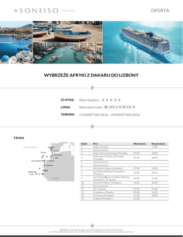 OFERTA WYBRZEŻE AFRYKI Z DAKARU DO LIZBONY STATEK: Silver Explorer LINIA: Silversea Cruises TERMIN: 15 KWIETNIA 2016 – 29 KWIETNIA 2016 TRASA Dzień 1 2 3 4 5 6 7 8 9 10 11 12 13 14 15 Port Dakar, Senegal dzień na morzu Fogo, Wyspy Zielonego Przylądka Porto Novo, Wyspy Zielonego Przylądka dzień na morzu dzień na morzu Ad-Dachla, Sahara Zachodnia Las Palmas/Wyspy Kanaryjskie, Hiszpania San Sebastián de la Gomera/Wyspy Kanaryjskie, Hiszpania Funchal/Madera, Portugalia dzień na morzu Safi, Maroko Casablanca, Maroko Portimao, Portugalia Lizbona, Portugalia Wpłynięcie 07:00 Wypłynięcie 17:30 18:00 07:30 18:00 07:30 15:00 13:00 20:00 06:30 12:30 12:30 05:30 09:00 11:30 07:30 22:00 21:00 16:30 18:00 - SONRISO | Lipiński Passage | Al. Jero zo limskie 61 | 00-697 Warszawa tel. +48 22 206 45 00 | fax. +48 22 100 14 61 | e-mail: biuro @so nriso .pl | web: www.so nriso .pl OFERTA CENA Typ kabiny Cena z osobę Adventurer Class od 5 250 EUR Explorer Class od 5 550 EUR View Suite od 5 950 EUR Vista Suite od 6 350 EUR CENA ZAWIERA DOTATKOWE OPŁATY zakwaterowanie w 2 - os apartamencie wybranej kategorii pełne wyżywienie: 3 posiłki, przekąski między posiłakmi, bufet o północy open bar: wybrane wina i szampany, alkohole premium, różnorodne kawy i herbaty, wodę mineralną butelkowaną, napoje bezalkoholowe oraz soki dostępne w barach i restauracjach korzystanie z mini baru w apartamencie serwis bagażowy podczas wejścia i zejścia ze statku obsługa kamerdynerska 24 godzinny serwis kabinowy korzystanie z urządzeń sportowo - rekreacyjnych dostępnych na pokładzie (baseny, jacuzzi, boiska sportowe, itp.) udział we wszystkich imprezach organizowanych na pokładzie (przedstawienia, pokazy, aukcje, animacje i inne) opłatę serwisową (napiwki) dla obsługi statku transfer pomiędzy portem a miastem (uzależniony od lokalnych przepisów) obowiązkowe opłaty portowe dojazd/przelot do portu rozpoczęcia i zakończenia rejsu transfery (lotnisko - port - lotnisko) ewentualne noclegi przed lub po rejsie wycieczki fakultatywne korzystanie z usług typu: SPA, salon piękności, pralnia itp. wydatki osobiste tj. zakupy w butikach, internet, kasyno itp. obowiązkowe ubezpieczenie turystyczne koszt wymaganych wiz ewentualna opłata paliwowa (linia w momencie wzrotu cen ropy zastrzega sobie prawo do dodania oplaty paliwowej do każdej rezerwacji) Na życzenie świadczymy dodatkowo usługi: rezerwacje hotelowe na całym świecie rezerwacje biletów lotniczych, trasferów oraz parkingu w porcie rezerwacje wycieczek fakultatywnych i innych atrakcji SONRISO | Lipiński Passage | Al. Jero zo limskie 61 | 00-697 Warszawa tel. +48 22 206 45 00 | fax. +48 22 100 14 61 | e-mail: biuro @so nriso .pl | web: www.so nriso .pl