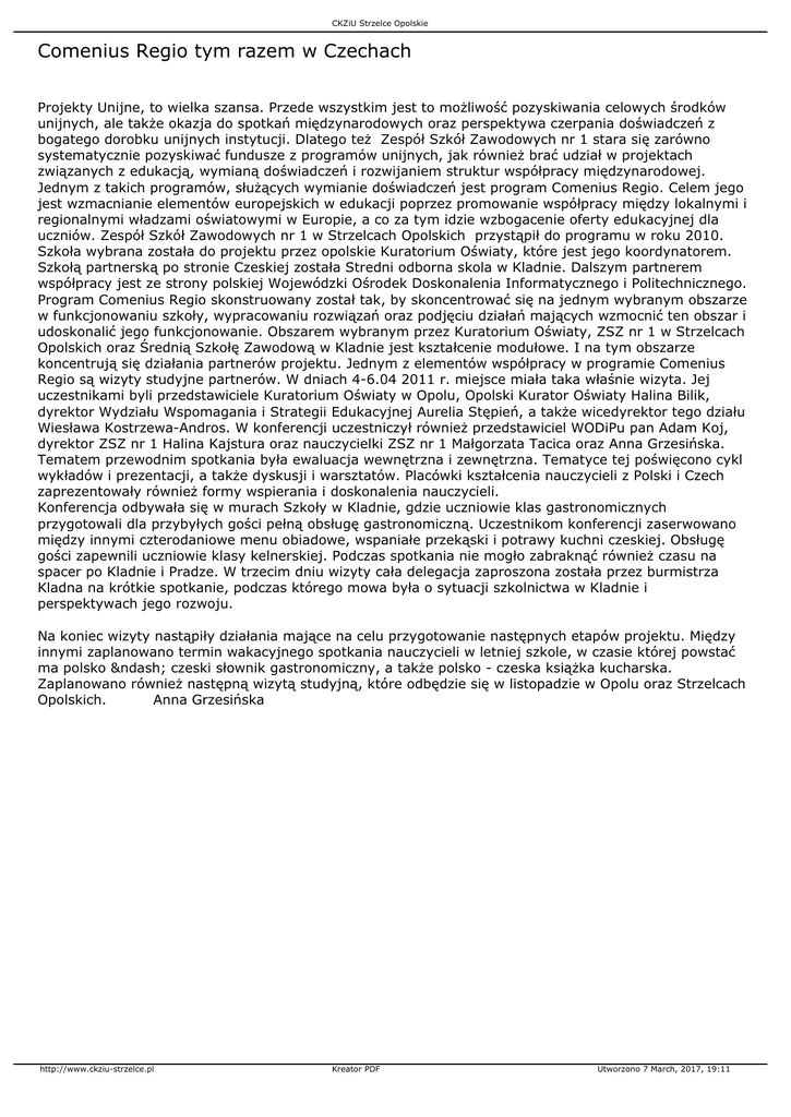 CKZiU Strzelce Opolskie Comenius Regio tym razem w Czechach Projekty Unijne, to wielka szansa. Przede wszystkim jest to możliwość pozyskiwania celowych środków unijnych, ale także okazja do spotkań międzynarodowych oraz perspektywa czerpania doświadczeń z bogatego dorobku unijnych instytucji. Dlatego też Zespół Szkół Zawodowych nr 1 stara się zarówno systematycznie pozyskiwać fundusze z programów unijnych, jak również brać udział w projektach związanych z edukacją, wymianą doświadczeń i rozwijaniem struktur współpracy międzynarodowej. Jednym z takich programów, służących wymianie doświadczeń jest program Comenius Regio. Celem jego jest wzmacnianie elementów europejskich w edukacji poprzez promowanie współpracy między lokalnymi i regionalnymi władzami oświatowymi w Europie, a co za tym idzie wzbogacenie oferty edukacyjnej dla uczniów. Zespół Szkół Zawodowych nr 1 w Strzelcach Opolskich przystąpił do programu w roku 2010. Szkoła wybrana została do projektu przez opolskie Kuratorium Oświaty, które jest jego koordynatorem. Szkołą partnerską po stronie Czeskiej została Stredni odborna skola w Kladnie. Dalszym partnerem współpracy jest ze strony polskiej Wojewódzki Ośrodek Doskonalenia Informatycznego i Politechnicznego. Program Comenius Regio skonstruowany został tak, by skoncentrować się na jednym wybranym obszarze w funkcjonowaniu szkoły, wypracowaniu rozwiązań oraz podjęciu działań mających wzmocnić ten obszar i udoskonalić jego funkcjonowanie. Obszarem wybranym przez Kuratorium Oświaty, ZSZ nr 1 w Strzelcach Opolskich oraz Średnią Szkołę Zawodową w Kladnie jest kształcenie modułowe. I na tym obszarze koncentrują się działania partnerów projektu. Jednym z elementów współpracy w programie Comenius Regio są wizyty studyjne partnerów. W dniach 4-6.04 2011 r. miejsce miała taka właśnie wizyta. Jej uczestnikami byli przedstawiciele Kuratorium Oświaty w Opolu, Opolski Kurator Oświaty Halina Bilik, dyrektor Wydziału Wspomagania i Strategii Edukacyjnej Aurelia Stępień, a także wicedyrektor tego działu Wiesława Kostrzewa-Andros. W konferencji uczestniczył również przedstawiciel WODiPu pan Adam Koj, dyrektor ZSZ nr 1 Halina Kajstura oraz nauczycielki ZSZ nr 1 Małgorzata Tacica oraz Anna Grzesińska. Tematem przewodnim spotkania była ewaluacja wewnętrzna i zewnętrzna. Tematyce tej poświęcono cykl wykładów i prezentacji, a także dyskusji i warsztatów. Placówki kształcenia nauczycieli z Polski i Czech zaprezentowały również formy wspierania i doskonalenia nauczycieli. Konferencja odbywała się w murach Szkoły w Kladnie, gdzie uczniowie klas gastronomicznych przygotowali dla przybyłych gości pełną obsługę gastronomiczną. Uczestnikom konferencji zaserwowano między innymi czterodaniowe menu obiadowe, wspaniałe przekąski i potrawy kuchni czeskiej. Obsługę gości zapewnili uczniowie klasy kelnerskiej. Podczas spotkania nie mogło zabraknąć również czasu na spacer po Kladnie i Pradze. W trzecim dniu wizyty cała delegacja zaproszona została przez burmistrza Kladna na krótkie spotkanie, podczas którego mowa była o sytuacji szkolnictwa w Kladnie i perspektywach jego rozwoju. Na koniec wizyty nastąpiły działania mające na celu przygotowanie następnych etapów projektu. Między innymi zaplanowano termin wakacyjnego spotkania nauczycieli w letniej szkole, w czasie której powstać ma polsko – czeski słownik gastronomiczny, a także polsko - czeska książka kucharska. Zaplanowano również następną wizytą studyjną, które odbędzie się w listopadzie w Opolu oraz Strzelcach Opolskich. Anna Grzesińska http://www.ckziu-strzelce.pl Kreator PDF Utworzono 7 March, 2017, 19:11
