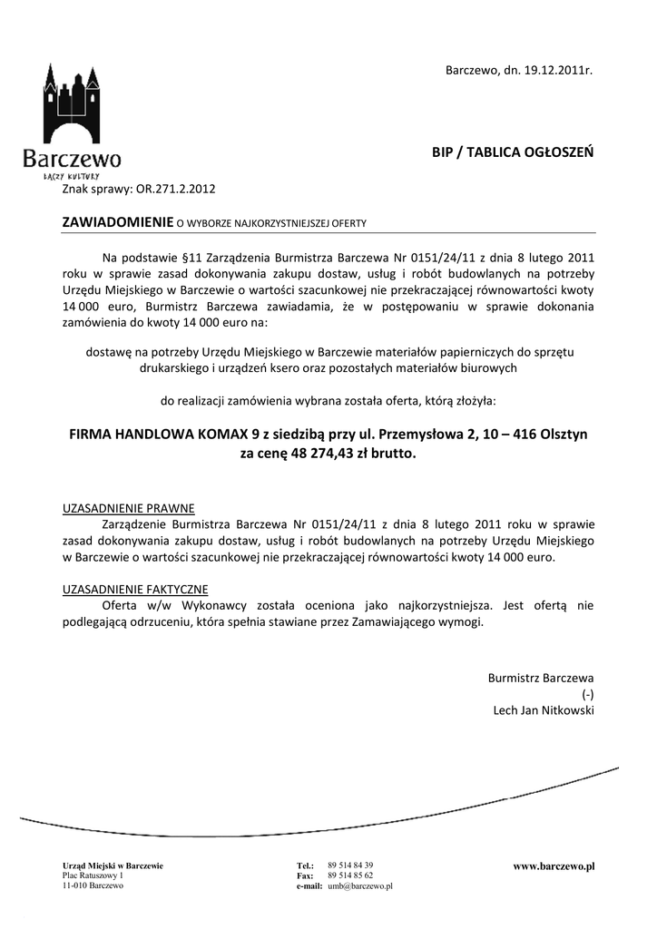 Barczewo, dn. 19.12.2011r. BIP / TABLICA OGŁOSZEŃ Znak sprawy: OR.271.2.2012 ZAWIADOMIENIE O WYBORZE NAJKORZYSTNIEJSZEJ OFERTY Na podstawie §11 Zarządzenia Burmistrza Barczewa Nr 0151/24/11 z dnia 8 lutego 2011 roku w sprawie zasad dokonywania zakupu dostaw, usług i robót budowlanych na potrzeby Urzędu Miejskiego w Barczewie o wartości szacunkowej nie przekraczającej równowartości kwoty 14 000 euro, Burmistrz Barczewa zawiadamia, że w postępowaniu w sprawie dokonania zamówienia do kwoty 14 000 euro na: dostawę na potrzeby Urzędu Miejskiego w Barczewie materiałów papierniczych do sprzętu drukarskiego i urządzeń ksero oraz pozostałych materiałów biurowych do realizacji zamówienia wybrana została oferta, którą złożyła: FIRMA HANDLOWA KOMAX 9 z siedzibą przy ul. Przemysłowa 2, 10 – 416 Olsztyn za cenę 48 274,43 zł brutto. UZASADNIENIE PRAWNE Zarządzenie Burmistrza Barczewa Nr 0151/24/11 z dnia 8 lutego 2011 roku w sprawie zasad dokonywania zakupu dostaw, usług i robót budowlanych na potrzeby Urzędu Miejskiego w Barczewie o wartości szacunkowej nie przekraczającej równowartości kwoty 14 000 euro. UZASADNIENIE FAKTYCZNE Oferta w/w Wykonawcy została oceniona jako najkorzystniejsza. Jest ofertą nie podlegającą odrzuceniu, która spełnia stawiane przez Zamawiającego wymogi. Burmistrz Barczewa (-) Lech Jan Nitkowski Urząd Miejski w Barczewie Plac Ratuszowy 1 11-010 Barczewo 89 514 84 39 Tel.: 89 514 85 62 Fax: e-mail: [email protected] www.barczewo.pl