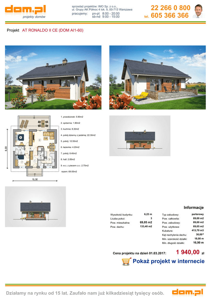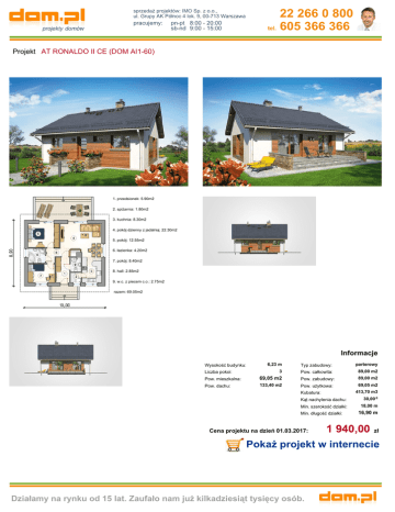 sprzedaż projektów: IMO Sp. z o.o., ul. Grupy AK Północ 4 lok. 9, 00-713 Warszawa pracujemy: pn-pt 8:00 - 20:00 sb-nd 9:00 - 15:00 22 266 0 800 tel. 605 366 366 Projekt AT RONALDO II CE (DOM AI1-60) 1. przedsionek: 5.90m2 2. spiżarnia: 1.80m2 3. kuchnia: 8.30m2 4. pokój dzienny z jadalnią: 22.30m2 5. pokój: 12.55m2 6. łazienka: 4.20m2 7. pokój: 8.40m2 8. hall: 2.85m2 9. w.c. z piecem c.o.: 2.75m2 razem: 69.05m2 Informacje Wysokość budynku: Liczba pokoi: 6,23 m Typ zabudowy: parterowy 3 Pow. całkowita: 89,00 m2 89,00 m2 Pow. mieszkalna: 69,05 m2 Pow. zabudowy: Pow. dachu: 133,40 m2 Pow. użytkowa: 69,05 m2 413,70 m3 Kubatura: Kąt nachylenia dachu: 30,00 0 Min. szerokość działki: 18,00 m Min. długość działki: Cena projektu na dzień 01.03.2017: 16,90 m 1 940,00 zł Pokaż projekt w internecie Działamy na rynku od 15 lat. Zaufało nam już kilkadziesiąt tysięcy osób.