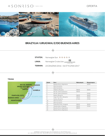 OFERTA BRAZYLIA I URUGWAJ Z/DO BUENOS AIRES STATEK: Norwegian Sun LINIA: Norwegian Cruise Line TERMIN: 23 GRUDNIA 2016 – 06 STYCZNIA 2017 TRASA Dzień 1 2 3 4 5 6 7 8 9 10 11 12 13 14 15 Port Buenos Aires, Argentyna dzień na morzu dzień na morzu Ilhabela, Brazylia Rio de Janerio, Brazylia Rio de Janerio, Brazylia Buzios, Brazylia Angra Dos Reis, Brazylia Santos, Brazylia dzień na morzu dzień na morzu Punta Del Este, Urugwaj Montevideo, Urugwaj Buenos Aires, Argentyna Buenos Aires, Argentyna Wpłynięcie 08:00 08:00 08:00 08:00 07:00 08:00 08:00 08:00 - SONRISO | Lipiński Passage | Al. Jero zo limskie 61 | 00-697 Warszawa tel. +48 22 206 45 00 | fax. +48 22 100 14 61 | e-mail: biuro @so nriso .pl | web: www.so nriso .pl Wypłynięcie 18:00 18:00 19:00 18:00 18:00 19:00 18:00 19:00 - OFERTA CENA Typ kabiny Cena z osobę Kabina wewnętrzna od 2 009 EUR Kabina z oknem od 2 289 EUR Kabina z balkonem od 3 199 EUR Penthouse od 6 059 EUR CENA ZAWIERA DOTATKOWE OPŁATY zakwaterowanie w 2 - os. kabinie wybranej kategorii pełne wyżywienie: 3 posiłki, przekąski między posiłakmi, bufet o północy napoje do posiłków: woda stołowa, kawa, herbata oraz sok do śniadania serwis bagażowy podczas wejścia i zejścia ze statku 24 godzinny serwis kabinowy korzystanie z urządzeń sportowo - rekreacyjnych dostępnych na pokładzie (baseny, jacuzzi, boiska sportowe, kluby dla dzieci i młodzieży itp.) udział we wszystkich imprezach organizowanych na pokładzie (przedstawienia, pokazy, aukcje, animacje i inne) obowiązkowe opłaty portowe dojazd/przelot do portu rozpoczęcia i zakończenia rejsu transfery (lotnisko - port - lotnisko) ewentualne noclegi przed lub po rejsie wycieczki fakultatywne napoje: bezalkoholowe, alkoholowe, woda mineralna dostępne w restauracjach i barach (istnieje możliwość wykupienia pakietów napojów, o szczegóły zapytaj w biurze) korzystanie z mini baru w kabinie korzystanie z usług typu: SPA, salon piękności, pralnia itp. wydatki osobiste tj. zakupy w butikach, internet, kasyno itp. obowiązkowa opłata serwisowa (napiwki dla obsługi statku ok. 12 USD/os. dorosła/dzień, dzieci poniżej 3 lat nie płacą) obowiązkowe ubezpieczenie turystyczne koszt wymaganych wiz ewentualna opłata paliwowa (linia w momencie wzrotu cen ropy zastrzega sobie prawo do dodania oplaty paliwowej do każdej rezerwacji) Na życzenie świadczymy dodatkowo usługi: rezerwacje hotelowe na całym świecie rezerwacje biletów lotniczych, trasferów oraz parkingu w porcie rezerwacje wycieczek fakultatywnych i innych atrakcji SONRISO | Lipiński Passage | Al. Jero zo limskie 61 | 00-697 Warszawa tel. +48 22 206 45 00 | fax. +48 22 100 14 61 | e-mail: biuro @so nriso .pl | web: www.so nriso .pl